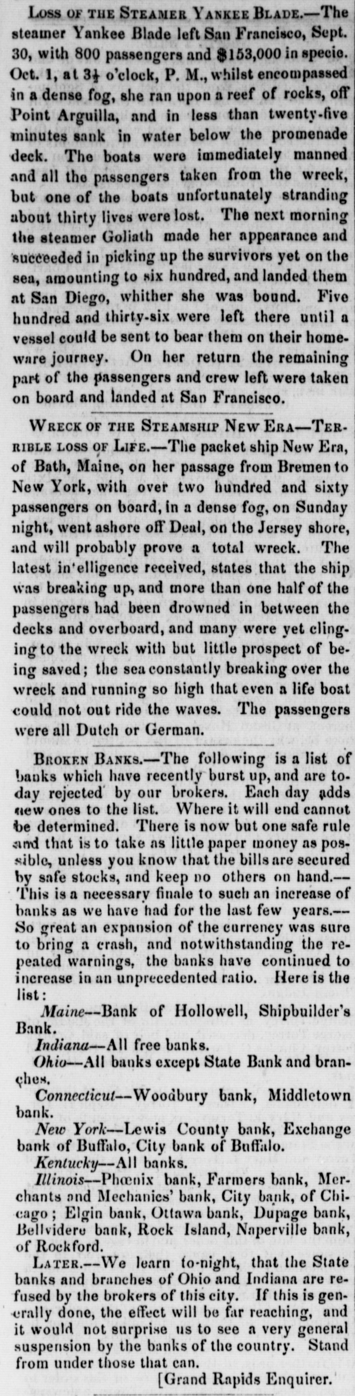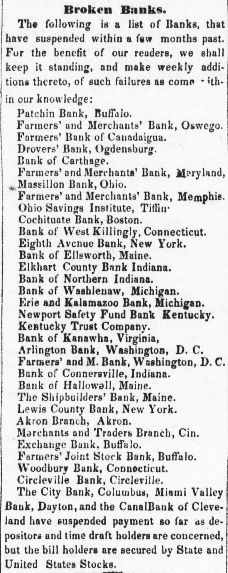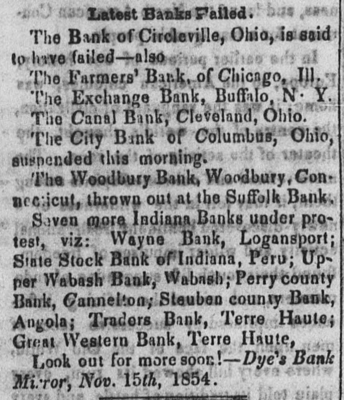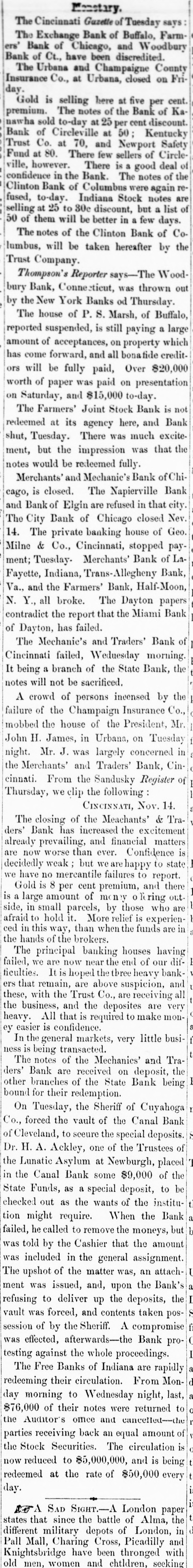 Merchants' and Mechanic's Bank of Chicago, is closed. The Napierville Bank and Bank of Elgin are refused in that city. The City Bank of Chicago closed Nev. 14. The private banking house of Geo. Milne & Co., Cincinnati, stopped payment; Tuesday Merchants' Bank of LaFayette, Indiana, Trans-Allegheny Bank, Va., and the Farmers' Bank, Half-Moon, N. Y., all broke. The Dayton papers contradict the report that the Miami Bank of Dayton, has failed.
