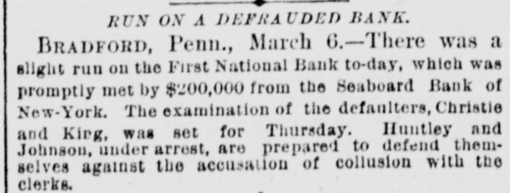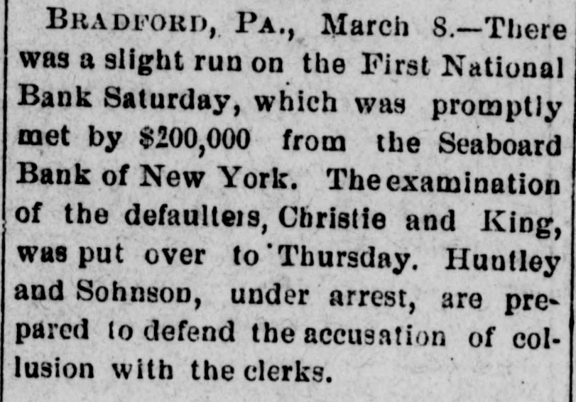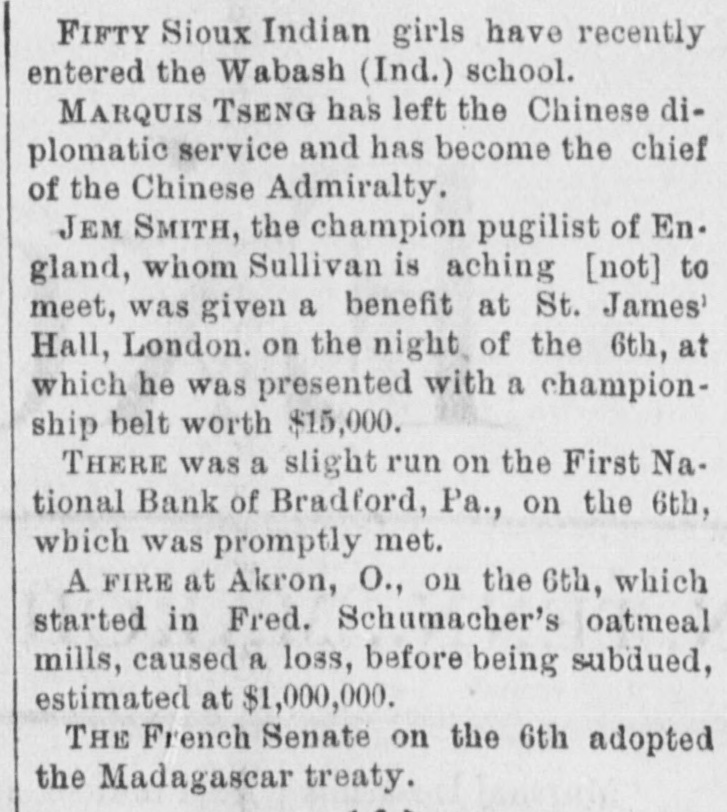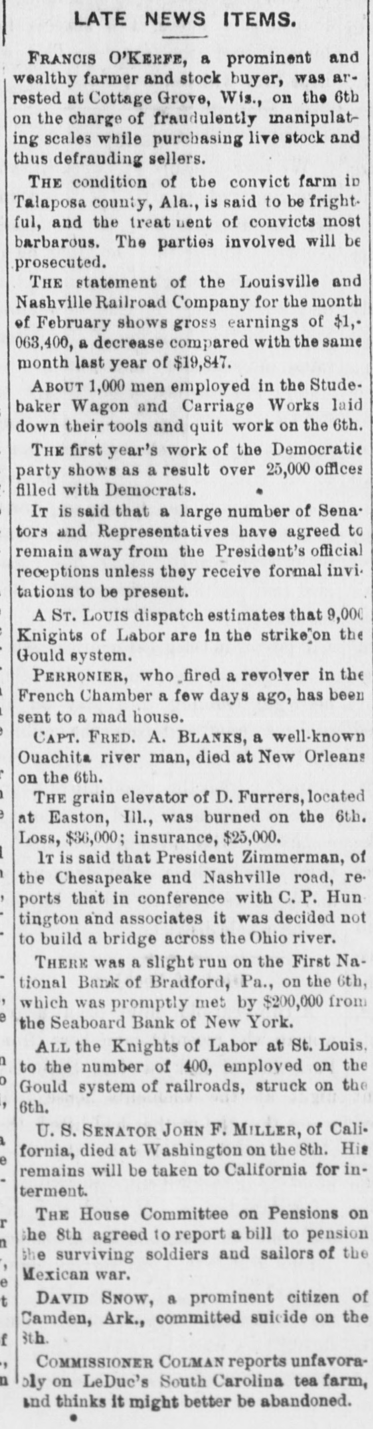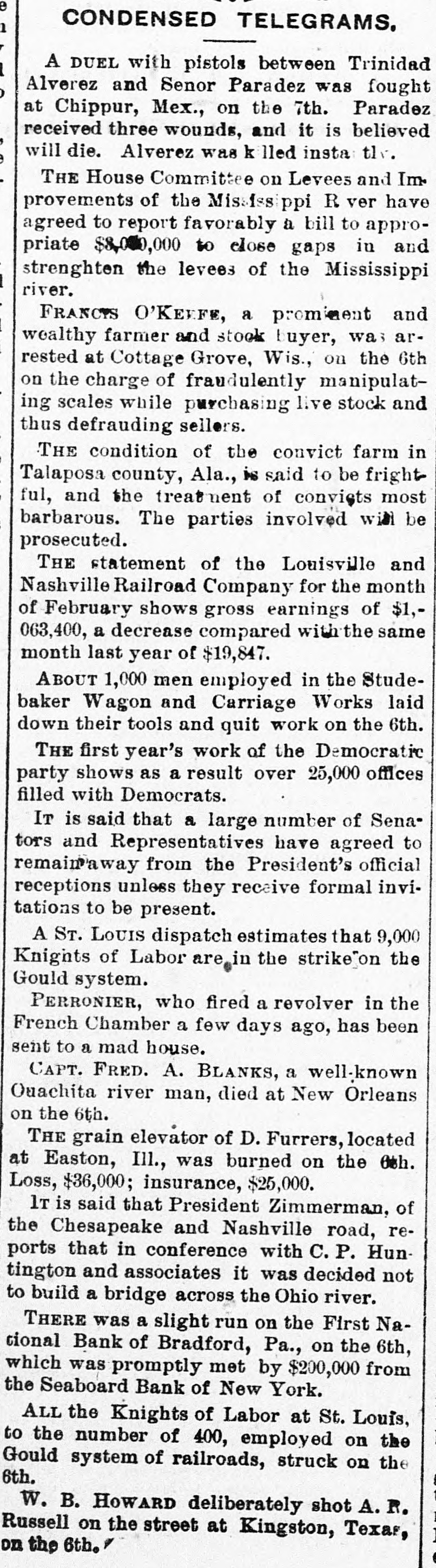 CONDENSED TELEGRAMS, A DUEL with pistols between Trinidad Alverez and Senor Paradez was fought at Chippur, Mex., on the 7th. Paradez received three wounds, and it is believed will die. Alverez was k lled insta tlv. THE House Committee on Levees and Improvements of the Mississippi R ver have agreed to report favorably a bill to appropriate $8,000,000 to close gaps in and strenghten the levees of the Mississippi river. FRANCES O'KEEFE, a prominent and wealthy farmer and stock buyer, was arrested at Cottage Grove, Wis., on the 6th on the charge of fraudulently manipulating scales while purchasing live stock and thus defrauding sellers. THE condition of the convict farm in Talaposa county, Ala., is said to be frightful, and the treatment of convicts most barbarous. The parties involved will be prosecuted. THE statement of the Louisville and Nashville Railroad Company for the month of February shows gross earnings of $1,063,400, a decrease compared with the same month last year of $19,847. ABOUT 1,000 men employed in the Studebaker Wagon and Carriage Works laid down their tools and quit work on the 6th. THE first year's work of the Democratic party shows as a result over 25,000 offices filled with Democrats. IT is said that a large number of Senators and Representatives have agreed to remain-away from the President's official receptions unless they receive formal invitations to be present. A ST. LOUIS dispatch estimates that 9,000 Knights of Labor are in the strike' on the Gould system. PERRONIER, who fired a revolver in the French Chamber a few days ago, has been sent to a mad house. CAPT. FRED. A. BLANKS, a well-known Ouachita river man, died at New Orleans on the 6th. THE grain elevator of D. Furrers, located at Easton, Ill., was burned on the 6th. Loss, $36,000; insurance, $25,000. 1T is said that President Zimmerman, of the Chesapeake and Nashville road, reports that in conference with C.P. Huntington and associates it was decided not to build a bridge across the Ohio river. THERE was a slight run on the First National Bank of Bradford, Pa., on the 6th, which was promptly met by $200,000 from the Seaboard Bank of New York. ALL the Knights of Labor at St. Louis, to the number of 400, employed on the Gould system of railroads, struck on the 6th. W. B. HOWARD deliberately shot A. R. Russell on the street at Kingston, Texas, on the 6th. .