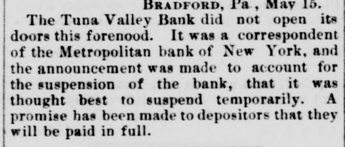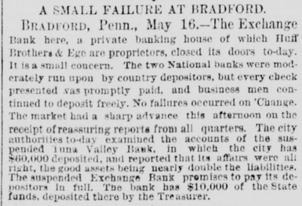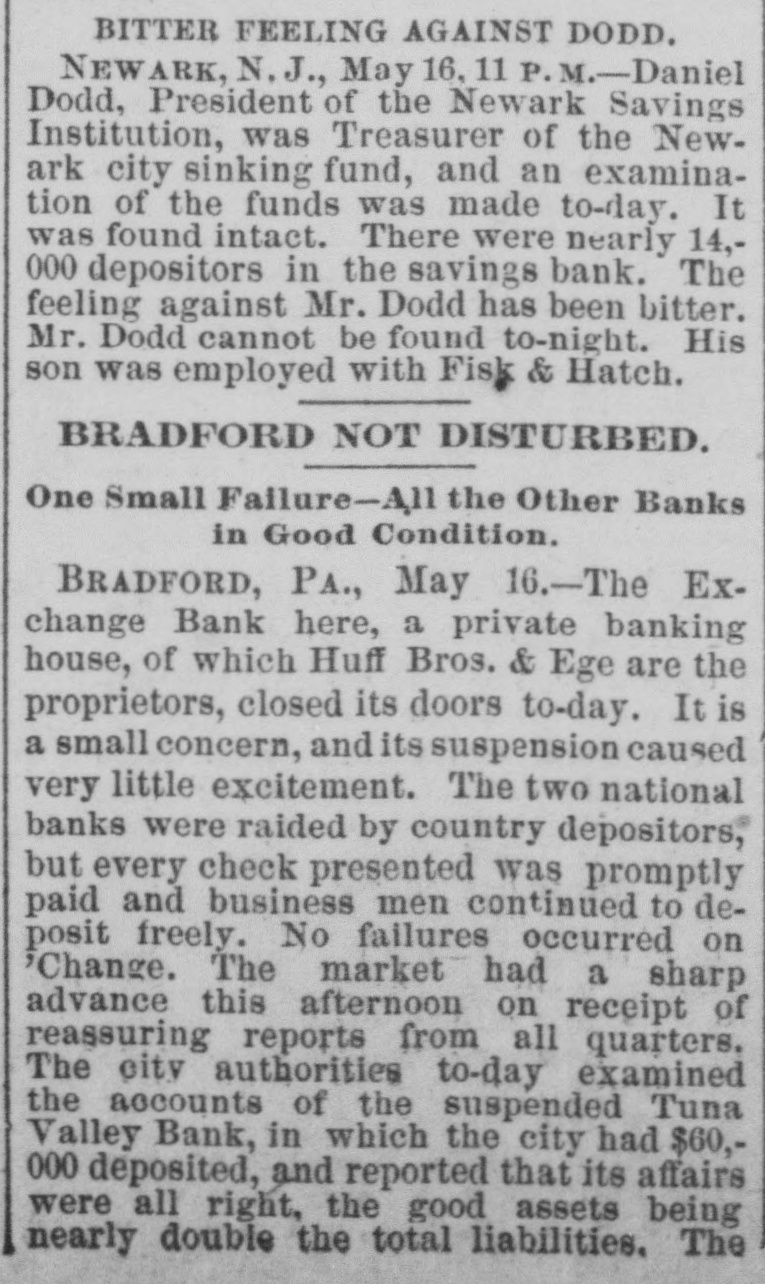 AUGUSTA, MAINE, FRIDAY MORNING, MAY 16, 1884 The deline in government bonds to 110 a in the Villiards, Oregons, and the North F THE WALL STREET STORM. 1101 for registered fours and a halfs. to 110 Pacific, and have been dealing heavily in a 1124 for cupons, to 122 asked for fours Mexican Central Union, Pacific and Atchison. registered and to 120 a 131 for cupons is due Yesterday some of their customers defaulted to the fact that holders are anxious for the their margins and this with a heavy run on cash, and are selling. Money outside of the their deposits led to the failure, which not The Worst Said to be Overstock exchange is at 6 per cent. only affects stock operations and speculations, rs. but will reach many people of small means Metropolitan Bank Paying Depositors. The Metropolitan Bank Reall over New England who have deposited 2 P. Metropolitan Bank is paywith the firm. Aft ing out to all depositors presenting checks. sumes. Quebec Unaffected by the Situation in agree Even before the hour named for resumption New York. Mond the paying teller opened the window. At I. The QUEBEC, May 15. noon the number in line was about twentyStates, from The banks here not effected by the situation five only. One lady was among the list, she Failures in ton-Stocks Still in New York. No excitement is manifested s, folpriati being attired in widow's weed. Her joy on the pr receiving money was plainable. It is stated est to Scarcely Noticeable in Liverpool. Heavily Depressed. United that the Bank of Commerce was this morning bound LIVEKPOOL, May 15. a debtor to the clearing house to the amount The effect of the New York panie is scarceThe of over one and a half millions. Money is lp noticeable on the cotton exchange. Some ably now loaning at one-fourth to one-half per what more cotton than usual is offered for By cent premium per diem. NEW YORK, May 15, 9.30, A. M. sale but not on American account. In the amend The Street Again Excited. The Metropolitan bank has posted a notice By grain trade merchants are awaiting events, on its doors saying that the bank examiners to aid and so far the impression of the panic has P. M.-The failure of Fish & Hatch have made an investigation of its affairs and tennia been slight. Provisions are selling more is announced. The clearing house has the bank will resume business at 12 o'clock On freely, principally on Chicago account, and already issued four million dollars of loan today. merchants are awaiting developments. At certificates authorized to be given to the put in rating At 10 A. M--A. W. Dymick & Co. have The Manchester a feeling of steadiness prevails, banks of the association applying therefor. adjust announced their suspension. The scene from t though operators are cautious. The opinion The suspension of A. W. Dimock & Co.. it on the street at this hour is one of unwonted pg 000,00 of both Liverpool and Manchester is that the is said, will prevent the contemplated exten. worst is over. activity. Since early morning the brokers' The sion of the bankers' and merchants' teleoffices have been open and the clerks are bill es graphic system. London Bankers' Opinions of the Panic. busy getting accounts settled up. Many of The There has been a semi-panic in oil in this LONDON, May 15. the leading firms kept their employees at and w city. The failure of Fisk & Hatch and the work until midnight and a general overhaulAn agent of the associated press this mornsuspension of Bradford Clark has created a ing of the accounts has been made so that on ing called upon the leading London bankers distrustful feeling. It is rumored that 15. the opening of the stock exchange this mornThe having important American connections. Several Heavy Capitalists Interested in oil affairs will be in a better condition than for House with a view to learning their opinions conutions Are in Trouble. whole many months past, as new margins have been cerning the panic of yesterday in Wall street. a New called for so as to prevent any rash sacrifice The feeling generelly expressed was that At 3.15 P. M. the oil was selling at 83. but priatic ucernSev of good securities. before the close it broke to 74, and is now the panic was merely a local disaster. 8. offered on the street at 72, No failures have A representative of the Associated Press They were positive that it would occasion rejecte no failure in London either inside or outside rose. has just talked with a financier of 35 years been announced, and if anybody has gone unwho experience on the street, who has been of the stock exchange. The general soundOn der it will be given out tomorrow when the Kins ness of the financial situation here is eviSenat through all the upheavals of that period. clearing is made. known denced by the fact that there have not even Without having had to succumb. he says. centen The closing of doors of the Atlantic State been rumors of large failures. The remarkthe action of the banks yesterday in deciding curred lasting Bank of Brooklyn embarrassed the depositable decline cf American securities during to pool their issues. in his opinion, decided ors, and caused a feeling of uneasiness among Adj ninent business men. President Puffer stated last past few days has attracted a new class of the situation favorably. He does not anticiyears investors into the market, who are stimulated pate any other failures either of banks or night that the bank would resume business banking firms. although he admits the possiby the cheapness of money in England. today, as the securities were all good, and t here Germany and France One prominent bankbility that some weak stock houses may sus. the suspension was caused by the effort to er said it was amazing how little real stock pend temporarily. The failure of the latter help the Metropolitan bank. There was a A. W. he does not regard as a real misfortune as the was being sold here, but he said the bear gathering of depositors this morning at the A. F. sales were immense. weeding out of