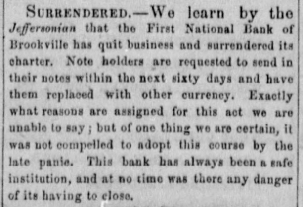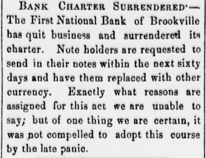 BANK CHARTER SURRENDERED The First National Bank of Brookville has quit business and surrendered its charter. Note holders are requested to send in their notes within the next sixty days and have them replaced with other currency. Exactly what reasons are assigned for this act we are unable to say; but of one thing we are certain, it was not compelled to adopt this course by the late panic.