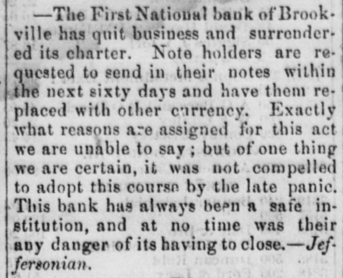 -The First National bank of Brook. ville has quit business and surrendered its charter. Note holders are requested to send in their notes within the next sixty days and have them replaced with other currency. Exactly what reasons are assigned for this act we are unable to say ; but of one thing we are certain, it was not compelled to adopt this course by the late panic. This bank has always been a safe institution, and at no time was their any danger of its having to close.-Jeffersonian.