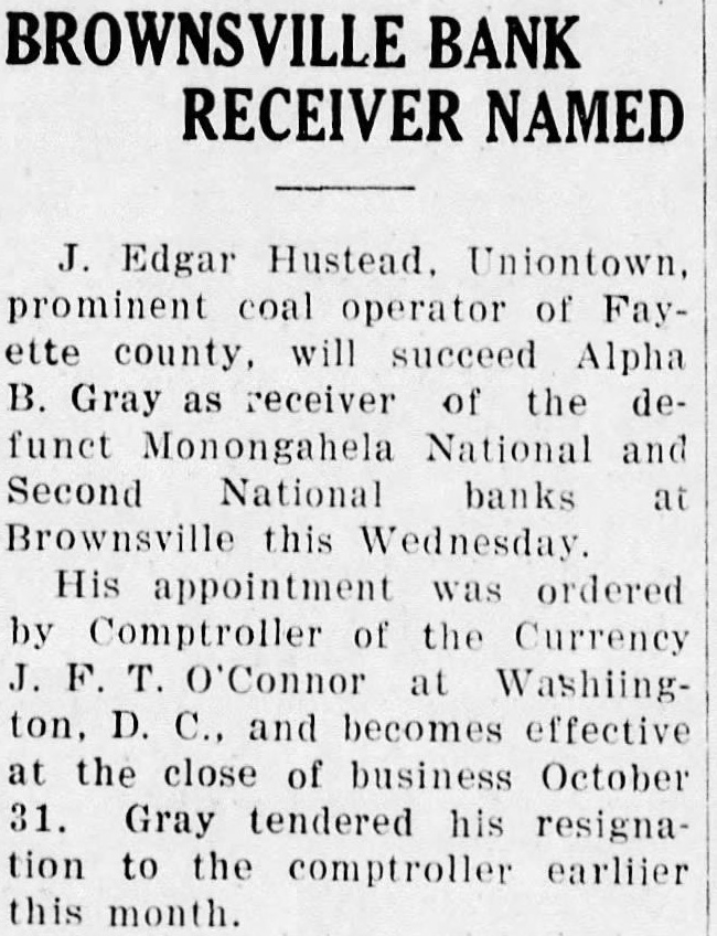 J. Edgar Hustead. Uniontown. prominent coal operator of Fayette county. will succeed Alpha B. Gray as receiver of the defunct Monongahela National and Second National banks at Brownsville this Wednesday. His appointment was ordered by Comptroller of the Currency J. F. T. Connor at Washiington, D. C., and becomes effective at the close of business October 31. Gray tendered his resignation to the comptroller earliier this month.