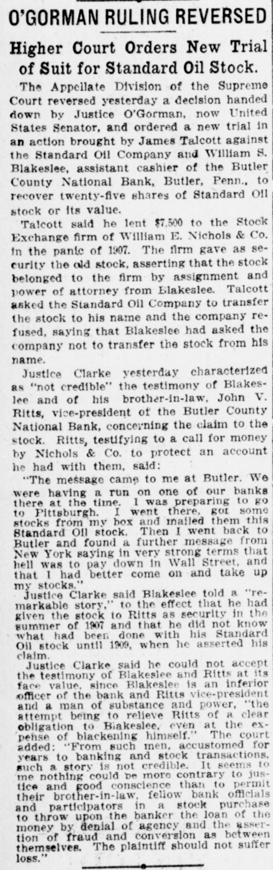 O'GORMAN RULING REVERSED Higher Court Orders New Trial of Suit for Standard Oil Stock. The Appellate Division of the Supreme Court reversed yesterday a decision handed down by Justice O'Gorman, now United States Senator, and ordered a new trial in an action brought by James Talcott against the Standard Oil Company and William S. Blakeslee, assistant cashier of the Butler County National Bank, Butler, Penn., to recover twenty-five shares of Standard Oil stock or its value. Talcott said he lent $7,500 to the Stock Exchange firm of William E. Nichols & Co. in the panic of 1907. The firm gave as security the old stock, asserting that the stock belonged to the firm by assignment and power of attorney from Blakeslee. Talcott asked the Standard Oil Company to transfer the stock to his name and the company refused, saying that Blakeslee had asked the company not to transfer the stock from his name. Justice Clarke yesterday characterized as "not credible" the testimony of Blakeslee and of his brother-in-law, John V. Ritts, vice-president of the Butler County National Bank, concerning the claim to the stock. Ritts, testifying to a call for money by Nichols & Co. to protect an account he had with them, said: "The message came to me at Butler. We were having a run on one of our banks there at the time. I was preparing to go to Pittsburgh. I went there, got some stocks from my box and mailed them this Standard Oil stock. Then I went back to Butler and found a further message from in strong New York saying very Street, terms that and hell was to pay down in Wall that I had better come on and take up my stocks." Justice Clarke said Blakeslee told a "remarkable story," to the effect that he had given the stock to Ritts as security in the that he summer of 1907 and did not know what had been done with his Standard Oil stock until 1909, when he asserted his claim. Justice Clarke said he could not accept the testimony of Blakeslee and Ritts at its face value, since Blakeslee is an inferior officer of the bank and Ritts vice-president and a man of substance and power, "the attempt being to relieve Ritts of a clear to even exobligation Biakeslee, himself." at The the court pense of blackening added: "From such men, accustomed for to banking and stock transactions, is not such years a story credible. It seems to jus- to me nothing could be more contrary tice and good conscience than to permit in a and their participators brother-in-law. fellow stock bank purchase officials to throw upon the banker the loan of the by denial of agency and the asserand as money tion of fraud conversion between themselves. The plaintiff should not suffer loss."