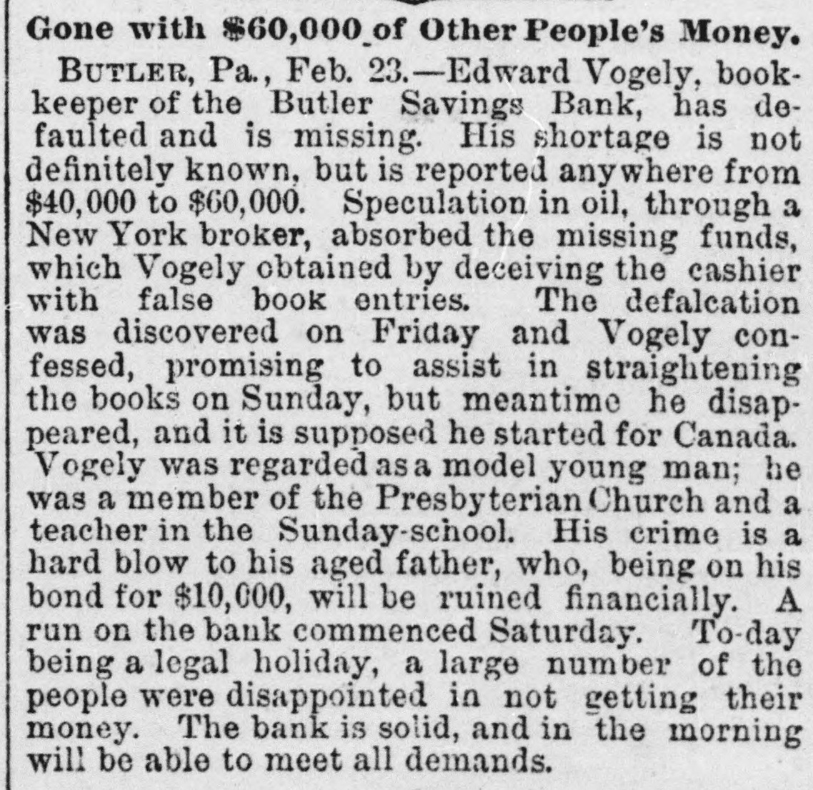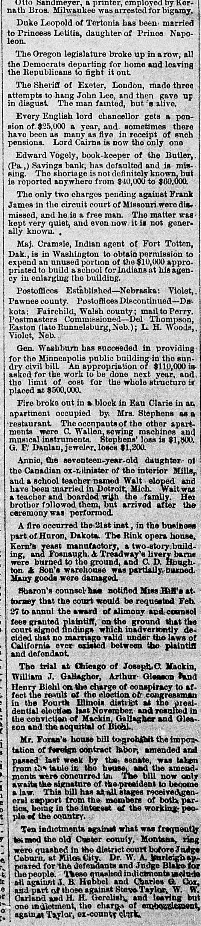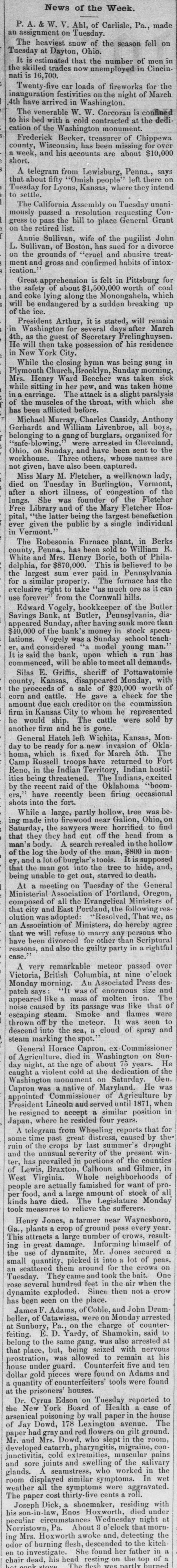 News of the Week. P.A.&W.V. Ahl, of Carlisle, Pa., made an assignment on Tuesday. The heaviest snow of the season fell on Tuesday at Dayton, Ohio. It is estimated that the number of men in the skilled trades now unemployed in Cincinnati is 16,700. Twenty-five car loads of fireworks for the inauguration festivities on the night of March 4th have arrived in Washington. The venerable W. W. Corcoran is confined to his bed with a cold contracted at the dedi cation of the Washington monument. Frederick Becker, treasurer of Chippewa county, Wisconsin, has been missing for over a week, and his accounts are about $10,000 short. A telegram from Lewisburg, Penna., says that about fifty "Omish people" left there or Tuesday for Lyons, Kansas, where they intend to settle. The California Assembly on Tuesday unanimously passed a resolution requesting Con gress to pass the bill to place General Grant on the retired list. Annie Sullivan, wife of the pugilist John L. Sullivan, of Boston, has sued for divorce on the grounds of "cruel and abusive treat ment and gross and confirmed habits of intox ication. Great apprehension is felt in Pittsburg for the safety of about $1,500,000 worth of coal and coke lying along the Monongahela, which will be endangered by a sudden breaking up of the ice. President Arthur, it is stated, will remain in Washington for several days after March 4th, as the guest of Secretary Frelinghuysen. He will then take possession of his residence in New York City. While the closing hymn was being sung in Plymouth Church, Brooklyn, Sunday morning Mrs. Henry Ward Beecher was taken sick while sitting in her pew, and was taken home in carriage. The attack is slight paralysis of the muscles of the throat, with which she has been afflicted before. Michael Murray, Charles Cassidy, Anthony Gerhardt and William Livenbroe, all boys, belonging to a gang of burglars, organized for "safe-blowing, were arrested in Cleveland. Ohio, on Sunday, and have been sent to the workhouse. Three others, whose names are not given, have also been captured. Miss Mary M. Fletcher, a wellknown lady, died on Tuesday in Burlington, Vermont, after a short illness, of congestion of the lungs. She was founder of the Fletcher Free Library and of the Mary Fletcher Hospital, "the latter being the largest benefaction ever given the public by a single individual in Vermont. The Robesonia Furnace plant, in Berks county, Penna., has been sold to William R. White and Mrs. Henry Borie, both of Philadelphia, for $870,000. This is believed to be the largest sum ever paid in Pennsylvania for a similar property. The furnace has the exclusive right to take "as much ore as it can use forever' from the Cornwall hills. Edward Vogely, bookkeeper of the Butler Savings Bank, at Butler, Pennsylvania, disappeared Sunday, after having sunk more than $40,000 of the bank money in stock speculations. Vogely was a Sunday school teach er, and considered model young man. It is said the bank, upon which a run has commenced, will be able to meet all demands. Silas E. Griffis, sheriff of Pottawatomie county, Kansas, disappeared Monday, with the proceeds of a sale of $20,000 worth of corn and cattle. He gave a check for the amount due each creditor on the commission firm in Kansas City to whom he represented he would ship. The cattle were sold by another firm and he is gone. General Hatch left Wichita, Kansas, Monday to be ready for a new invasion of Oklahoma, which is fixed for March 5th. The Camp Russell troops have returned to Fort Reno, in the Indian Territory, Indian hostilities being threatened. The Indians, excited by the recent raid of the Oklahoma "boomers, have recently been firing occasional shots into the fort. While a large, partly hollow, tree was being made into firewood near Galion, Ohio, on Saturday, the sawyers were horrified to find that they they had cut off the head from a man's body. A search revealed in the hollow of the log the body of the man, $800 in money, and a lot of burglar's tools. It supposed that the man got into the tree to hide, and, being unable to get out, starved to death. At a meeting on Tuesday of the General Ministerial Association of Portland, Oregon, composed of all the Evangelical Ministers of that city and East Portland, the following resolution was adopted: Resolved, That we, as an Association of Ministers, do hereby agree that we will refuse to marry any persons who have been divorced for other than Scriptural reasons, and also the guilty party in a rightful case." A very remarkable meteor passed over Victoria, British Columbia, at nine 0 clock Monday morning. An Associated Press despatch says: "It was of enormous size and appeared like a mass of molten iron. The noise caused by its passage was like that of escaping steam. Smoke and flames were thrown off by the meteor. It was seen to descend into the sea, a cloud of spray and steam marking the spot. General Horace Capron, ex Commissioner of Agriculture, died in Washington on Sunday night, at the age of about 75 years. He caught a violent cold at the dedication of the Washington monument on Saturday. Gen. Capron was native of Maryland. He was appointed Commissioner of Agriculture by President Lineola and served until 1871, when he resigned to accept a similar position in Japan, where he resided four years. A telegram from Wheeling reports that for some time past great distress, caused by the ruin of the crops by last summer's drought and the unusual severity of the present winter, has prevailed in portions of the counties of Lewis, Braxton, Calhoun and Gilmer, in West Virginia. Whole neighborhoods of people are actually famished for want of proper food, and large amount of stock of all kinds have died. The Legislature Monday took measures to relieve the sufferers. Henry Jones, a farmer near Waynesboro, Ga., plants a crop of ground peas every year. This attracts a large number of crows, result ing in great damage. Informing himself of the use of dynamite, Mr. Jo