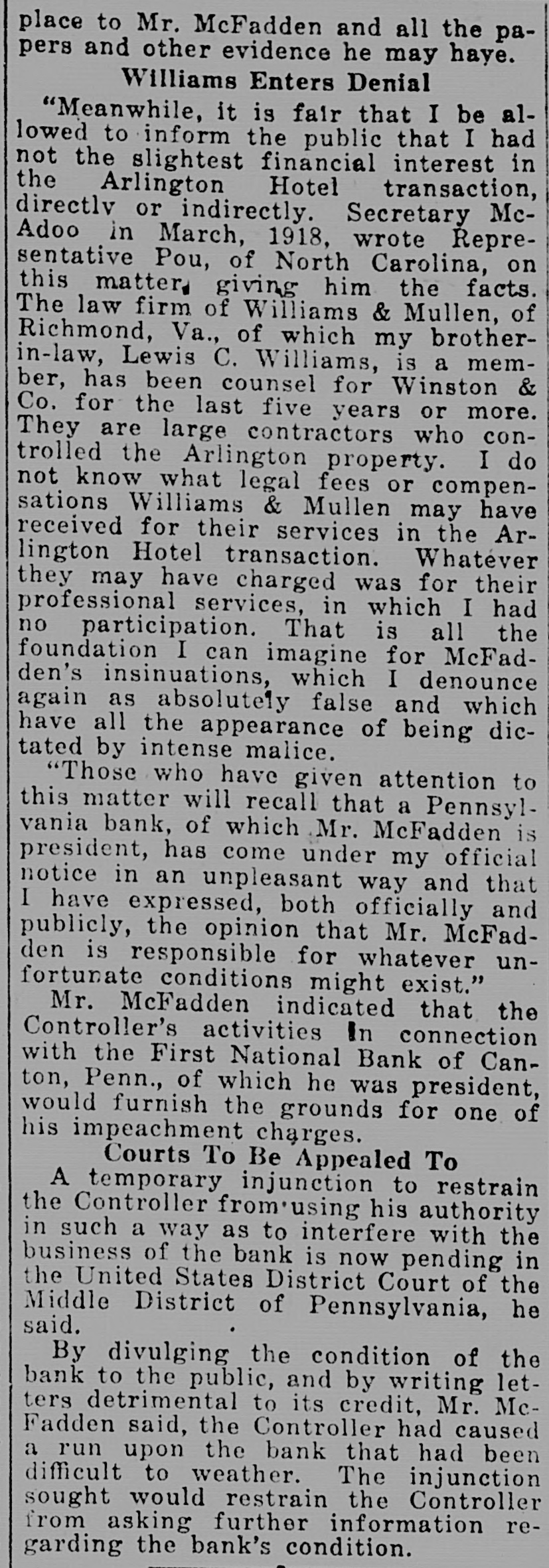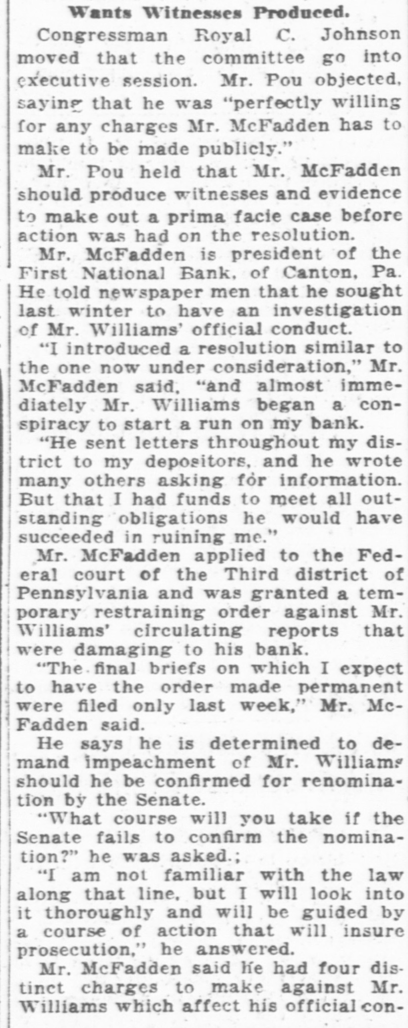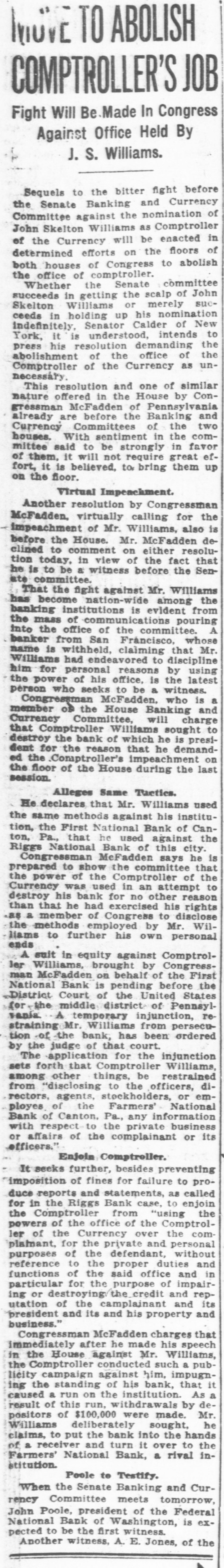 MOVE TO ABOLISH COMPTROLLER'S JOB Fight Will Be Made In Congress Against Office Held By J. S. Williams. Sequels to the bitter fight before the Senate Banking and Currency Committee against the nomination of John Skelton Williams as Comptroller of the Currency will be enacted in determined efforts on the floors of both houses of Congress to abolish the office of comptroller. Whether the Senate committee succeeds in getting the scalp of John Skelton Williams or merely succeeds in holding up his nomination indefinitely, Senator Calder of New York, it is understood, intends to press his resolution demanding the abolishment of the office of the Comptroller of the Currency as unnecessáry. This resolution and one of similar nature offered in the House by Congressman McFadden of Pennsylvania already are before the Banking and Currency Committees of the two houses. With sentiment in the committee said to be strongly in favor of them, it will not require great effort, it is believed, to, bring them up on the fioor. Virtual Impeachment. Another resolution by Congressman McFadden, virtually calling for the impeachment of Mr. Williams, also is before the House. Mr. McFadden declined to comment on either resolution today, in view of the fact that he is to be a witness before the Senate committee. That the fight against Mr. Williams has become nation-wide among the banking institutions is evident from the mass of communications pouring into the office of the committee. A banker from San Fráncisco, whose name is withheld, claiming that Mr. Williams had endeavored to discipline him for personal reasons by using the power of his office, is the latest person who seeks to be & witness. Congressman McFadden. who is a member on the House Banking and Currency Committee, will charge that Comptroller Williams sought to destroy the bank of which he is president for the reason that he demanded the Comptroller's impeachment on the floor of the House during the last session. Alleges Same Tactics. He declares that Mr. Williams used the same methods against his institution, the First National Bank of Canton, Pa., that he used against the Riggs National Bank of this city. Congressman MeFadden says he is prepared to show the committee that the power of the Comptroller of the Currency was used in an attempt to destroy his bank for no other reason than that he had exercised his rights as a member of Congress to disclose the methods employed by Mr. Williams to further his own personal ends A suit in equity against Comptroller Williams, brought by Congressman McFadden on behalf of the First National Bank is pending before the District Court of the United States for the middle district of Pennsylvania A temporary injunction, restraining Mr. Williams from persecution of the bank, has been ordered by the judge of that court. The application for the injunction sets forth that Comptroller Williams, among other things, be restrained from "disclosing to the officers, directors, agents, stockholders, or employes of the Farmers' National Bank of Canton, Pa., any information with respect to the private business or affairs of the complainant or its officers." Enjoin Comptroller. It seeks further, besides preventing imposition of fines for failure to produce reports and statements, as called for in the Riggs Bank case, to enjoin the Comptroller from "using the powers of the office of the Comptroller of the Currency over the complainant, for the private and personal purposes of the defendant, without reference to the proper duties and functions of the said office and in particular for the purpose of impairing or destroying the credit and reputation of the camplainant and its president and its and his property and business." Congressman McFadden charges that immediately after he made his speech in the House against Mr. Williams, the Comptroller conducted such a publicity campaign against him, impugning the standing of his bank, that it caused a run on the institution. As a result of this run, withdrawals by depositors of $100,000 were made. Mr. Williams deliberately sought, he claims, to put the bank into the hands of a receiver and turn it over to the Farmers' National Bank, a rival institution. Poole to Testify. When the Senate Banking and Currency Committee meets tomorrow, John Poole, president of the Federal National Bank of Washington, is expected to be the first witness. Another witness, A. E. Jones, of the