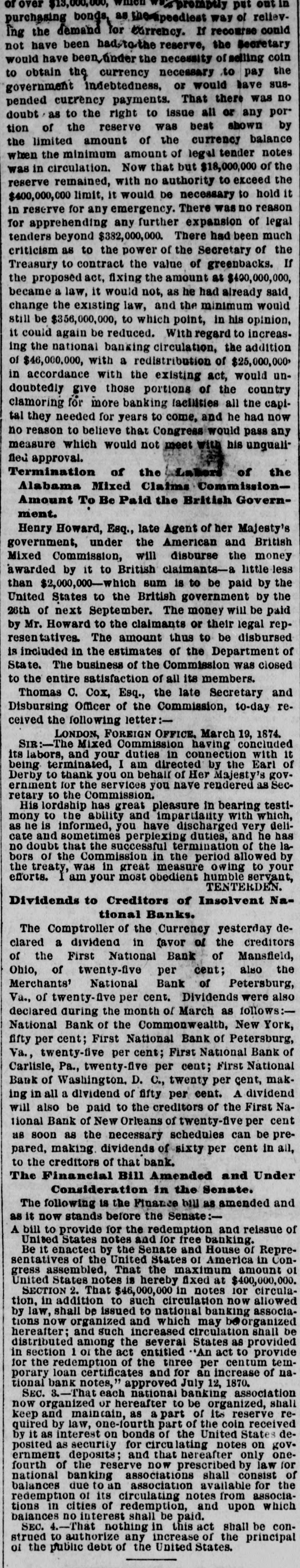 or over $13,000,000, "Prompty put out in purchasing bonds, as incupeediest way of relieving the demand for currency. If recomrse could not have been had-to-the reserve, the Secretary would have been, ander the necessity of selling coin to obtain the currency necessary to pay the government indebtedness, or would have suspended currency payments. That there was no doubt as to the right to issue all or any portion of the reserve was best shown by the limited amount of the currency balance when the minimum amount of legal tender notes was in circulation. Now that but $18,000,000 of the reserve remained, with no authority to exceed the $400,000,000 limit, it would be necessary to hold it in reserve for any emergency. There was no reason for apprehending any further expansion of legal tenders beyond $332,000,000. There had been much criticism as to the power of the Secretary of the Treasury to contract the value of greenbacks. If the proposed act, fixing the amount at $400,000,000, became a law, it would not, as he had already said change the existing law, and the minimum would still be $356,000,000, to which point, in his opinion, it could again be reduced. With regard to increasing the national banking circulation, the addition of $46,000,000, with a redistribution of $25,000,000 in accordance with the existing act, would undoubtedly give those portions of the country clamoring for more banking facilities all the capital they needed for years to come, and he had now no reason to believe that Congress would pass any measure which would not meet with his ungualifled approval. Termination of the Labore of the Alabama Mixed Claims CommissionAmount To Be Paid the British Government. Henry Howard, Esq., late Agent of her Majesty's government, under the American and British Mixed Commission, will disburse the money awarded by it to British claimants-a little less than $2,000,000-which sum is to be paid by the United States to the British government by the 26th of next September. The money will be paid by Mr. Howard to the claimants or their legal representatives. The amount thus to be disbursed is included in the estimates of the Department of State. The business of the Commission was closed to the entire satisfaction of all its members. Thomas C. Cox, Esq., the late Secretary and Disbursing Officer of the Commission, to-day received the following letter:LONDON, FOREIGN OFFICE. March 19, 1874. SIR:-The Mixed Commission having concluded its labors, and your duties in connection with it being terminated, I am directed by the Earl of Derby to thank you on behalf of Her Majesty's government for the services you have rendered as Secretary to the Commission. His lordship has great pleasure in bearing testimony to the ability and impartiality with which, as he is informed, you have discharged very delicate and sometimes perplexing duties, and he has no doubt that the successful termination of the labors of the Commission in the period allowed by the treaty, was in great measure owing to your efforts. I am your most obedient humble servant, TENTERDEN. Dividends to Creditors of Insolvent National Banks. The Comptroller of the Currency yesterday declared a dividend in favor of the creditors of the First National Bank of Mansfield, Ohio, of twenty-five per cent; also the Merchants' National Bank of Petersburg, Va., of twenty-five per cent. Dividends were also declared during the month of March as follows:National Bank of the Commonwealth, New York, fifty per cent; First National Bank of Petersburg, Va., twenty-five per cent; First National Bank of Carlisle, Pa., twenty-five per cent; First National Bank of Washington. D. c., twenty per cent, making in all a dividend of fifty per cent. A dividend will also be paid to the creditors of the First National Bank of New Orleans of twenty-five per cent as soon as the necessary schedules can be prepared, making dividends of sixty per cent in all, to the creditors of that bank. The Financial Bill Amended and Under Consideration in the Senate. The following is the Finance bill as amended and as it now stands before the Senate:A bill to provide for the redemption and reissue of United States notes and for free banking. Be it enacted by the Senate and House of Representatives of the United States of America in Congress assembled, That the maximum amount 01 United States notes is hereby fixed at $400,000,000. SECTION 2. That $46,000,000 in notes for circulation, in addition to such circulation now allowed by law, shall be issued to national banking associations now organized and which may beorganized hereafter; and such increased circulation shall be distributed among the several States as provided in section 1 or the act entitled "An act to provide for the redemption of the three per centum temporary loan certificates and for an increase of national bank notes," approved July 12, 1870. SEC. 3.-That each national banking association now organized or hereafter to be organized, shall keep and maincain, as a part of Its reserve required by law, one-fourth part of the coin received by it as interest on bonds of the United States deposited as security for circulating notes on gov. ernment deposits; and that nereafter only onefourth of the reserve now prescribed by law for national banking associations shall consist of balances due to an association available for the redemption of its circulating notes from associations in cities of redemption, and upon which balances no interest shall be paid. SEC. 4.-That nothing in this act shall be construed to authorize any increase of the principal of the public debt of the United States.