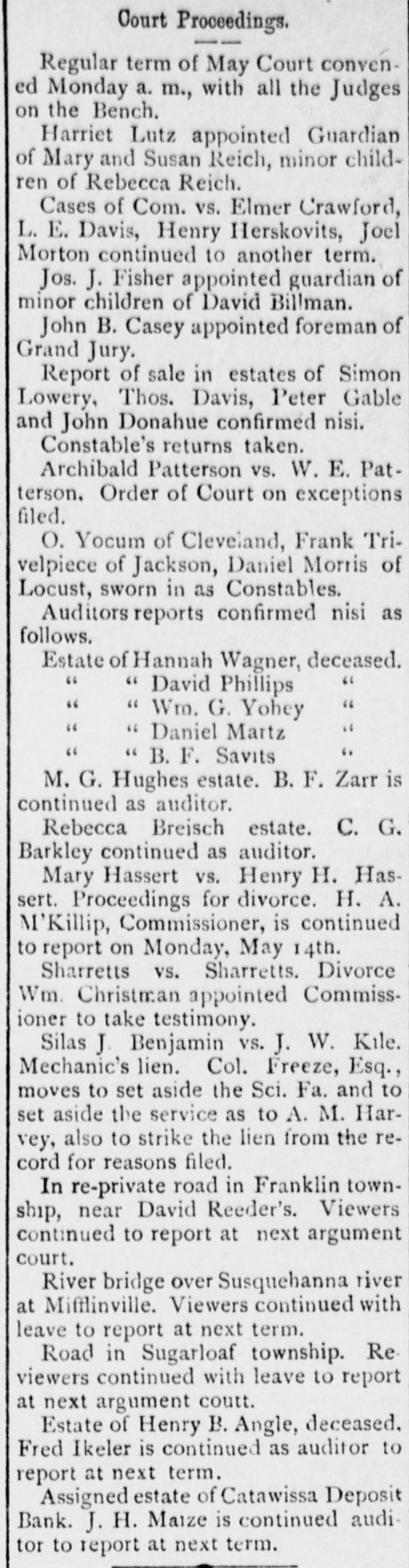 Court Proceedings. Regular term of May Court convened Monday a. m., with all the Judges on the Bench. Harriet Lutz appointed Guardian of Mary and Susan Reich, minor children of Rebecca Reich. Cases of Com. vs. Elmer Crawford, L. E. Davis, Henry Herskovits, Joel Morton continued to another term. Jos. J. Fisher appointed guardian of minor children of David Billman. John B. Casey appointed foreman of Grand Jury. Report of sale in estates of Simon Lowery, Thos. Davis, Peter Gable and John Donahue confirmed nisi. Constable's returns taken. Archibald Patterson vs. W. E. Patterson. Order of Court on exceptions filed. O. Yocum of Cleveland, Frank Trivelpiece of Jackson, Daniel Morris of Locust, sworn in as Constables. Auditors reports confirmed nisi as follows. Estate of Hannah Wagner, deceased. " " " David Phillips " " " Wm. G. Yohey " " " Daniel Martz " " " B.F. Savits M. G. Hughes estate. B. F. Zarr is continued as auditor. Rebecca Breisch estate. C. G. Barkley continued as auditor. Mary Hassert vs. Henry H. Hassert. Proceedings for divorce. H. A. 'Killip, Commissioner, is continued to report on Monday, May 14th. Sharretts vs. Sharretts. Divorce Wm. Christman appointed Commissioner to take testimony. Silas J. Benjamin vs. J. W. Kile. Mechanic's lien. Col. Freeze, Esq., moves to set aside the Sci. Fa. and to set aside the service as to A. M. Harvey, also to strike the lien from the record for reasons filed. In re-private road in Franklin township, near David Reeder's. Viewers continued to report at next argument court. River bridge over Susquehanna river at Mifflinville. Viewers continued with leave to report at next term. Road in Sugarloaf township. Reviewers continued with leave to report at next argument coutt. Estate of Henry B. Angle, deceased. Fred Ikeler is continued as auditor to report at next term. Assigned estate of Catawissa Deposit Bank. J. H. Maize is continued auditor to report at next term.