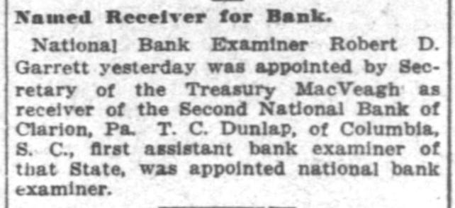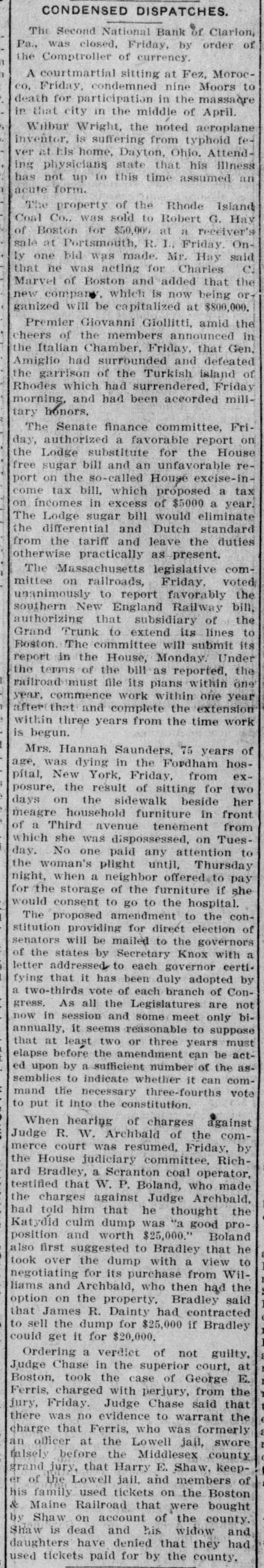 Condensed Telegrams The Second National Bank of Clarion, Pa., was closed yesterday by order of the comptroller of currency The Department of Justice probably will soon begin an investigation to find whether there is another leather trust. Colonel E. G. Logan, former editor In chief of the Louisville Times, died in a Baltimore hospital after an operation, A Washington Banker and Broker has $20,000 to bet that Roosevelt carries Ohio over President Taft at the primaries, Chauncey Ball, a Veteran of the Mexican war, died at his home at Derby, Conn., last night, in the 81st year of his age Of the 15,000,000 Bushels of bonded Canadian grain handled by the elevators In Duluth, there are only 3,000,000 bushels left, The Regular Quarterly Dvidend of 2 per cent. was declared by the New York, New Haven and Hartford rail road yesterday, The Will of the Late Prof. D. Cady Eaton of Yale was filed for probate yesterday. The entire estate, valued at about $100,000, is left to the widow. Marquis Robrto has invented a new which is safe, as it will inasmuch explosive Imperiall not absolutely explode without a fulminating cap of mercury During a Performance in a Theater in Gitschin Bohemia, an actress named Ruda shot and instantly killed an actor named Wreba and then committed suicide. One Woman Was Burned to Death and another is dying as a result of a tenements house fire in Somerville, Mass., caused by the overturning of a kerosene lamp. J. S. Heany, Cashier of the First National bank of Bridgeville, Pa., left satche) containing $3,500 in a smoking car. The bag*was found and returned by a baggage master. In the Superior Court at Hartford yesterday Judge Curtis issued an order appointing Norris S. Lippitt and Fred P. Holt receivers of the Windsor Locks Savings bank A Quarterly Dividend of $10 a Share was declared yesterday by the directors of the Calumet and Hecla Copper company. The dividend three months ago was $8 and a year ago $6. About a Score of Continental Gypsies left England for South American where they hope to find a camp where they will not be bothered by sanitary authorities and town councils. Controller Prendergast, who has been stumping for Roosevelt in Ohio, returned to New York. Prendergast was picked by the colonel to present the Roosevelt name to the convention. Severe Calling of Margins yesterday resulted in a drop of more than two cents a bushel from the price of wheat This meant a fall of more than nine cents-from the high figures which recently prevailed. Jerry Jacket, a 13 Year Old Newsboy of Oakland, Cal. found a hand bag containing jewels valued at $1,500. He took the bag to the police, and, fearing arrest for having the valuables in his possession, he fled. In the Tryouts at Winthrop, Md., for a rifle team to represent the United States at Stockholm, Sweden, Captain C. L. Burdette of the West Virginia militla made the remarkable score of 294 out of a possible 300. Alessandro Bonoi Filed Suit against the New York Central and the Pullman company for $50.000 damages. Bonci alleges that on January 17 last the heat. in a drawing room was turned of and he contracted a cold. Mrs. Ray Spiro Was Cured of lock in jaw in the Har Moriah hospital New York by the injection of antitoxin into her spine. The operation was a daring one, as the woman is 6. years old. The Property of the Rhode Island Coal company was sold to Robert G i Hay of Boston for $50,000 at a receiv ers' sale at Portsmouth, R. I., yester n day. Mr. Hay was acting for Charle C. Marvel of Boston. About 110,000,000 Gallons of Wate daily will be allowed to run to wast a from the great reservoir of the Metro politan water commission at Clinton Mass., for a few days, the basin being full for the first time in four years. 0 During the First Five Weeks all per sons who went to the Episcopal church of SS. Peter and Paul in Chicago wer handed a list of questions in regar to their physical condition. Up to date only two couples out of a score hav returned to be married. it Dr. Lesage of Paris was awarded firs e prize of $3,000 in the exhibition befor 1 the ninth International Red Cross con ference, in Washington, for appliance r designed to lessen sufferings of wound ed soldiers. The winning exhibit wa huge automobile for X-ray field ser in vice. r. Mrs. Hannah Saunders. 75 years old it is dying in the Fordham hospital, New le York from exposure, the result of sit ting for two days on the sidewalk be I side her meagre household furniture it front of a Third avenue tenement from which she was dispossessed or t Tuesday. H Is Name
