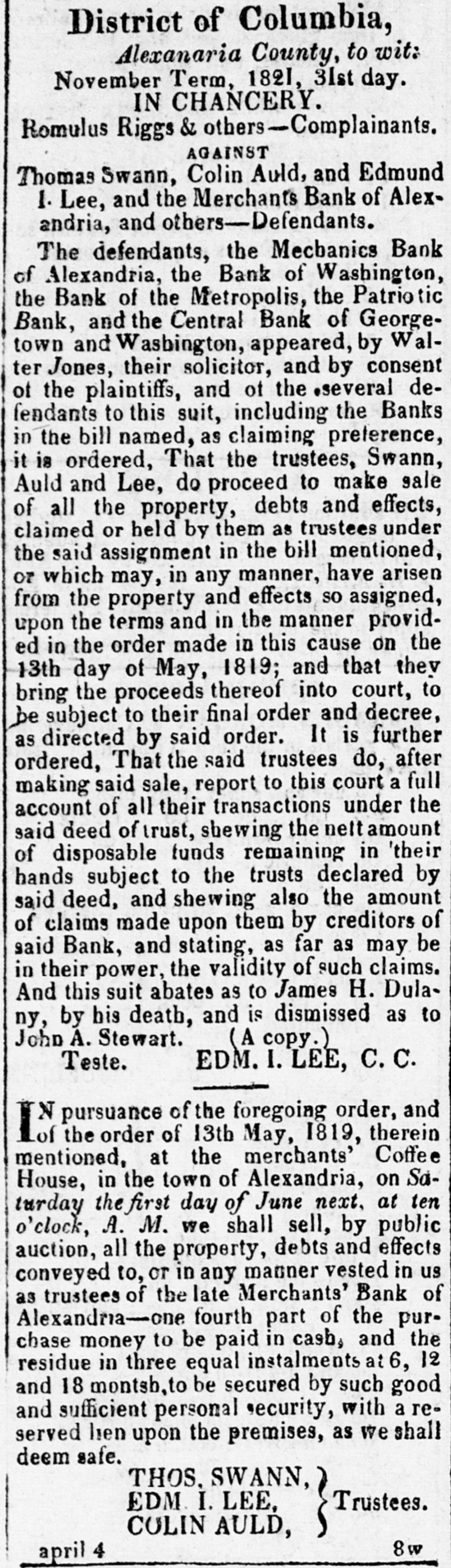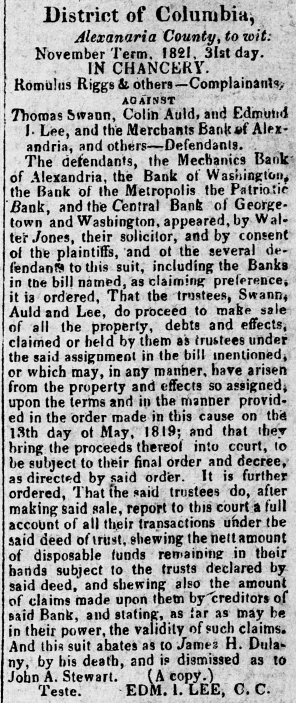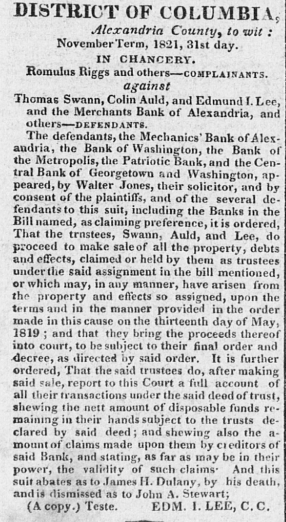 DISTRICT OF COLUMBIA, Alexandria County, to wit : November Term, 1821, 31st day. IN CHANCERY. Romulus Riggs and others—COMPLAINANTS. against Thomas Swann, Colin Auld, and Edmund I. Lee, and the Merchants Bank of Alexandria, and others—DEFENDANTS. The defendants, the Mechanics' Bank of Alexandria, the Bank of Washington, the Bank of the Metropolis, the Patriotic Bank, and the Central Bank of Georgetown and Washington, appeared, by Walter Jones, their solicitor, and by consent of the plaintiffs, and of the several defendants to this suit, including the Banks in the Bill named, as claiming preference, it is ordered, That the trustees, Swann, Auld, and Lee, do proceed to make sale of all the property, debts and effects, claimed or held by them as trustees under the said assignment in the bill mentioned, or which may, in any manner, have arisen from the property and effects so assigned, upon the terms and in the manner provided in the order made in this cause on the thirteenth day of May, 1819; and that they bring the proceeds thereof into court, to be subject to their final order and decree, as directed by said order. It is further ordered, That the said trustees do, after making said sale, report to this Court a full account of all their transactions under the said deed of trust, shewing the nett amount of disposable funds remaining in their hands subject to the trusts declared by said deed; and shewing also the amount of claims made upon them by creditors of said Bank, and stating, as far as may be in their power, the validity of such claims. And this suit abates as to James H. Dulany, by his death, and is dismissed as to John A. Stewart; (A copy.) Teste. EDM. I. LEE, C. C.