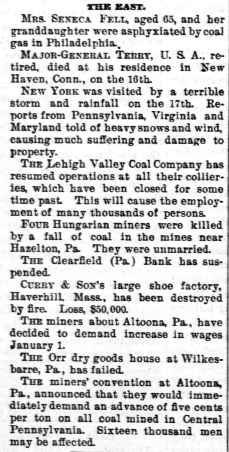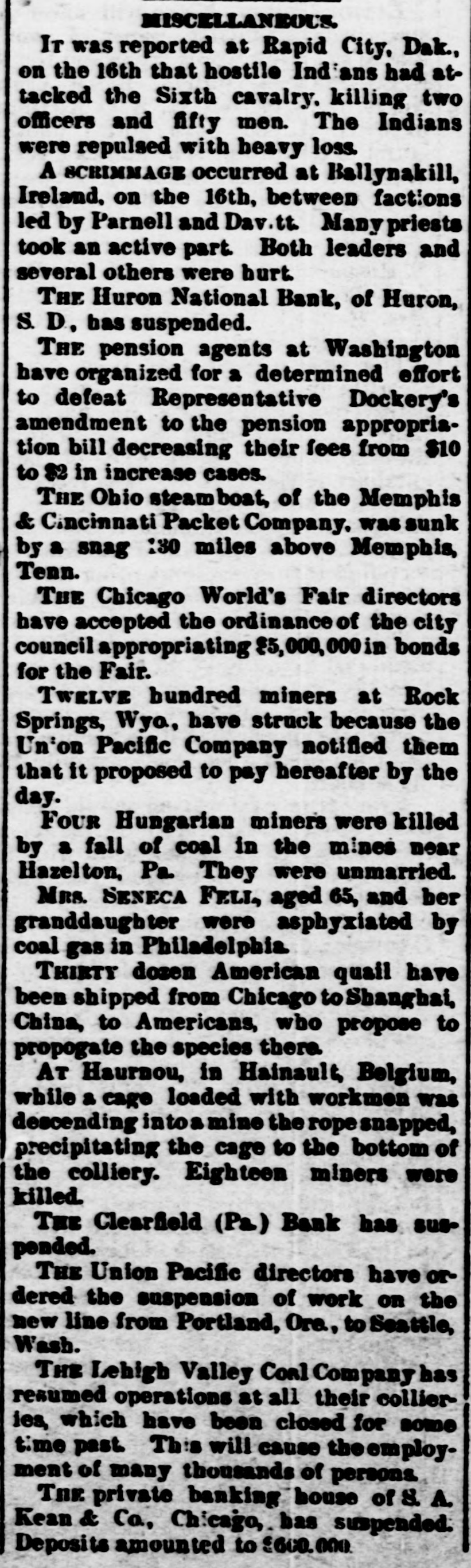 sisting of clearing the route for gradin has been begun at the western end, FIVE-SIXTHS of the cabmen of Vien: are on a strike. THE ratifications of the Behring S arbitration agreement were exchange between the governments of Englar and the United States. THE crop failure fiend has begun 1 work for the season. A report com from San Francisco that the rece frosts have reduced the grape crop nea ly one-half. NEW YORK'S Actors' Fund Fair, Madison Square Garden, was one of tl biggest undertakings of the kind f years, and closed on the 7th with es mated receipts of $175,000. THE United States grand jury at Pit burg found indictments against Willia H. Dill, president of the Clearfield Ban for embezzlement in connection wi the collapse of the bank. A HICKORY clubcovered with gore, ai the body of a man dead from a fracture skull, were found in a St. Paul freig car when it reached Chicago. There no clue to the identity of either. TI man was about 30 years old. THE post-office at White Plains, N. y was robbed of stamps, cash and regi tered letters to an unknown value I burglars who blew open the safe. THEEE big fights will take place New Orleans on three successive da in September. Fitzsimmons an Pritchard will scrap on the 5th, M Auliffe and Myer on the 6th, and Sull van and Corbett on the 7th. THE latest English railway sensati has "stoped out." A dressmaker N found beside the track in a disorga ized condition, and told a story of ha ing been outraged in a closed compai ment and thrown out the window by : unknown man. After stirring up tl civilized world with her narrative sl has changed her mind and decided th there was no outrage, and that the tur ble from the, train was entirely volu tary on her part. ICEMAN PALRICK O'SULLIVAN, whos name is familiar through his connecti with the Cronin murder case at Chic go, died at Joliet penitentiary on t. 5th inst. WITH a revolver did the head of t] banking Louse of Hammerstein, Be lin, blow out his brains. HALSTEAD WATROUS, of New Yor used a razor to bring to a violent er his career as a broker. AT Little Rock, Ark., on the 6th, ts colored men expiated the crime murder in the legal form. PROF. AUGUST WILHELM HOFFMAN, tl distinguished German chemist, is dea THE price of salt is now down to cents a barrel at Chicago, as the rest of a recent cut. PRESIDENT ADAMS, of Cornell Unive sity, has resigned. The cause assigne is "seemingly irreconcilable differenc of opinion regarding matters of admi istration." LANCASTOR COUNTY, Pa., had a jost with a small earthquake on the mornit of the 6th inst. AT Barre, Vt., 1,000 stone cutters we on a strike on the 5th inst. ST. MICHAEL'S Roman Cathol Church, New York, is not as handson as it was. Fire on the 5th injured tl building to the extent of $50,000. Two lumbermen got on a South Sho & Atlantic train, and refused to put 1 for the ride. Near Michigamme, Micl Conductor Gibson ejected them, who they began to shoot. A brass butte deflected one of the bullets, saving tl conductor's life, and he returned t compliment, tied the men up with rope, and turaed them over to the a thorities. CHINESE government circles are : torn up over the anti-foreign agitatio and have ordered the arrest of Tao Chouhan, the leading spirit. The vio roy of Wuchaug, province of Hoop-1 is charged with the duty of rounding the obnoxious individual. A CHICAGO saloonkeeper named Jol Hoppe was found dead in his place business, on Canalport Avenue. I big b