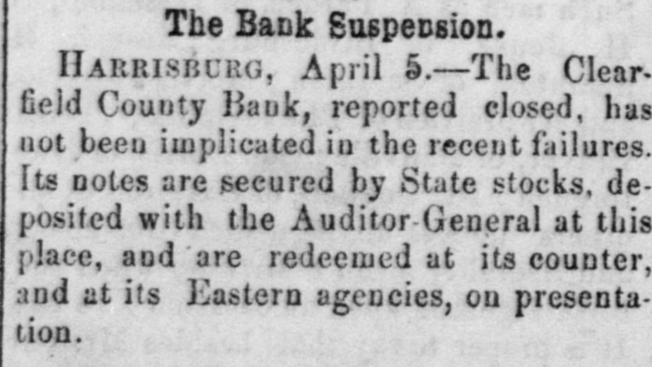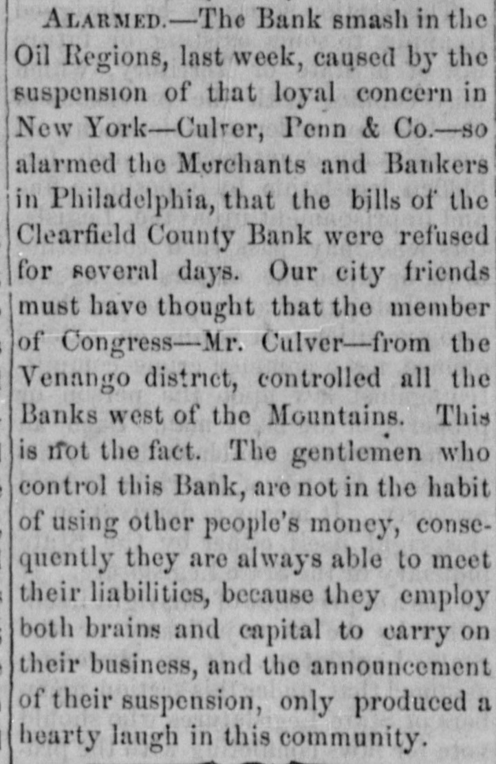 A Bank Panic, Considerable excitement has been creat ed in business circles during the past few weeks by a report that the notes of a number of Banks had been thrown out by the Banks of Philadelphia. The following were placed ou the rejected list, and were for a short time discredited : Crawford County Bank, Meadville. Oil City Bank, Oil City, Pa. Venango Bank, Franklin, Pa. Petroleum Bank, Titusville, Pa. Tioga County Bank, Tioga, Pa. Lawrence Co. Bank Newcastle, Pa. Clearfield County Bank,Clearfield, Pa. Kittanning Bank, Kittanning, Pa. Octorara Bank, Oxford, Pa. Diamond State Bank, Seaford, Del. First National Bank, Titusville. Pa The suspension of the Banking House of Culver, Penn & Co., at New York, is given as the cause of the discredit of the Banks in the Oil Region. The Panic, has however, in a great measure subsided. The notes of the following discredited Banks are again current : Kittanning Bank, Kittanting. Octorara Bank, Oxford Chester co. Clearfield County Bank, Clearfield. First National Bank, Titusville. Tioga County Bank, Tioga Pa. Bank of Lawrence county Newcastle. The notes of the Venango Bank. Franklin ; and Petroleum Bank, Titusville, are believed to be good. Thompson's New York Bank Note Reporter quotes them at 10 per cent discount. The only Pennsylvania Banks that have really failed, and the notes of which, having no substantial security, may be considered worthless, are : Oil City Bank, Oil City Pa. Bank of Crawford County, Meadville.