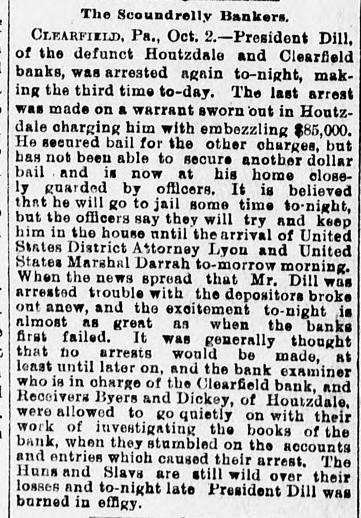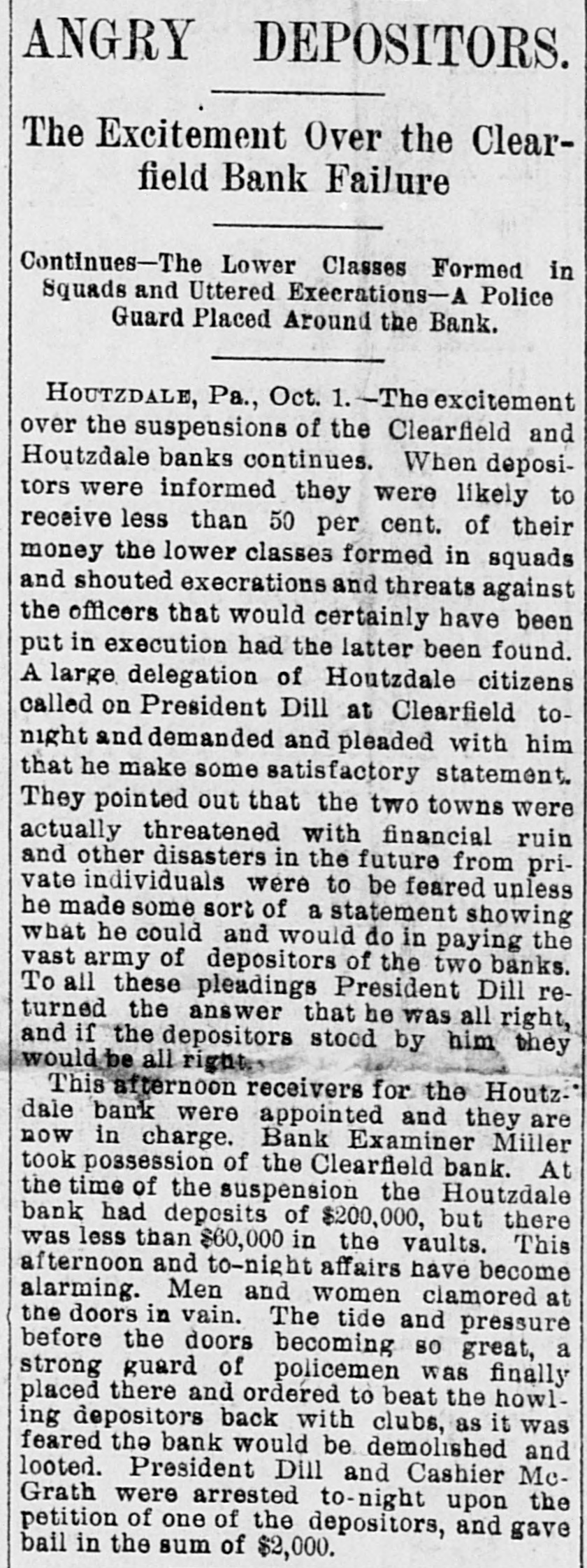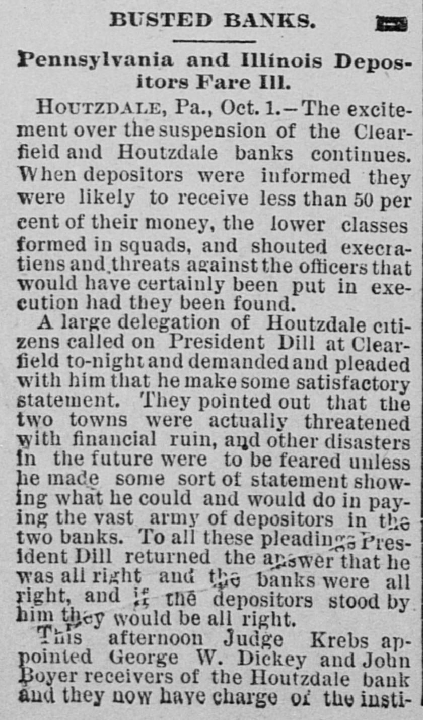 IT HAD TO GO UNDER Phillipsburg Bank Also a Victim to President-Dill. HOPES OF PAYING ALL CLAIMS. The Failures at Clearfield and Houtzdale Caused a Great Run on the Bank. The President of the Bank the Fatherin-Law of Dill-He Had Drawn Out a Large Amount to Assist His Son-in-Law. A Panto Imminent, and Fears that Many Individuals Will Go Down. PHILLIPSBURG, Pa., Oct. 6.-This community was greatly excited yesterday by the following announcement which was posted on the doors of the Phillipsburg Bank, supposed to be one of the strongest private institutions of the State: OCT. 5, 1891. The continued demand of our depositors is greater than we can meet at once. We deem it best for all their interests to suspend payment and liquidate our affairs. We firmly believe we can pay every depositor in full. O. PERRY JONES, Cashier. Ever since the Clearfield bank closed and the Houtzdale bank failed the Phillipsburg institution has experienced an unprecedented run. The miners and their friends became alarmed and began a run, steadily withdrawing their deposits of $500 to $1,000, and many M thousand dollars were thus paid out during the last three days. Then the heavy depositors took fright, and began a quiet checking of their balances, which resulted in the announcement. The officers of the bank had feared a run and made every preparation for the worst, but with every check paid out there seemed to be two more coming in = and they decided to no longer attempt to stem the current. On Saturday confidence was somewhat restored by the gold and currency visible on the counters. At the last moment two heavy checks from lumber and coal mining firms overthrew the balance, and a hasty meeting of bank officials was called for 8 o'clock yesterday morning. At 9 o'clock the notice was posted. The secret of the closing lies in the fact that Jonathan Boynton, of Clearfield, is president of the bank. Boynton is the father-in-law of President Dill of the Clearfield and Houtzdale banks, now in jail. The statement has been made here and in Clearfield that Mr. Boynton, only a few days ago, had drawn out $20,000, which he loaned to his son-in-law to assist him in his troubles, and this, th rumors that Dill had previously a borrowed anormous sums from Mr. Boynton, caused a feeling of uneasiness. The effect of closing the Phillipsburg bank can hardly be estimated. This city lies close to Houtzdale, while Clearfield is not far away, and as all depend for their prosperity largely upon mining and lumber, the panic cannot be fully measured. It is feared that many individuals will go down in the crash that seems imminent here. Cashier Jones made a statement yesterday that every dollar would be paid in full as soon as the bank had time to negotiate the collateral security it has on hand. He also said that President Boynton only owned $10,000 worth of stock in the bank, and that he was merely a figurehead. President Boynton has not spent a week in the bank for the last five years.