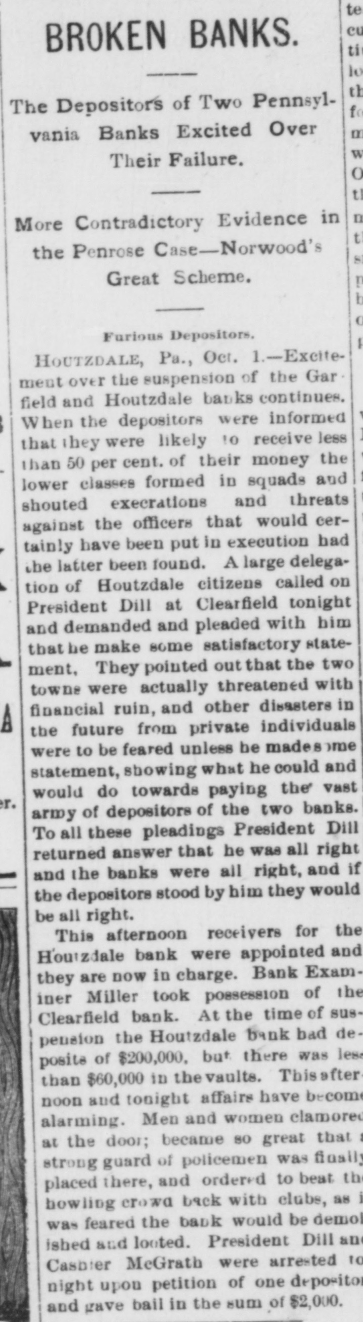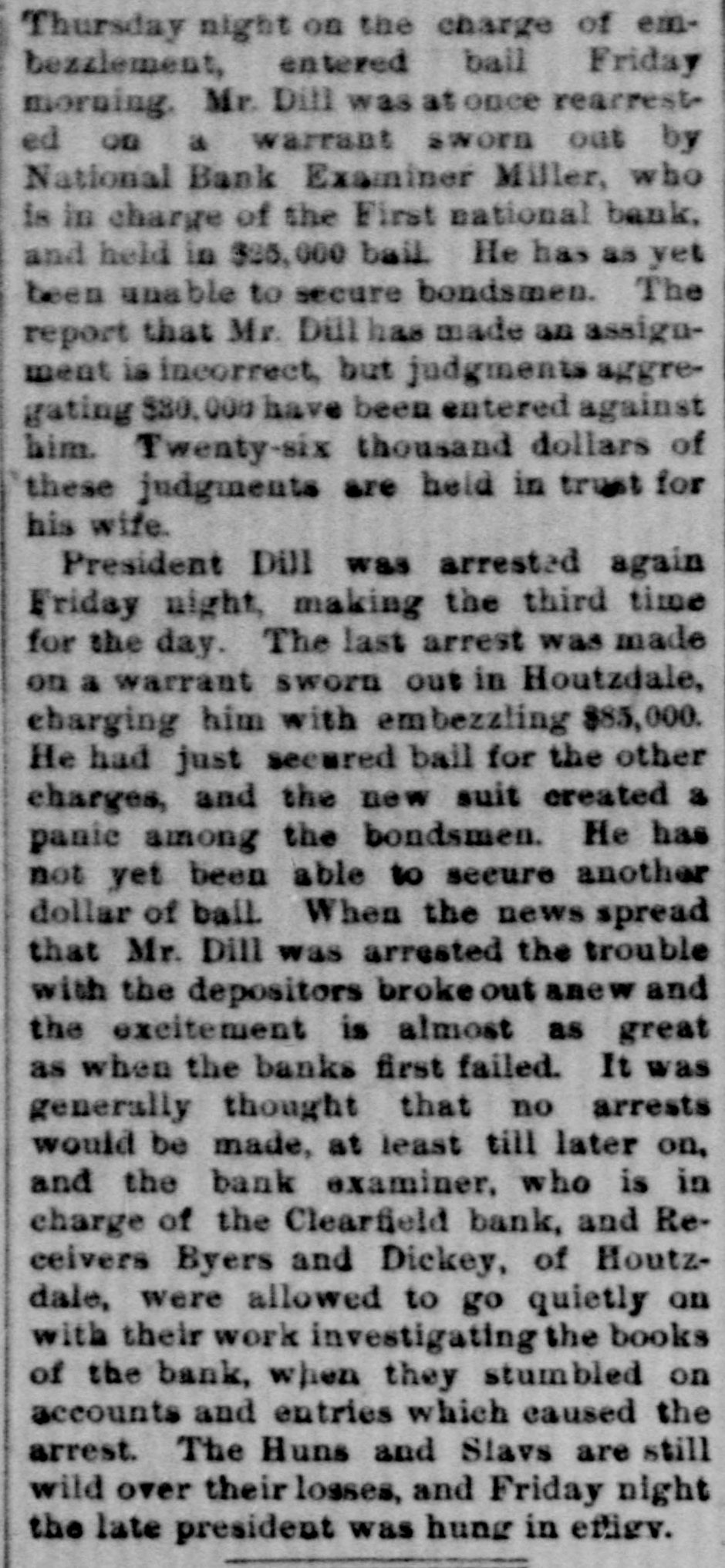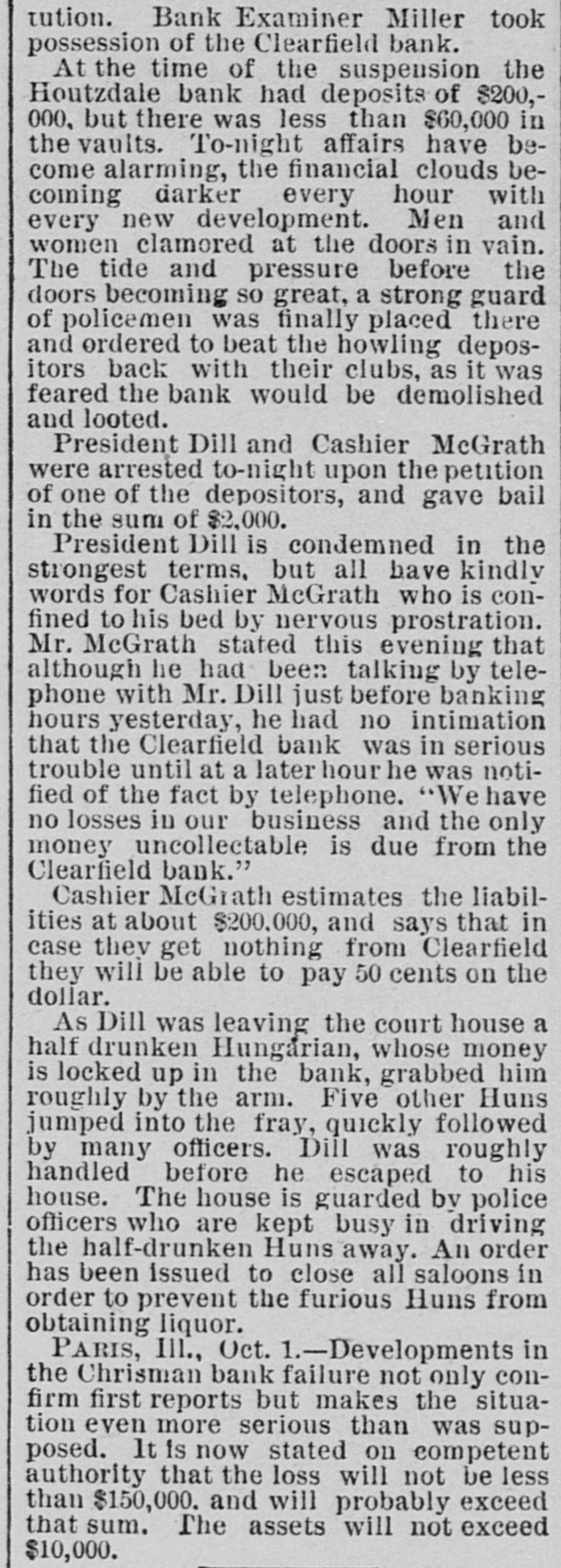 IT HAD TO GO UNDER Phillipsburg Bank Also a Victim to President-Dill. HOPES OF PAYING ALL CLAIMS. The Failures at Clearfield and Houtzdale Caused a Great Run on the Bank. The President of the Bank the Fatherin-Law of Dill-He Had Drawn Out a Large Amount to Assist His Son-in-Law. A Panto Imminent, and Fears that Many Individuals Will Go Down. PHILLIPSBURG, Pa., Oct. 6.-This community was greatly excited yesterday by the following announcement which was posted on the doors of the Phillipsburg Bank, supposed to be one of the strongest private institutions of the State: OCT. 5, 1891. The continued demand of our depositors is greater than we can meet at once. We deem it best for all their interests to suspend payment and liquidate our affairs. We firmly believe we can pay every depositor in full. O. PERRY JONES, Cashier. Ever since the Clearfield bank closed and the Houtzdale bank failed the Phillipsburg institution has experienced an unprecedented run. The miners and their friends became alarmed and began a run, steadily withdrawing their deposits of $500 to $1,000, and many M thousand dollars were thus paid out during the last three days. Then the heavy depositors took fright, and began a quiet checking of their balances, which resulted in the announcement. The officers of the bank had feared a run and made every preparation for the worst, but with every check paid out there seemed to be two more coming in = and they decided to no longer attempt to stem the current. On Saturday confidence was somewhat restored by the gold and currency visible on the counters. At the last moment two heavy checks from lumber and coal mining firms overthrew the balance, and a hasty meeting of bank officials was called for 8 o'clock yesterday morning. At 9 o'clock the notice was posted. The secret of the closing lies in the fact that Jonathan Boynton, of Clearfield, is president of the bank. Boynton is the father-in-law of President Dill of the Clearfield and Houtzdale banks, now in jail. The statement has been made here and in Clearfield that Mr. Boynton, only a few days ago, had drawn out $20,000, which he loaned to his son-in-law to assist him in his troubles, and this, th rumors that Dill had previously a borrowed anormous sums from Mr. Boynton, caused a feeling of uneasiness. The effect of closing the Phillipsburg bank can hardly be estimated. This city lies close to Houtzdale, while Clearfield is not far away, and as all depend for their prosperity largely upon mining and lumber, the panic cannot be fully measured. It is feared that many individuals will go down in the crash that seems imminent here. Cashier Jones made a statement yesterday that every dollar would be paid in full as soon as the bank had time to negotiate the collateral security it has on hand. He also said that President Boynton only owned $10,000 worth of stock in the bank, and that he was merely a figurehead. President Boynton has not spent a week in the bank for the last five years.
