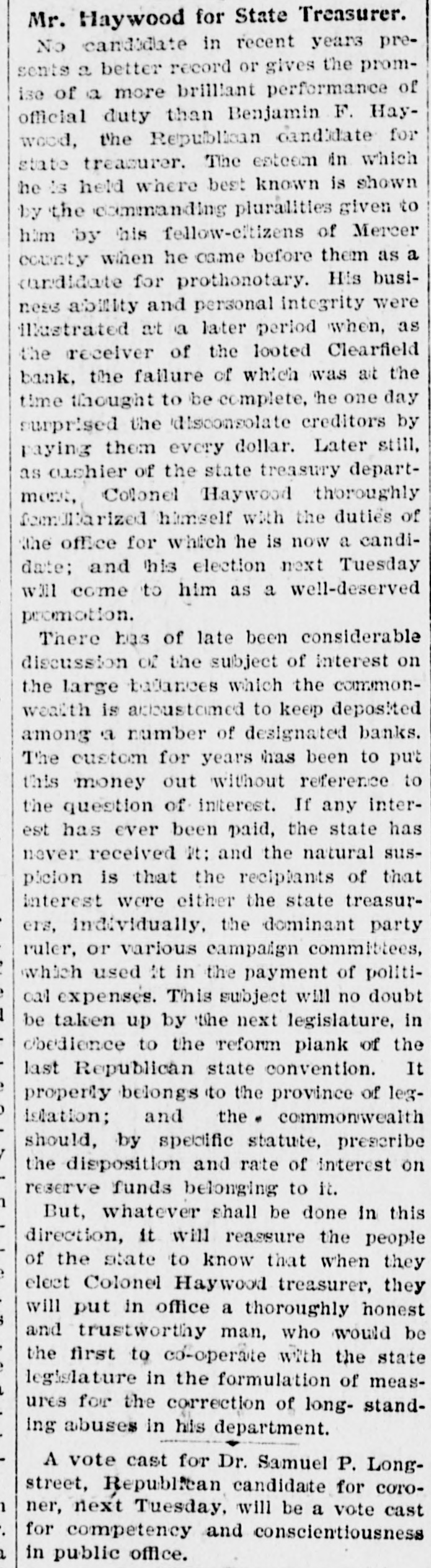 # Mr. Haywood for State Treasurer. No candidate in recent years presents a better record or gives the promise of a more brilliant performance of official duty than Benjamin F. Haywood, the Republican candidate for state treasurer. The esteem in which he is held where best known is shown by the commanding pluralities given to him by his fellow-citizens of Mercer county when he came before them as a candidate for prothonotary. His business ability and personal integrity were illustrated at a later period when, as the receiver of the looted Clearfield bank, the failure of which was at the time thought to be complete, he one day surprised the disconsolate creditors by paying them every dollar. Later still, as cashier of the state treasury department, Colonel Haywood thoroughly familiarized himself with the duties of the office for which he is now a candidate; and his election next Tuesday will come to him as a well-deserved promotion. There has of late been considerable discussion of the subject of interest on the large balances which the commonwealth is accustomed to keep deposited among a number of designated banks. The custom for years has been to put this money out without reference to the question of interest. If any interest has ever been paid, the state has never received it; and the natural suspicion is that the recipients of that interest were either the state treasurers, individually, the dominant party ruler, or various campaign committees, which used it in the payment of political expenses. This subject will no doubt be taken up by the next legislature, in obedience to the reform plank of the last Republican state convention. It properly belongs to the province of legislation; and the commonwealth should, by specific statute, prescribe the disposition and rate of interest on reserve funds belonging to it. But, whatever shall be done in this direction, it will reassure the people of the state to know that when they elect Colonel Haywood treasurer, they will put in office a thoroughly honest and trustworthy man, who would be the first to co-operate with the state legislature in the formulation of measures for the correction of long-standing abuses in his department. A vote cast for Dr. Samuel P. Longstreet, Republican candidate for coroner, next Tuesday, will be a vote cast for competency and conscientiousness in public office.