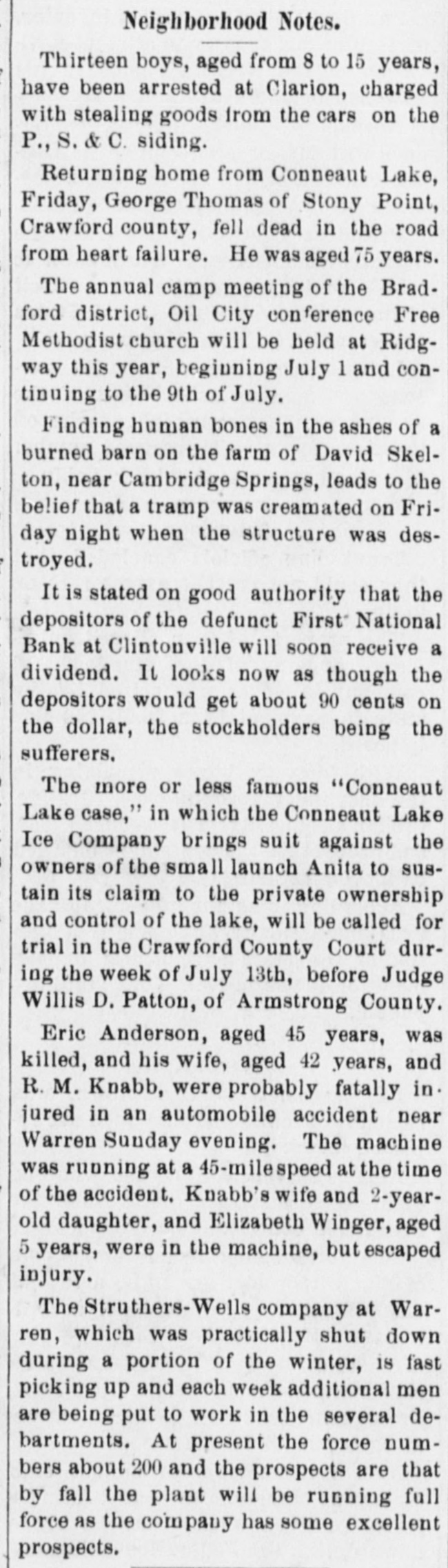 LATE NEWS FROM YOUR OLD HOME STATE PENNSYLVANIA NEBRASKA NEW JERSEY OIL CITY, Pa., May 3.-The Farmers' MERCHAN TVILLE, N. J., May 3.YORK, Neb., May 3.-A telephone National bank of Emlenton, Pa., with a William Gilligan, Charles Marlin and message to county officials from Polk capital of $50,000, and the First National Thomas Ferguson, boys of 18 years, says that Tewell brothers' store was bank of Clintonville, Pa., with a capiall living in Camden, were committed broken into and $400 worth of general tal of $25,000, both in Venango county, to the county jail by Mayor Longmerchandise was stolen. were closed by the comptroller of the streth. The boys were arrested by currency. The Clintonville institution Constable Nuss of Pensauken township, FULLERTO-The crops in this lois said to be a subsidiary of the Emlenwho charged them with breaking street cality are looking fine, while the promton bank. It is believed the suspension lights of the Public Service system. ise for a splendid fruit crop was never is only temporary and that stockholdbetter. All kinds of fruit trees are Ivill CLAYTON-Mayor Nichols made a ers and depositors will lose nothing. of blossoms. raid on a resort known as "Rumdums' Retreat" here and landed more prisonSHARON-The Shenango Valley steel PLATTSMOUTH-V J. Schnelder and ers than the lockup would hold. With mill of the Carnegie Steel company reMiss Mary Bloetzer were united in martwo or three men to a cell the prisonsumed operations in all departments at riage by Judge A. J. Beeson in the home ers soon started a fight, and the mayor New Castle, affording employment to of J. J. Schneider near Cedar creek, this gave them a hearing at once and fined 1500 men. The plant has working each $15.75. All of the prisoners paid county. one-third time for the last four mouths. except Eugene Bennett and Wilbur BEATRICE-Mrs. M. Righter, owner Stewart, who were taken to Woodbury HASTON-Rev. A. A. De Long, forof the Lyric theater at South Omaha, jail to serve sixty days. mer pastor of the First United Evanand who has also conducted the Lyric gelical church, this city, died last night, ELMER-The nude "wild man" who at this place for some time, sold her aged 62, of a complication of ailments. has been seen from time to time in Omaha theater to a Mr. Savage of He moved to this city from Mt. Joy. the woods hereabouts was spied again Plattsmouth. yesterday by Aaron Whitney from the STROUDSBURG-The forest fire that car window of a train running through WEEPING WATER-A very heavy had assumed such dangerous proporthe woods from here to Aura. Whitrain storm visited this locality, accomtions on the Pocono mountain back of ney saw the man washing himself in a panied by considerable hail. The fruit McMichael's, is under control. pool near the tracks. blossoms will be thinned out some, but the rain will do a world of good. Some SELINGS GROVE-At the residence GLASSBORO-Russell Moore, a 14farmer are planting corn. of the bride's parents at Mt. Pleasant year-old boy of this place, was sent to Mills, Miss Margaret Catherine, daughWoodbury jail on complaint of C. G. TECUMSEH-Rev. H. J. Bailey, for ter of Dr. and Mrs. M. Rothrock, was Justice of Pitman, who charges him several weeks rector of Grace EpiscoII. .rried to Rev. Calvin P. Swank of with cutting shade trees at Honey pal church of this city, as well as of Brook Lake. Highspire. Rev. E. J. Taylor of Selins the church of the same denomination Grove performed the ceremony. MANTUA-Samuel Kean of Mantua, at Auburn, will no longer officiate at the church here. He was relieved of will start next month for the gold fields YORK-Worrying over the death of of Alaska, and this will make his ninth duty here last week. his 16-year-old daughter two months trip to that country. During the past ago, Nathaniel Devinney, aged 44, of WYMORE-The Burlington shops nine years he has traveled 117,000 Seven Valley, hanged himself in his miles. shut down for five days. Work, when room at the almshouse. resumed, will be but the first three days of the week, and the men will work but MOUNT NEBO-At a meeting of the OKLAHOMA eight hours a day. Several of the maRawlinsville Campmeeting association chinists have left town to seek work of the Methodist Episcopal church in other places. it was decided to begin the campmeetMUSKOGEE, Okla., May 3.-The ing August 4 and close it August 13. Union Life Insurance and Trust comBEATRICE-Charles Jones of this pany, which was granted a charter at city will begin the manufacture of autoDARBY-The members of the Elsie Guthrie," with Ira I. Reeves as presimobiles within a short time. He will Rebekah lodge, I. O. O. F., the woman's dent, is the first life insurance comorganize a stock company capitalized branch of the Independent Order of Odd pany to be chartered in the state. At for $75,000, which will be composed Fellows, of this borough, have made the same time the Union Accident Inlargely of local capitalists. Work on preparations for the celebration of their surance company was organized as a the new factory will be started at once thirteenth anniversary at Odd Fellows' branch of the life company. The for. and Mr. Jones says that the actual hall, Main street. mer is capitalized at $150,000 and the work of manufacturing automobiles