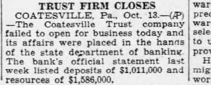 TRUST FIRM CLOSES Oct. Coatesville Trust company failed to open for business today and its affairs placed the hands the state department of banking The bank's official statement He $1,011,000 might resources of $1,586,000. work