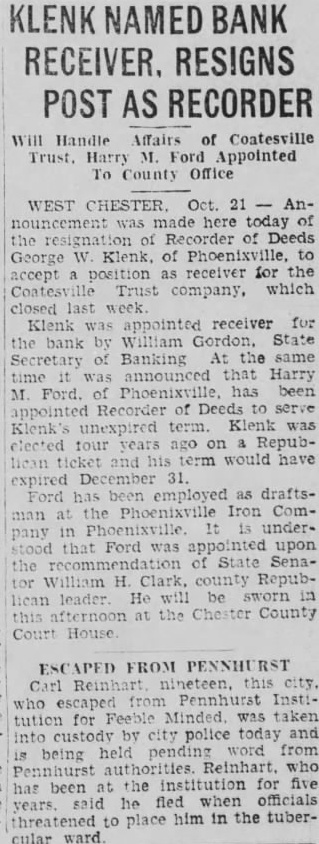 KLENK NAMED BANK RECEIVER. RESIGNS POST AS RECORDER Will Handle Affairs of Coatesville Trust. Harry Ford Appointed To County Office WEST CHESTER Oct. 21 Anhere today of Recorder of Deeds George W. Klenk. of Phoenixville, to accept position as receiver for the Coatesville Trust company, which closed last Klenk appointed receiver for William State Secretary of Banking the same time announced that Harry Ford. has been appointed Deeds unexpired term. Klenk was Klenk's elected years ago on Republican ticket and his term would have expired December 31. Ford has as draftsthe Phoenixville Iron Company underthat Ford was upon the of State SenaWilliam H. Clark, county Republeader He will be sworn lican at the Chester County Court House ESC FROM PENNHURST Pennhurst Instiwho for Feeble Minded. was taken into custody by city police today and held pending word from being Pennhurst authorities. Reinhart. who has been the institution for five said he fled officials years. threatened to place him in the tubercular ward.