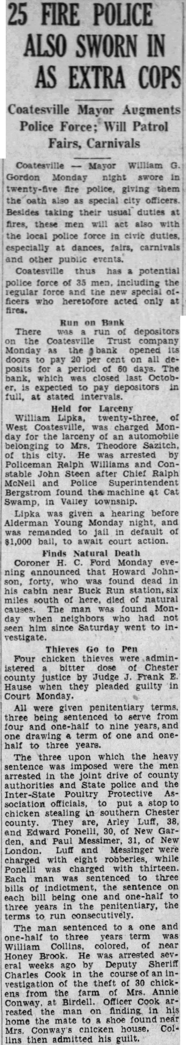 25 FIRE POLICE ALSO SWORN IN AS EXTRA COPS Coatesville Mayor Augments Police Force; Will Patrol Fairs, Carnivals Coatesville Mayor William Gordon Monday night swore in fire police, giving the oath special Besides taking their duties at fires, these will act also with the local force in civic especially at dances, fairs, carnivals and other public events. Coatesville potential police force of 35 including the regular and the new special acted only at fires. Run on Bank There depositors the Coatesville company Monday opened doors pay on all deposits for period of days The bank, which was last expected pay in at Held for William Lipka, West was charged Monday for the larceny an belonging Mrs. Theodore Sazitch, this by Constable John Steen Chief McNeil Bergstrom found machine at Cat Swamp, in Valley township. Lipka was given hearing before Alderman night, and to jail default of $1,000 bail, to action. Finds Death Ford Monday evening that Howard Johnson, forty, who was found dead in his cabin near Buck six miles of natural Monday not seen to investigate. Thieves Go Pen Four chicken were administered Chester county justice by Judge Frank Hause when they pleaded guilty in Court Monday All were terms. to from four and to nine one drawing term of one and onehalf to three The three upon which the heavy sentence was the arrested in the joint authorities and State police and the Inter-State sociation officials, put stop chicken stealing in southern Chester county. They are, Arley Luff, 38, Ponelli, 30, New GarPaul 31, of London. Luff Messinger were charged with eight robberies, while Ponelli was charged with thirteen. Each sentenced to three bills of the sentence on bill one and to each being three the penitentiary, the to run The sentenced to one and man three years term William colored. near Honey Brook. He was arrested ago by Deputy Sheriff Charles the course vestigation the theft 30 chickens from Mrs. Annie Conway Birdell. Officer Cook arrested the finding in his home the mate shoe Mrs house. Collins then admitted his guilt.