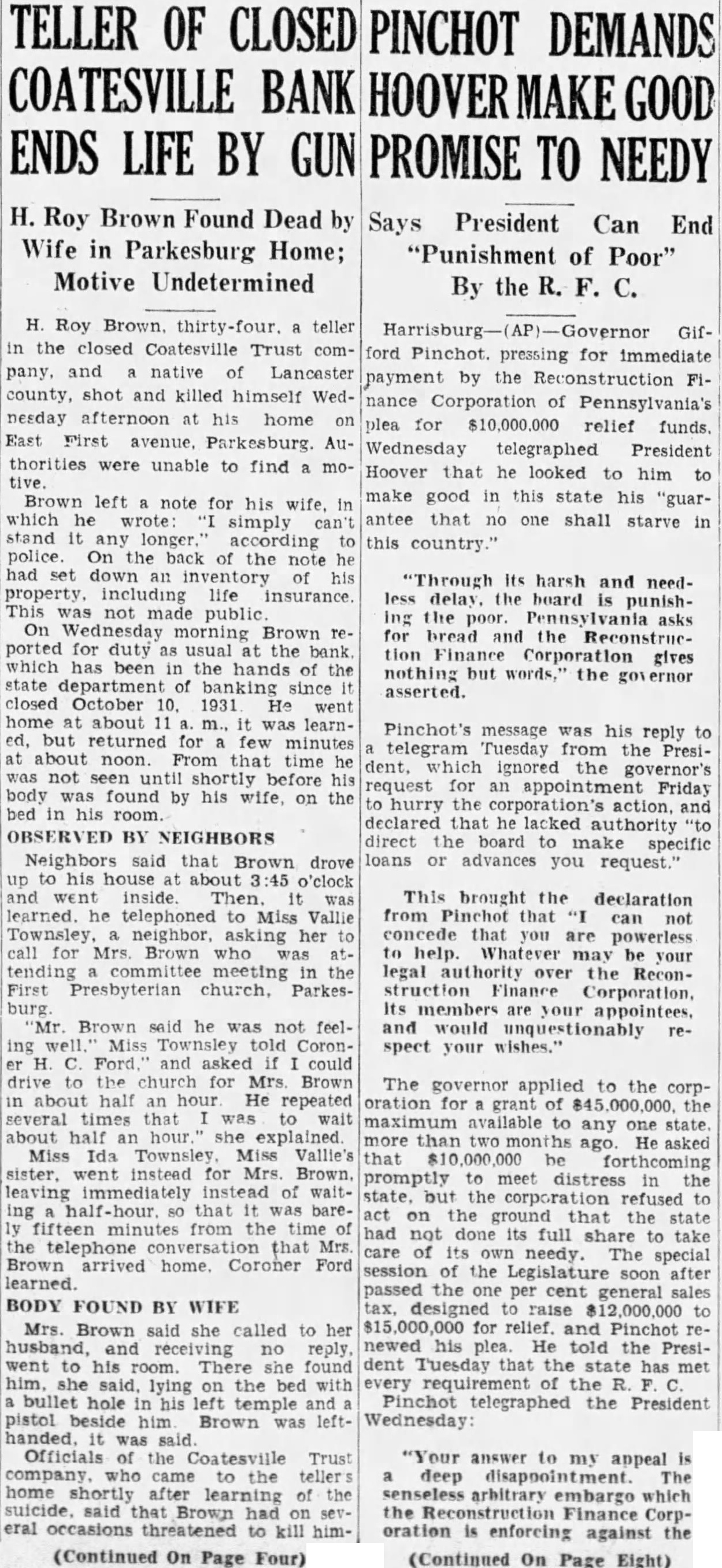 TELLER OF CLOSED PINCHOT DEMANDS COATESVILLE BANK GOOD ENDS LIFE BY GUN PROMISE TO NEEDY H. Roy Brown Found Dead by Wife in Parkesburg Home; Motive Undetermined H. Roy Brown. thirty-four. in the closed Coatesville Trust pany, and native of Lancester county, shot and killed himself Wednesday his home East First avenue. Authorities unable to find moBrown left note for his wife, which he simply stand it any according police. On the back of the note had set down an inventory including insurance This On Brown ported for duty usual the bank which been the hands of the department of banking since closed October 10. 1931 home about learnbut returned minutes noon. From that body was found by his wife, on the in his room. BY NEIGHBORS Neighbors that Brown drove to his house about o'clock went inside. learned. he telephoned to Miss Vallie Townsley, neighbor, asking her call for Brown First Presbyterian church, ParkesBrown said he not feeling Townsley told Coronand Brown about He repeated several that about she Ida Miss Vallie's instead for Mrs. leaving immediately instead of that fifteen from telephone that Mrs Brown arrived home. Ford BODY FOUND BY WIFE Mrs. Brown said she called to her to his There found she on the bed with hole temple beside Brown lefthanded, Officials the Coatesville Trust home shortly after learning of said Brown eral threatened to kill (Continued On Page Four) Says President Can End "Punishment of Poor" By the C. GifPinchot. for immediate payment by the Finance of Pennsylvania's plea for relief Wednesday telegraphed President Hoover that he looked to him to make good in this state his "guarantee that no one shall starve in country. "Through Its harsh and needdelay. the board is punishIng the asks for bread and the Reconstruction gives nothing but words," the governor asserted. Pinchot's message was his reply to telegram Tuesday from the President, ignored the governor's request for appointment Friday hurry the and declared authority direct the board specific loans or advances you request.' This brought the declaration from Pinchot that you are powerless help. be legal the Reconstruction Corporation. Its members and would spect your wishes." The governor applied to the corporation grant the maximum available state any more He asked $10,000,000 promptly meet distress the the corporation refused act on the ground the had not its full share to take its special session the Legislature after passed the one per designed for relief. and Pinchot newed his He told the President Tuesday that met requirement Pinchot telegraphed the President answer to my appeal deep senseless arbitrary embargo which the Finance Corporation is enforcing against the (Continued On Page Eight)