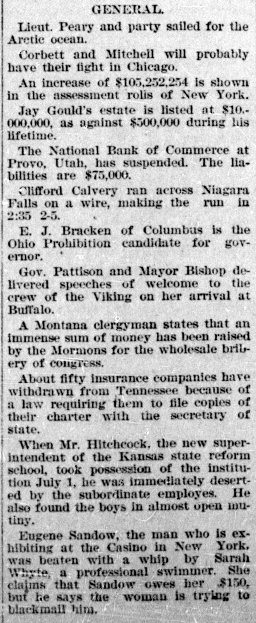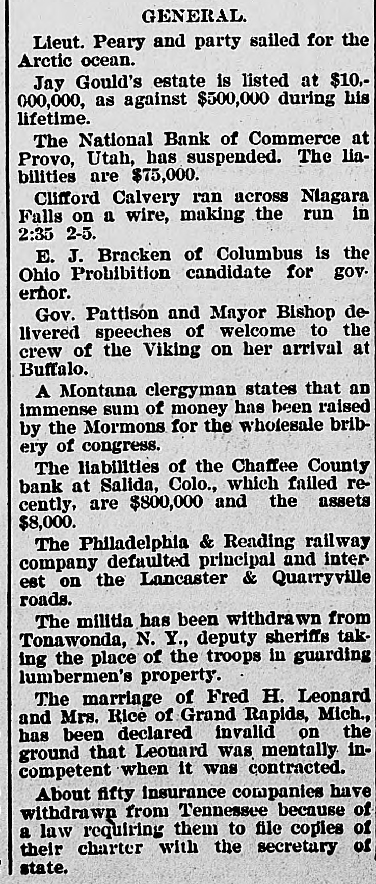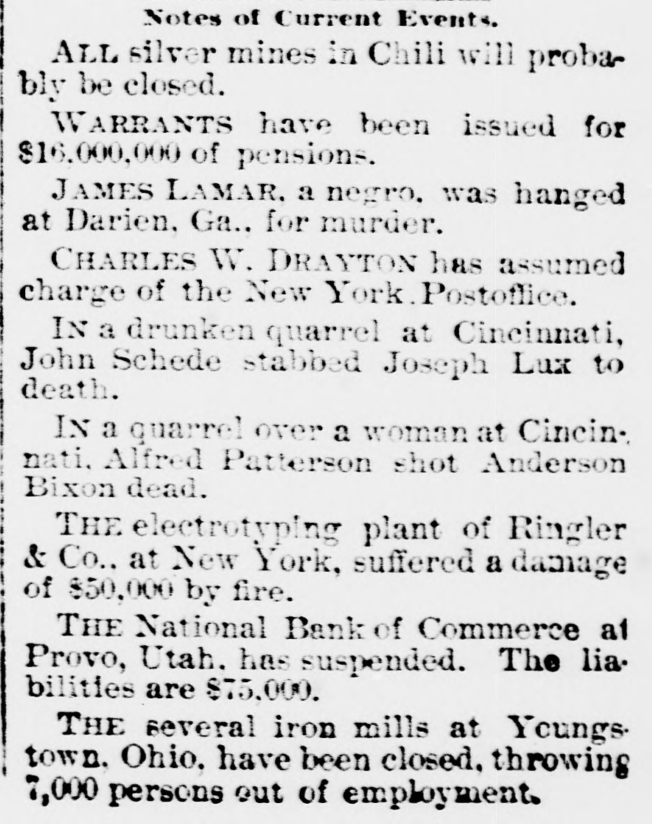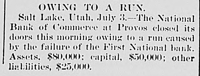 BANKS HAVE RESUMED. Those That Were Temporarily Embarrassed Now All Right. WASHINGTON, D. C. Sept. 1.Controller Eckels has prepared the following statement of banks which temporarily suspended during the late stringency and have since resumed business: Black Hills National Bank, Rapid City, S. D., capital stock, $125,000; Gate City National Bank, Atlanta, Ga., $250,000; Capital National Bank, Indianapolis, Ind., $300,000; Washington National Bank, Spokane Falls, Wash., $250,000; First National Bank, Palouse city, Wash., $75,000: Southern California National Bank, Los Angeles, Cal: $200,000; First National Bank, Los Angeles, Cal., $200,000; First National Bank, San Diego, Cal., $300,000; First National Bank, Santa Ana, Cal., $150,000; First National Bank, Kendallville, Ind., $50,000; First National Bank, San Bernardino, Cal., $100,000; Second National Bank, Ashland, Ky., $50,000; First National Bank, Rico, Col., $50,000; National Bank of Commerce, Provo City, Utah, $50,000; First National Bank, Cisco, Texas, $50,000; American National Bank, Leadville, Col., $100,000; Central National Bank, Pueblo, Col., $50,000; Missouri National Bank, Kansas City, Mo., $250,000; First National Bank, Fort Scott, Kan., $300,000; Union National Bank, Denver, Col., $1,000,000; National Bank of Commerce, Den ver $500,000; Hutchinson National Bank, Hutchinson, Kan., $100,000; People's National Bank, Denver, Col.,$600,000; First National Bank, Anthony, Kan., $50,000; Greeley National Bank, Greeley, Col., $50,000; Farmer's National Bank, Henrietta, Tex., $50,000; State National Bank, Vernon, Tex., $100,000; Fourth National Bank, Louisville, Ky., $200,000; First National Bank, The Dalles, Ore., $50,000; Waupaca County National Bank, Waupaca, Wis., $50,000: Waxabachee National Bank, Waxabachee, Tex., $100,000; Citizen's National Bank, Attica, Ind., $50,000; First National Bank, San Marcos, Tex., $80,000; First National Bank, Lockhart, Tex., $50,000. Total capital stock of $6,030,000. Since January 1 last 154 national banks have suspended. Of this number one has gone into voluntary liquidation, 57 have been placed in the hands of receivers, 62 are in the hands of national bank examiners with excellent prospects of early resumption, in addition to the 34 above named which have already resumed business.