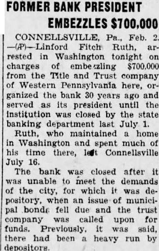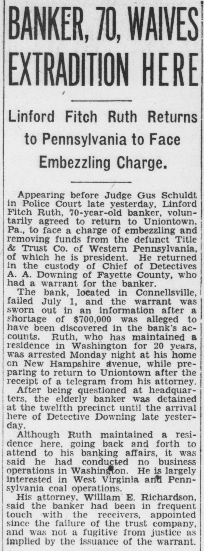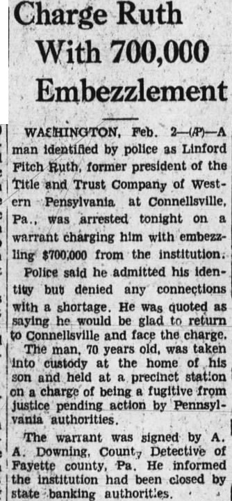 WASHINGTON, Feb. man identified by police as Linford Fitch Ruth, former president of the Title & Trust Company of Western Pennsylvania at Connellsville, Pa. was arrested tonight on warrant charging him with embezzling $700,000 from the institution. Police said he admitted his identity, but any with shortage. He was quoted as say ing he would be glad to return Connellsville and face the charge. The man, 70 years old, was taken into custody at the home of his son and held precinct station charge of being fugitive from justice pending action by Pennsylvania authorities. The warrant was signed by Downing, chief of police of Fayette county, He informed police the institution had been closed state banking authorities.