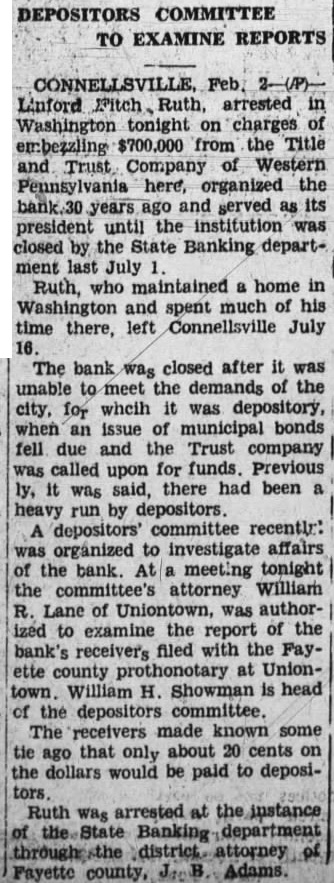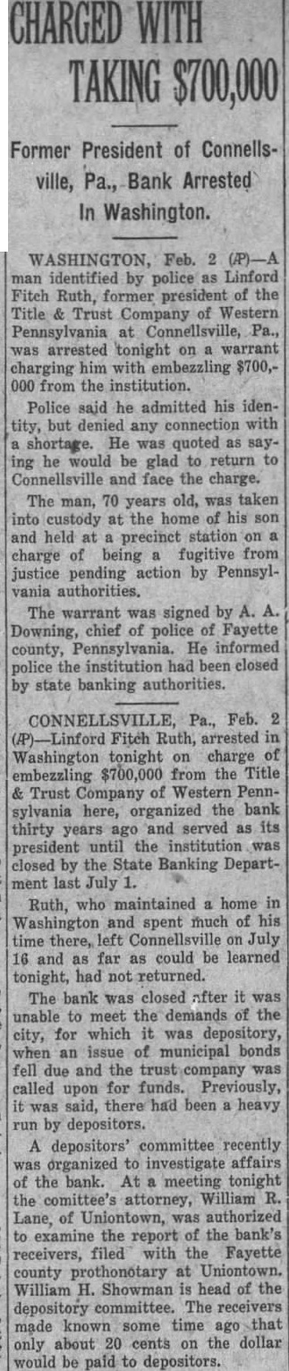 CONNELLSVILLE, Pa., Feb. Fitch Ruth, arrested Washington tonight on charge embezzling $700,000 from the Title Trust Company of Western Pennsylvania here, organized the bank thirty years ago and served as its president until the institution was closed by the State Banking Department last July Ruth, who maintained home Washington and spent much of his time there, left Connellsville on July 16 and as far as could be learned tonight, had not returned. The bank was closed after was unable to meet the demands of the city, for which it was depository, when an issue of municipal bonds fell due and the company was called upon for funds. Previously, was said, there had been heavy run by depositors. A depositors' committee recently was organized to investigate affairs of the bank. At meeting tonight the comittee's attorney, William R. Lane, of Uniontown, was authorized to examine the report of the bank's receivers, filed with the Fayette county prothonotary at Uniontown. William H. Showman head of the depository committee. The receivers made known some time ago that only about 20 cents on the dollar would be paid to depositors.