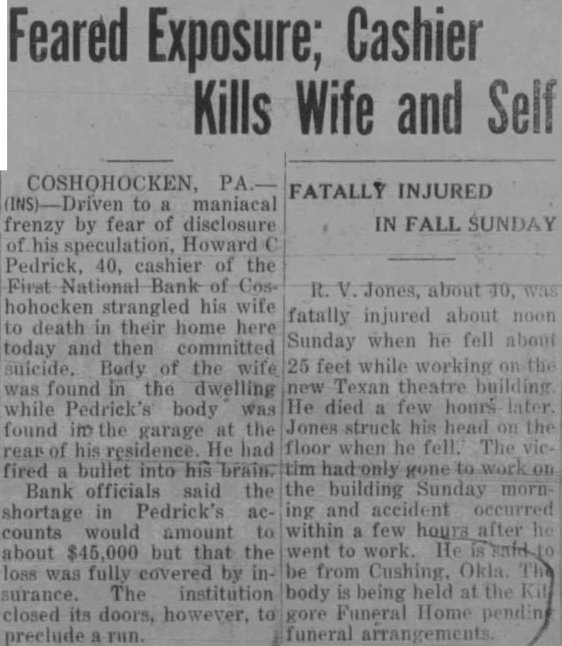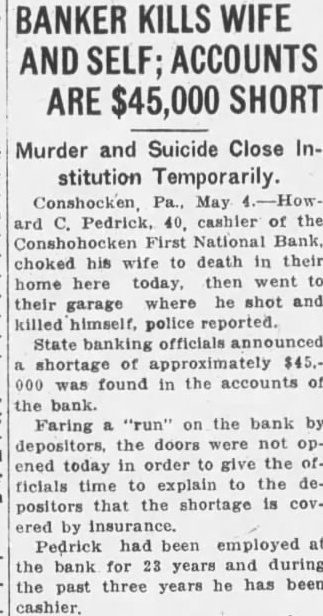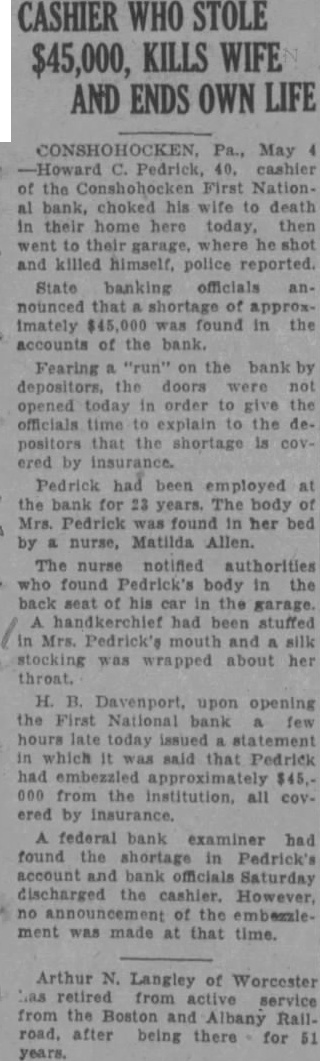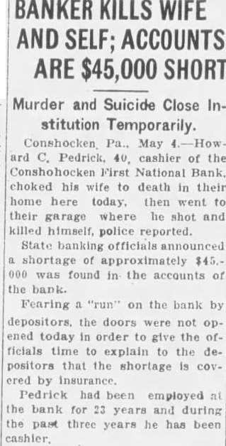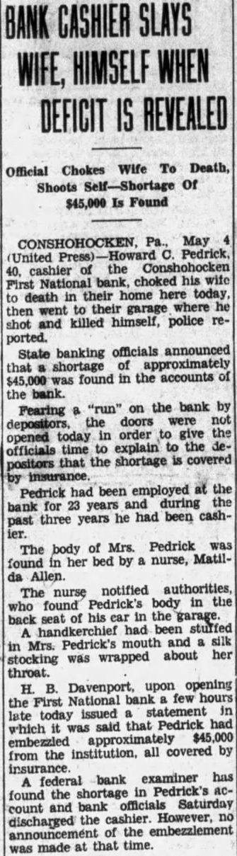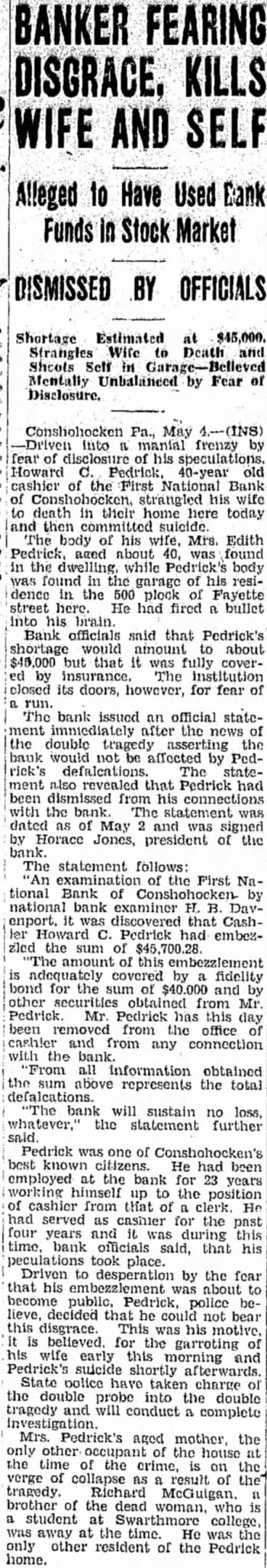 BANKER FEARING DISGRACE. KILLS AND to Used OFFICIALS Shortage Estimated $45,000. Strangles Wife Death Shoots Self Mentally Unbalanced Fear Disclosure. Conshohocken May into manial frenzy Howard 40-year old the First National Bank wife death in their home today then The body his wife, Mrs. Edith aged about the while Pedrick's body found in garage of residence the 500 plock street He had fired bullet into brain. Bank officials said that Pedrick's would amount about but that fully coverby insurance. The closed its doors, however, for fear bank issued an official stateafter the double tragedy bank would affected Pedrick's The statealso that Pedrick had from connections with the bank. May and signed Horace Jones, president the bank. The statement follows: of the First National Bank by national bank examiner enport. was discovered that CashPedrick embezzled the sum The amount of by fidelity bond for the and obtained from Mr. Pedrick this been from the office and from any connection bank. information obtained the sum above the represents total bank will sustain loss, no the statement further Pedrick was one of Conshohocken's best known He had been employed the bank for 23 years working the up position cashier from that of clerk. had served cashier the past years time, bank officials said, that took place. Driven to desperation by the fear that his about public, Pedrick, police lieve, decided he not bear disgrace. his motive. believed. for the garroting early morning and Pedrick's suicide State police double probe into double tragedy and will conduct complete Mrs. Pedrick's aged the other the the crime, on the verge result tragedy. Richard brother the dead woman, student college, away the time. He only other resident of the Pedrick home.
