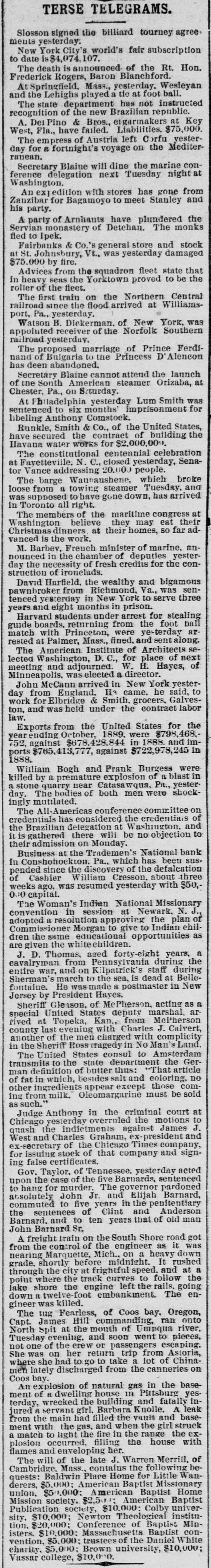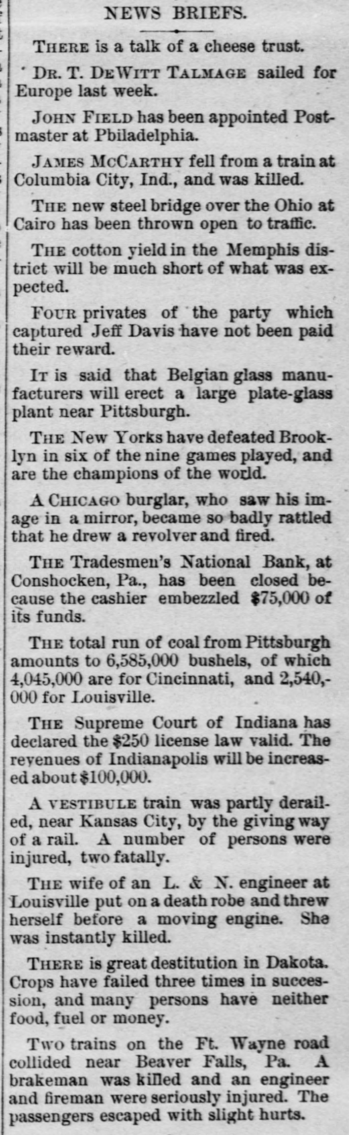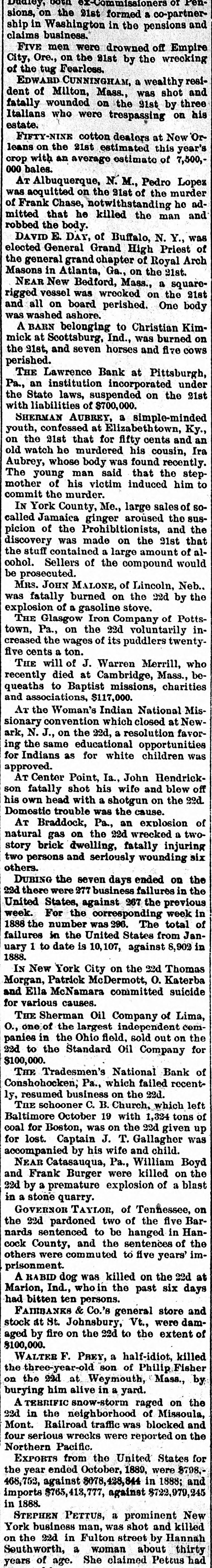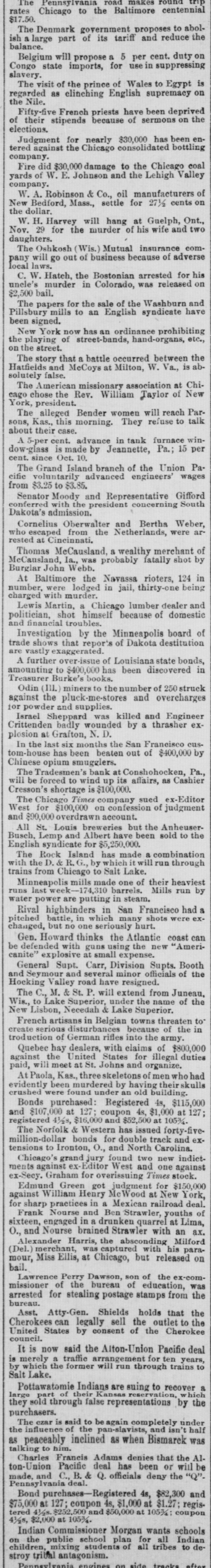 rates Chicago to the Baltimore centennial $17.50. The Denmark government proposes to abolish a large part of its tariff and reduce the balance. Belgium will propose a 5 per cent. duty on Congo state imports, for use in suppressing slavery. The visit of the prince of Wales to Egypt is regarded as clinching English supremacy on the Nile. Fifty-five French priests have been deprived of their stipends because of sermons on the elections. Judgment for nearly $30,000 has been entered against the Chicago consolidated bottling company. Fire did $30,000 damage to the Chicago coal yards of W. E. Johnson and the Lehigh Valley company. W. A. Robinson & Co., oil manufacturers of New Bedford, Mass., settle for 27½ cents on the dollar. W. H. Harvey will hang at Guelph, Ont., Nov. 29 for the murder of his wife and two daughters. The Oshkosh (Wis.) Mutual insurance company will go out of business because of adverse local laws. C. W. Hatch, the Bostonian arrested for his uncle's murder in Colorado, was released on $2,500 bail. The papers for the sale of the Washburn and Pillsbury mills to an English syndicate have been signed. New York now has an ordinance prohibiting the playing of street-bands, hand-organs, etc., on the street. The story that a battle occurred between the Hatfields and McCoys at Milton, W. Va., is absolutely false. The American missionary association at Chicago chose the Rev. William Taylor of New York, president. The alleged Bender women will reach Parsons, Kas., this morning. They refuse to talk about their case. A 5-per cent. advance in tank furnace window-glass is made by Jeannette, Pa.; 15 per cent. since Oct. 10. The Grand Island branch of the Union Pacific voluntarily advanced engineers' wages from $3.25 to $3.85. Senator Moody and Representative Gifford conferred with the president concerning South Dakota's admission. Cornelius Oberwalter and Bertha Weber, who escaped from the Netherlands, were arrested at Cincinnati. Thomas McCausland. a wealthy merchant of McCausland, la., was probably fatally shot by Burglar John Webb. At Baltimore the Navassa rioters, 124 in number, were lodged in jail, thirty-one being charged with murder. Lewis Martin, a Chicago lumber dealer and politician, shot himself because of domestic and financial troubles. Investigation by the Minneapolis board of trade shows that reports of Dakota destitution are vastly exaggerated. A further over-issue of Louisiana state bonds, amounting to $400,000 has been discovered in Treasurer Burke's books. Odin (III.) miners to the number of 250 struck against the pluck-me-stores and overcharges for powder and supplies. Israel Sheppard was killed and Engineer Crittenden badly wounded by a thrasher explosion at Grafton, N. D. In the last six months the San Francisco custom-house has been beaten out of $400,000 by Chinese opium smugglers. The Tradesmen's bank at Conshohocken, Pa., will be forced to wind up its affairs, as Cashier Cresson's shortage is $100,000. The Chicago Times company sued ex-Editor West for $100,000 on confession of judgment and $90,000 overdrawn account. All St. Louis breweries but the AnheuserBusch, Lemp and Albert have been sold to the English syndicate for $5,250,000. The Rock Island has made a combination with the D. & R. G., by which it will run through trains from Chicago to Salt Lake. Minneapolis mills made one of their heaviest runs last week- -174,310 barrels. Mills run by water power are putting in steam. Rival highbinders in San Francisco had a pitched battle, in which many shots were exchanged, but no one seriously hurt. Gen. Howard thinks the Atlantic coast can be defended with guns using the new "Americanite" explosive at small expense. General Supt. Carr, Division Supts. Booth and Seymour and several minor officials of the Hocking Valley road have resigned. The C., M. & St. P. will extend from Juneau, Wis., to Lake Superior, under the name of the New Lisbon, Necedah & Lake Superior. French artisans in Belgian towns threaten to create serious disturbances because of the in troduction of German rifles into the army. Quebec hay dealers, with claims of $800,000 against the United States for illegal duties paid, will meet at St. Johns and organize. At Paola, Kas., three skeletons of men who had evidently been murdered by having their skulls crushed were found under an old building. Bonds purchased: Registered 4s, $115,000 and $107,000 at 127; coupon 4s, $1,000 at 127; registered 41/28, $16,000 and $52,500 at 1053/4. The Norfolk & Western has issued forty-fivemillion-dollar bonds for double track and extensions to Ironton, 0., and North Carolina. Chicago's grand jury found two new indictments against ex-Editor West and one against ex-Secy. Graham for overissuing Times stock. Edmund Green got judgment for $150,000 against William Henry at New York, for sharp practices in a Mexican railroad deal. Frank Nourse and Ben Strawler, youths of sixteen, engaged in a drunken quarrel at Lima, O., and Nourse brained Strawler with an ax. Alexander Harris, the absconding Milford (Del.) merchant, was captured with his paramour, Miss Ellis, at Chicago, but released on bail. Lawrence Perry Dawson, son of the ex-commissioner of the bureau of education, was arrested for stealing postage stamps from the bureau. Asst. Atty-Gen. Shields holds that the Cherokees can legally sell the outlet to the United States by consent of the Cherokee council. It is now said the Alton-Union Pacific deal is merely a traffic arrangement for ten years, by which the former will run through trains to Salt Lake. Pottawatomie Indians are suing to recover a large part of their Kansas reservation, hich they sold through false representations by the purchasers. The ezar is said to be again completely under the influence of the pan-slavists, and isn't half as peaceably inclined as when Bismarek was talking to him. Charles Francis Adams denies that the Alton-Union Pacific deal has been or will be made, and C., B. & Q. officials deny the "Q"Penn