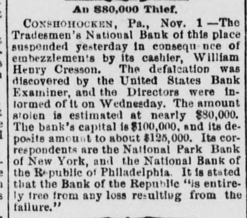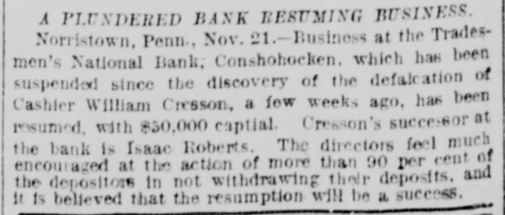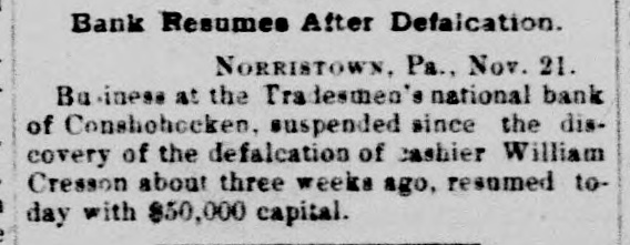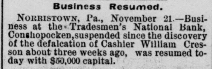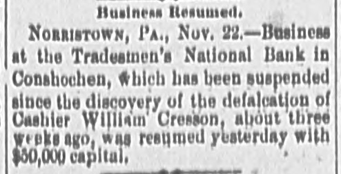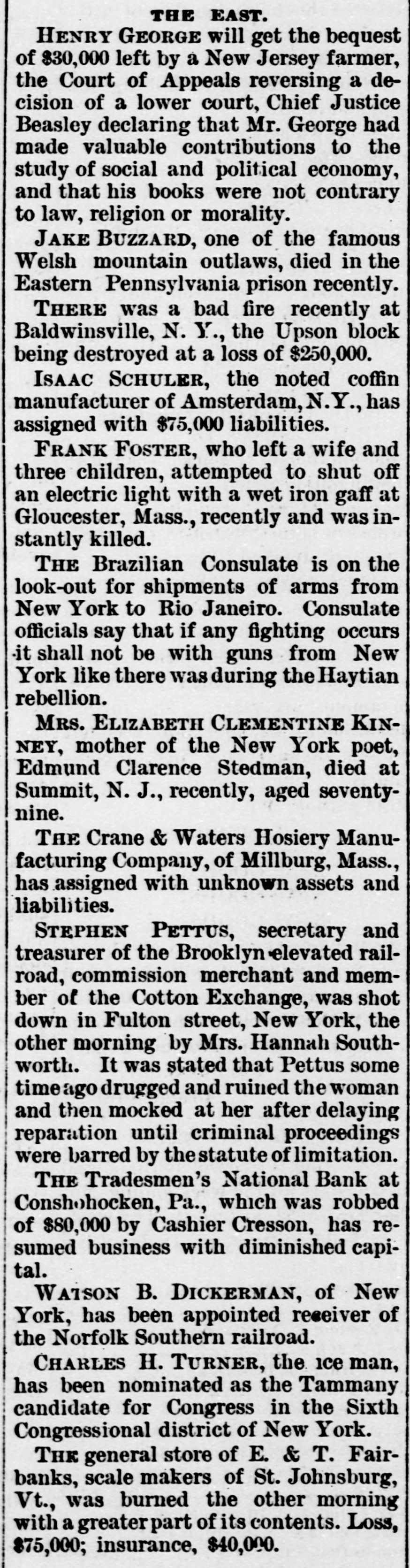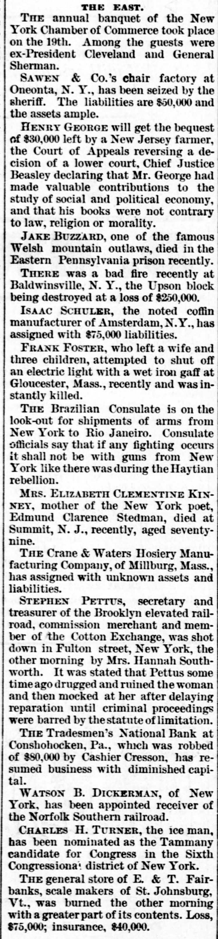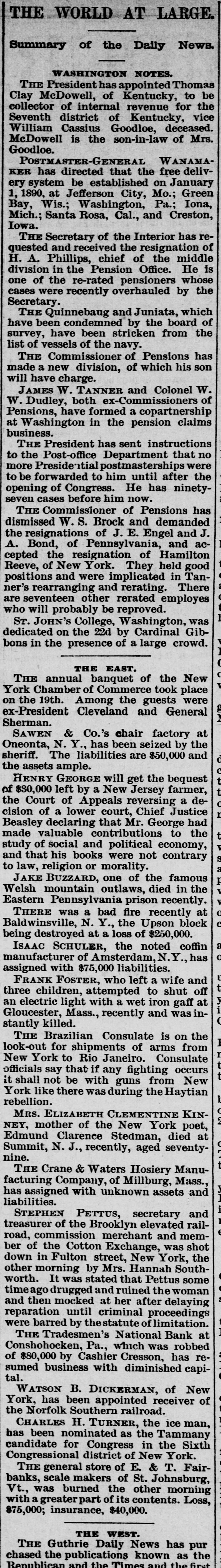 rates Chicago to the Baltimore centennial $17.50. The Denmark government proposes to abolish a large part of its tariff and reduce the balance. Belgium will propose a 5 per cent. duty on Congo state imports, for use in suppressing slavery. The visit of the prince of Wales to Egypt is regarded as clinching English supremacy on the Nile. Fifty-five French priests have been deprived of their stipends because of sermons on the elections. Judgment for nearly $30,000 has been entered against the Chicago consolidated bottling company. Fire did $30,000 damage to the Chicago coal yards of W. E. Johnson and the Lehigh Valley company. W. A. Robinson & Co., oil manufacturers of New Bedford, Mass., settle for 27½ cents on the dollar. W. H. Harvey will hang at Guelph, Ont., Nov. 29 for the murder of his wife and two daughters. The Oshkosh (Wis.) Mutual insurance company will go out of business because of adverse local laws. C. W. Hatch, the Bostonian arrested for his uncle's murder in Colorado, was released on $2,500 bail. The papers for the sale of the Washburn and Pillsbury mills to an English syndicate have been signed. New York now has an ordinance prohibiting the playing of street-bands, hand-organs, etc., on the street. The story that a battle occurred between the Hatfields and McCoys at Milton, W. Va., is absolutely false. The American missionary association at Chicago chose the Rev. William Taylor of New York, president. The alleged Bender women will reach Parsons, Kas., this morning. They refuse to talk about their case. A 5-per cent. advance in tank furnace window-glass is made by Jeannette, Pa.; 15 per cent. since Oct. 10. The Grand Island branch of the Union Pacific voluntarily advanced engineers' wages from $3.25 to $3.85. Senator Moody and Representative Gifford conferred with the president concerning South Dakota's admission. Cornelius Oberwalter and Bertha Weber, who escaped from the Netherlands, were arrested at Cincinnati. Thomas McCausland. a wealthy merchant of McCausland, la., was probably fatally shot by Burglar John Webb. At Baltimore the Navassa rioters, 124 in number, were lodged in jail, thirty-one being charged with murder. Lewis Martin, a Chicago lumber dealer and politician, shot himself because of domestic and financial troubles. Investigation by the Minneapolis board of trade shows that reports of Dakota destitution are vastly exaggerated. A further over-issue of Louisiana state bonds, amounting to $400,000 has been discovered in Treasurer Burke's books. Odin (III.) miners to the number of 250 struck against the pluck-me-stores and overcharges for powder and supplies. Israel Sheppard was killed and Engineer Crittenden badly wounded by a thrasher explosion at Grafton, N. D. In the last six months the San Francisco custom-house has been beaten out of $400,000 by Chinese opium smugglers. The Tradesmen's bank at Conshohocken, Pa., will be forced to wind up its affairs, as Cashier Cresson's shortage is $100,000. The Chicago Times company sued ex-Editor West for $100,000 on confession of judgment and $90,000 overdrawn account. All St. Louis breweries but the AnheuserBusch, Lemp and Albert have been sold to the English syndicate for $5,250,000. The Rock Island has made a combination with the D. & R. G., by which it will run through trains from Chicago to Salt Lake. Minneapolis mills made one of their heaviest runs last week- -174,310 barrels. Mills run by water power are putting in steam. Rival highbinders in San Francisco had a pitched battle, in which many shots were exchanged, but no one seriously hurt. Gen. Howard thinks the Atlantic coast can be defended with guns using the new "Americanite" explosive at small expense. General Supt. Carr, Division Supts. Booth and Seymour and several minor officials of the Hocking Valley road have resigned. The C., M. & St. P. will extend from Juneau, Wis., to Lake Superior, under the name of the New Lisbon, Necedah & Lake Superior. French artisans in Belgian towns threaten to create serious disturbances because of the in troduction of German rifles into the army. Quebec hay dealers, with claims of $800,000 against the United States for illegal duties paid, will meet at St. Johns and organize. At Paola, Kas., three skeletons of men who had evidently been murdered by having their skulls crushed were found under an old building. Bonds purchased: Registered 4s, $115,000 and $107,000 at 127; coupon 4s, $1,000 at 127; registered 41/28, $16,000 and $52,500 at 1053/4. The Norfolk & Western has issued forty-fivemillion-dollar bonds for double track and extensions to Ironton, 0., and North Carolina. Chicago's grand jury found two new indictments against ex-Editor West and one against ex-Secy. Graham for overissuing Times stock. Edmund Green got judgment for $150,000 against William Henry at New York, for sharp practices in a Mexican railroad deal. Frank Nourse and Ben Strawler, youths of sixteen, engaged in a drunken quarrel at Lima, O., and Nourse brained Strawler with an ax. Alexander Harris, the absconding Milford (Del.) merchant, was captured with his paramour, Miss Ellis, at Chicago, but released on bail. Lawrence Perry Dawson, son of the ex-commissioner of the bureau of education, was arrested for stealing postage stamps from the bureau. Asst. Atty-Gen. Shields holds that the Cherokees can legally sell the outlet to the United States by consent of the Cherokee council. It is now said the Alton-Union Pacific deal is merely a traffic arrangement for ten years, by which the former will run through trains to Salt Lake. Pottawatomie Indians are suing to recover a large part of their Kansas reservation, hich they sold through false representations by the purchasers. The ezar is said to be again completely under the influence of the pan-slavists, and isn't half as peaceably inclined as when Bismarek was talking to him. Charles Francis Adams denies that the Alton-Union Pacific deal has been or will be made, and C., B. & Q. officials deny the "Q"Penn