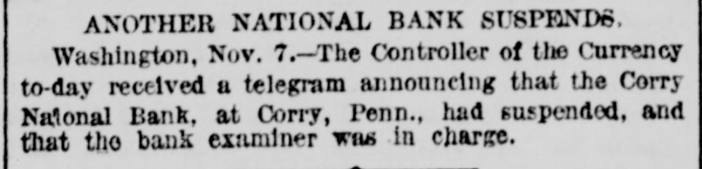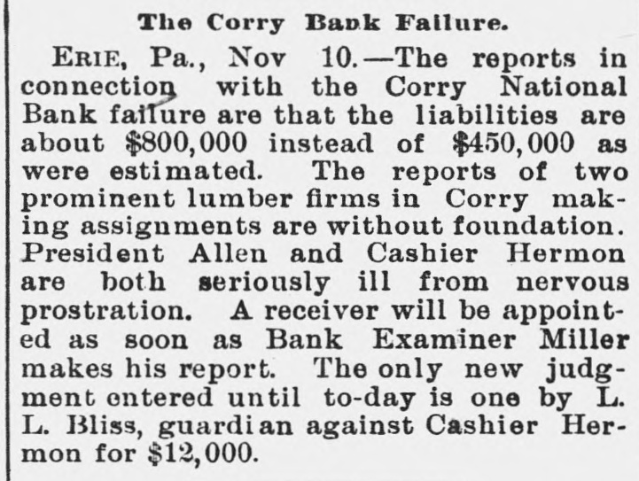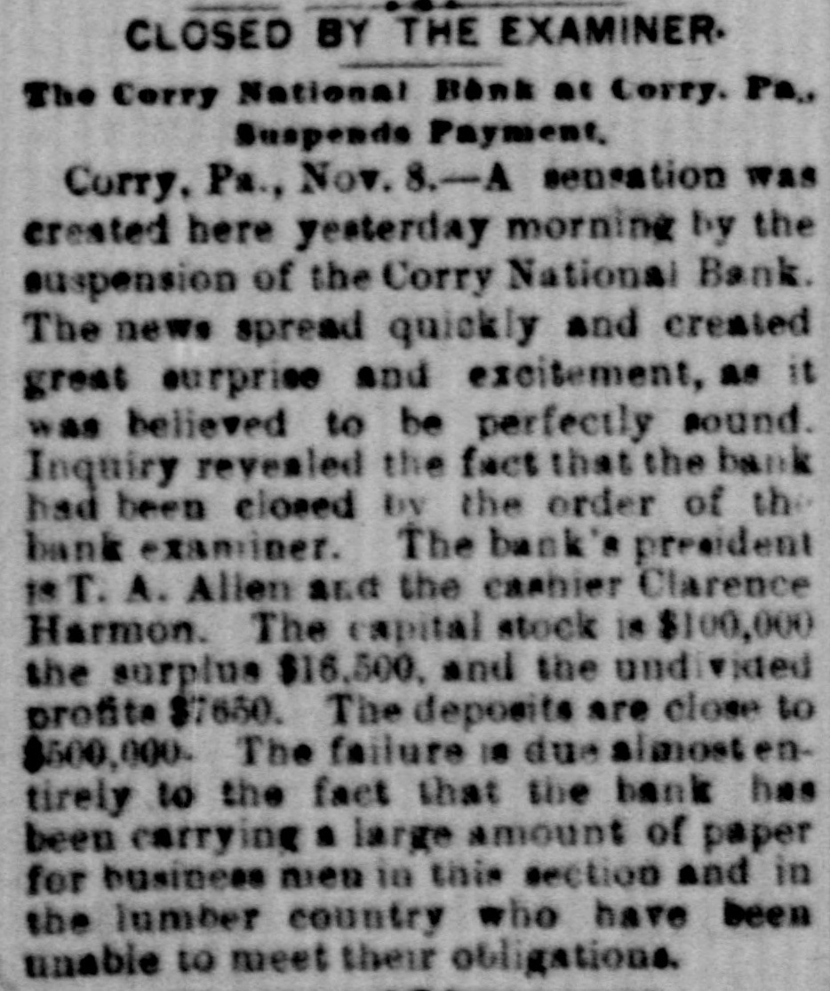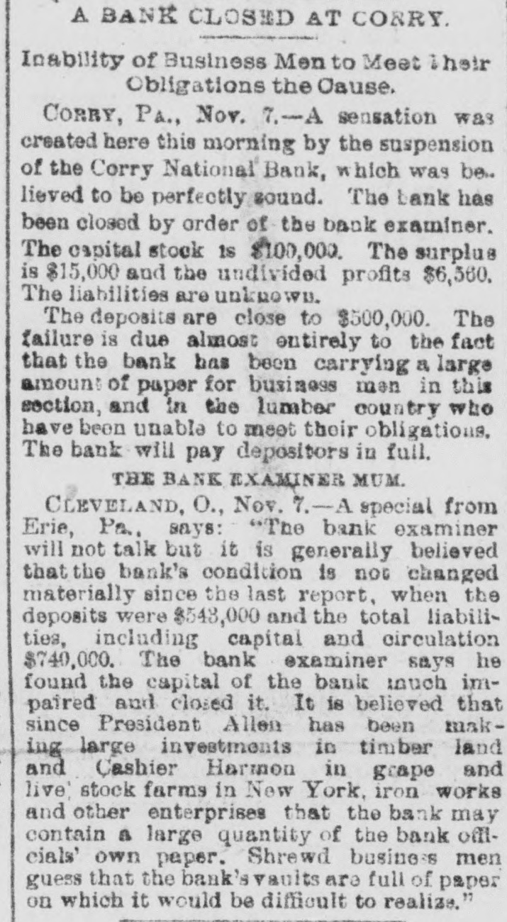 The Corry National Bank was closed by order of the bank examiner (Nov. 7–8, 1891) for impaired capital after heavy discounts/paper to local lumbermen could not be realized. No contemporaneous run is described; a receiver was appointed later (reported Nov. 20, 1891).