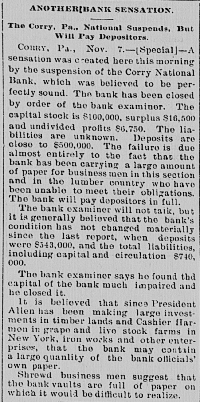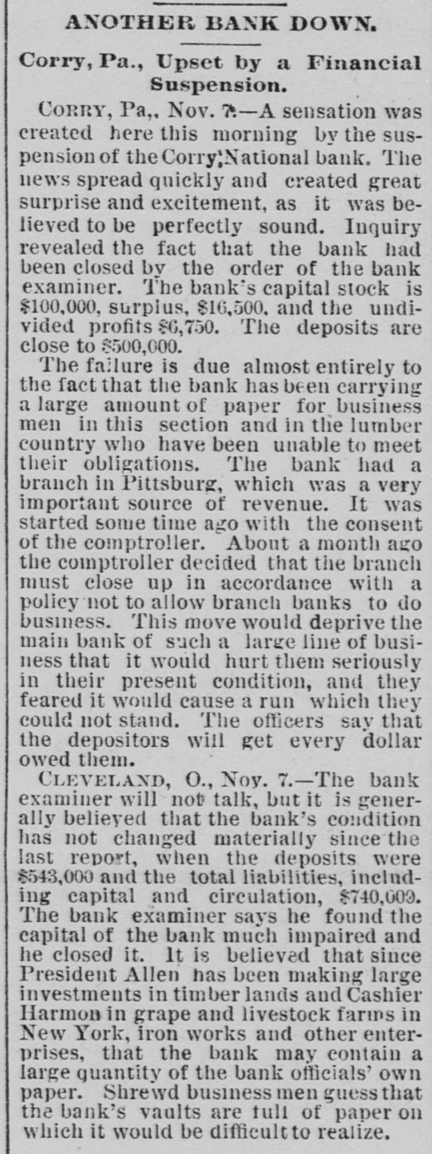 ANOTHER BANK DOWN. Corry, Pa., Upset by a Financial Suspension. CORRY, Pa,, Nov. ?-A sensation was created here this morning by the suspension of the Corry;National bank. The news spread quickly and created great surprise and excitement, as it was believed to be perfectly sound. Inquiry revealed the fact that the bank had been closed by the order of the bank examiner. The bank's capital stock is $100,000, surplus, $16,500. and the undivided profits $6,750. The deposits are close to $500,000. The failure is due almost entirely to the fact that the bank has been carrying a large amount of paper for business men in this section and in the lumber country who have been unable to meet their obligations. The bank had a branch in Pittsburg, which was a very important source of revenue. It was started some time ago with the consent of the comptroller. About a month ago the comptroller decided that the branch must close up in accordance with a policy not to allow branch banks to do business. This move would deprive the main bank of such a large line of business that it would hurt them seriously in their present condition, and they feared it would cause a run which they could not stand. The officers say that the depositors will get every dollar owed them. CLEVELAND, O., Noy. 7.-The bank examiner will not talk, but it is generally belieyed that the bank's condition has not changed materially since the last report, when the deposits were $543,000 and the total liabilities, including capital and circulation, $740,000. The bank examiner says he found the capital of the bank much impaired and he closed it. It is believed that since President Allen has been making large investments in timber lands and Cashier Harmon in grape and livestock farms in New York, iron works and other enterprises, that the bank may contain a large quantity of the bank officials' own paper. Shrewd business men guess that the bank's vaults are full of paper on which it would be difficultto realize.