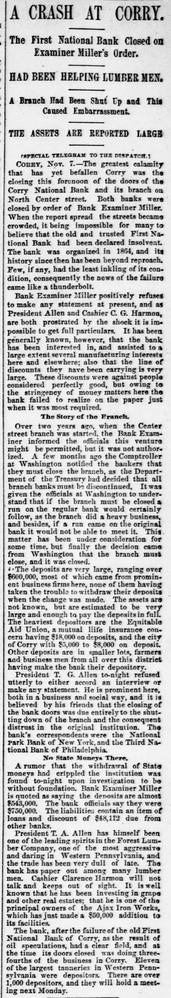A CRASH AT CORRY. The First National Bank Closed on Examiner Miller's Order. HAD BEEN HELPING LUMBER MEN. A Branch Had Been Shut Up and This Caused Embarrassment. THE ASSETS ARE REPORTED LARGE ISPECIAL TELEGRAM TO THE DISPATCH.1 CORRY, Nov. 7.-The greatest calamity that has yet befallen Corry was the closing this forenoon of the doors of the Corry National Bank and its branch on North Center street. Both banks were closed by order of Bank Examiner Miller. When the report spread the streets became crowded, it being impossible for many to believe that the old and trusted First Na. tional Bank had been declared insolvent. The bank was organized in 1864, and its history since then has been beyond reproach. Few, if any, had the least inkling of its condition, consequently the news of the failure came like a thunderbolt. Bank Examiner Miller positively refuses to make any statement at present, and as President Allen and Cashier C. G. Harmon, are both prostrated by the shock it is impossible to get full particulars. It has been generally known, however, that the bank has been interested in, and assisted to a large extent several manufacturing interests here and elsewhere; also that the line of discounts they have been carrying is very large. These discounts were against people considered perfectly good, but owing to the stringency of money matters here the bank failed to realize on the paper just when it was most required. The Story of the Branch. Over two years ago, when the Center street branch was started, the Bank Examiner informed the officials this venture might be permitted, but it was not authorized. A few months ago the Comptroller at Washington notified the bankers that they must close the branch, as the Department of the Treasury had decided that all branch banks must be discontinued, Itwas given the officials at Washington to understand that if the branch must be closed a run on the regular bank would certainly follow, as the branch did a heavy business, and besides, if a run came on the original bank it would not be able to meet it. This matter has been under consideration for some time. but finally the decision came from Washington that the branch must close, and it was closed. The deposits are very large, ranging over $600,000, most of which came from prominent business firms here, none of them having taken the trouble to withdraw their deposits when the change was made. The assets are not known, but are estimated to be very large and enough to pay the deposits in full. The heaviest depositors are the Equitable Aid Union, a mutual liife insurance concern having $18,000 on deposits, and the city of Corry with $5,000 to $8,000 on deposit. Other deposits are in smaller lots, farmers and business men from all over this district having make the bank their depository. President T. G. Allen to-night refused utterly to either accord an interview or make any statement. He is prominent here, both in a business and social way, and it is believed by his friends that the closing of the bank doors was due entirely to the shutting down of the branch and the consequent distrust in the original institution. The bank's correspondents were the National Park Bank of New York, and the Third Na. tional Bank of Philadelphia. No State Moneys There. A rumor that the withdrawal of State moneys had crippled the institution was found to-night upon investigation to be without foundation. Bank Examiner Miller is quoted as saying the deposits are almost $543,000. The bank officials say they were $750,000. The liabilities contain an item of loans and discount of $48,112 due from other banks. President T. A. Allen has himself been one of the leading spiritsin the Forest Lumber Company, one of the most aggressive and daring in Western Pennsylvania, and the trade has been very dull of late. The bank has paper out among many lumber men. Cashier Clarence Harmon will not talk and keeps out of sight. It is well known that he has been investing in grape and other real estates; that he is one of the principal owners of the Ajax Iron Works, which has just made a $50,000 addition to its facilities. The bank, after the failure of the old First National Bank of Corry, as the result of oil speculations, had a clear field, and at the time its doors closed was doing threefourths of the business in Corry. Eleven of the largest tanneries in Western Pennsylvania were depositors. There are over 1,000 depositors, and they will hold a meeting next Monday.