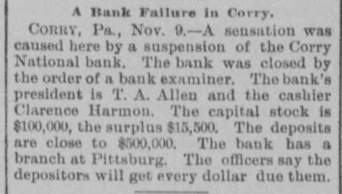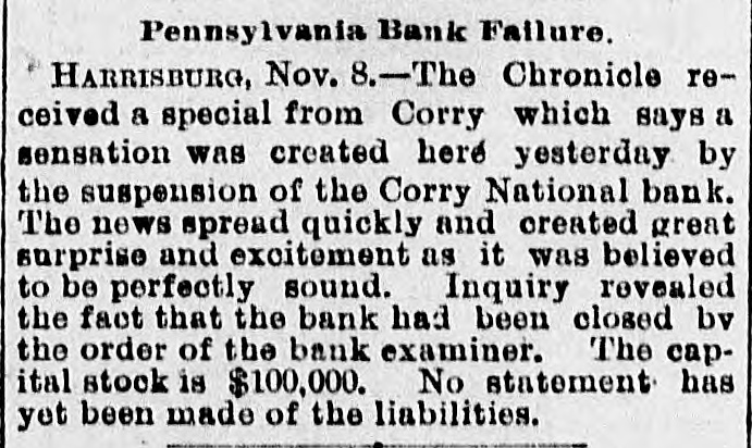 A sensation was created here this morning by the suspension of the Corry National Bank... The bank has been closed by order of the bank examiner.