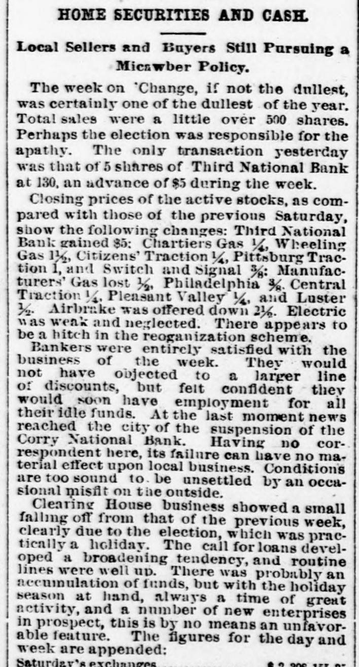 HOME SECURITIES AND CASH Local Sellers and Buyers Still Pursuing a Micawber Policy. The week on Change, if not the dullest, was certainly one of the dullest of the year. Total sales were a little over 500 shares. Perhaps the election was responsible for the apathy. The only transaction yesterday was that of 5 shares of Third National Bank at 130, an advance of $5 during the week. Closing prices of the active stocks, as compared with those of the previous Saturday, show the following changes: Third National Bank gained $5: Chartiers Gas 1/4, Wheeling Gas 11/2, Citizens' Traction 1/4, Pittsburg Traction 1, and Switch and Signal 3/8: Manufacturers' Gas lost 1/2, Philadelphia 3/8. Central Traction 1/4, Pleasant Valley 1/4, and Luster ½. Airbrake was offered down 2½. Electric was weak and neglected. There appears to be a hitch in the reoganization scheme. Bankers were entirely satisfied with the business of the week. They would not have objected to a larger line of discounts, but felt confident they would soon have employment for all their idle funds. At the last moment news reached the city of the suspension of the Corry National Bank. Having no correspondent here, its failure can have no material effect upon local business. Conditions are too sound to. be unsettled by an occasional misfit on the outside. Clearing House business showed a small falling off from that of the previous week, clearly due to the election, which was practically a holiday. The call for loans developed a broadening tendency, and routine lines were well up. There was probably an accumulation of funds, but with the holiday season at hand, always a time of great activity, and a number of new enterprises in prospect, this is by no means an unfavorable feature. The figures for the day and week are appended: $22001570 Saturday's exchanges