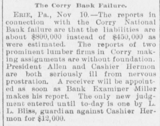 The Corry Bank Failure. ERIE, Pa., Nov 10.-The reports in connection with the Corry National Bank failure are that the liabilities are about $800,000 instead of $450,000 as were estimated. The reports of two prominent lumber firms in Corry making assignments are without foundation. President Allen and Cashier Hermon are both seriously ill from nervous prostration. A receiver will be appointed as soon as Bank Examiner Miller makes his report. The only new judgment entered until to-day is one by L. L. Bliss, guardian against Cashier Hermon for $12,000.