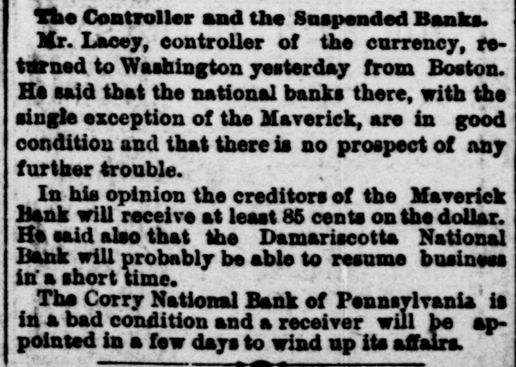 The Controller and the Suspended Banks. Mr. Lacey, controller of the currency, returned to Washington yesterday from Boston. He said that the national banks there, with the single exception of the Maverick, are in good condition and that there is no prospect of any further trouble. In his opinion the creditors of the Maverick Bank will receive at least 85 cents on the dollar. He said also that the Damariscotta National Bank will probably be able to resume business in a short time. The Corry National Bank of Pennsylvania is in a bad condition and a receiver will be appointed in a few days to wind up its affairs.