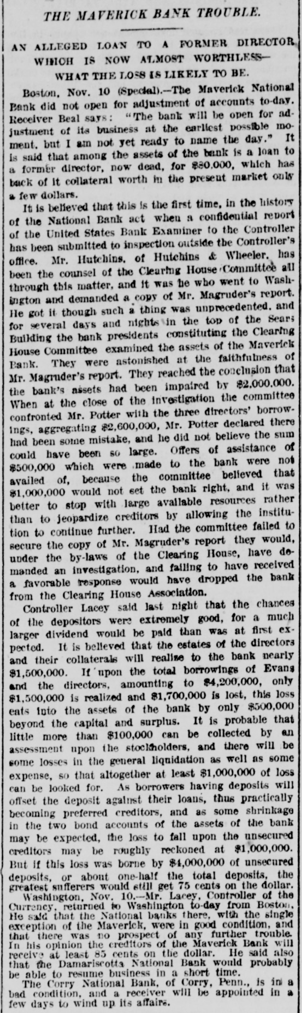 THE MAVERICK BANK TROUBLE. AN ALLEGED LOAN TO A FORMER DIRECTOR WHICH IS NOW ALMOST WORTHLESS WHAT THE LOSS IS LIKELY TO BE. Boston, Nov. 10 (Special).-The Maverick National Bank did not open for adjustment of accounts to-day. Receiver Beal says: "The bank will be open for adjustment of its business at the earliest possible moment. but I am not yet ready to name the day." It is said that among the assets of the bank is a loan to a former director, now dead, for $80,000, which has back of it collateral worth in the present market only few dollars. It is believed that this is the first time, in the history of the National Bank act when a confidential report of the United States Bank Examiner to the Controller has been submitted to inspection outside the Controller's office. Mr. Hutchins. of Hutchins & Wheeler. has been the counsel of the Clearing House Committee all through this matter, and it was he who went to Washington and demanded a copy of Mr. Magruder's report. He got it though such a thing was unprecedented. and for several days and nights in the top of the Sears Building the bank presidents constituting the Clearing House Committee examined the assets of the Maverick Bank. They were astonished at the faithfulness of Mr. Magruder's report. They reached the conclusion that the bank's assets had been impaired by $2,000,000. When at the close of the investigation the committee confronted Mr. Potter with the three directors' borrowings, aggregating $2,600,000, Mr. Potter declared there had been some mistake, and he did not believe the sum could have been SO large. Offers of assistance of $500,000 which were made to the bank were not availed of, because the committee believed that $1,000,000 would not set the bank right, and it was better to stop with large available resources rather than to jeopardize creditors by allowing the institution to continue further. Had the committee failed to secure the copy of Mr. Magruder's report they would, under the by-laws of the Clearing House, have demanded an investigation, and failing to have received a favorable response would have dropped the bank from the Clearing House Association. Controller Lacey said last night that the chances of the depositors were extremely good, for a much larger dividend would be paid than was at first expected. It is believed that the estates of the directors and their collaterals will realize to the bank nearly $1,500,000. If upon the total borrowings of Evans and the directors, amounting to $4,200,000, only $1,500,000 is realized and $1,700,000 is lost, this loss eats into the assets of the bank by only $500,000 beyond the capital and surplus. It is probable that little more than $100,000 can be collected by an assessment upon the stockholders, and there will be some losses in the general liquidation as well as some expense, SO that altogether at least $1,000,000 of loss can be looked for. As borrowers having deposits will offset the deposit against their loans, thus practically becoming preferred creditors, and as some shrinkage in the two bond accounts of the assets of the bank may be expected, the loss to fall upon the unsecured creditors may be roughly reckoned at $1,000,000. But if this loss was borne by $4,000,000 of unsecured deposits, or about one-half the total deposits, the greatest sufferers would still get 75 cents on the dollar. Washington, Nov. 10.-Mr. Lacey, Controller of the Currency, returned to Washington to-day from Boston, He said that the National banks there, with the single exception of the Maverick, were in good condition, and that there was no prospect of any further trouble. In his opinion the creditors of the Maverick Bank will receive at least 85 cents on the dollar. He said also that the Damariscotta National Bank would probably be able to resume business in a short time. The Corry National Bank, of Corry, Penn., is in a bad condition, and a receiver will be appointed in a few days to wind up its affairs.
