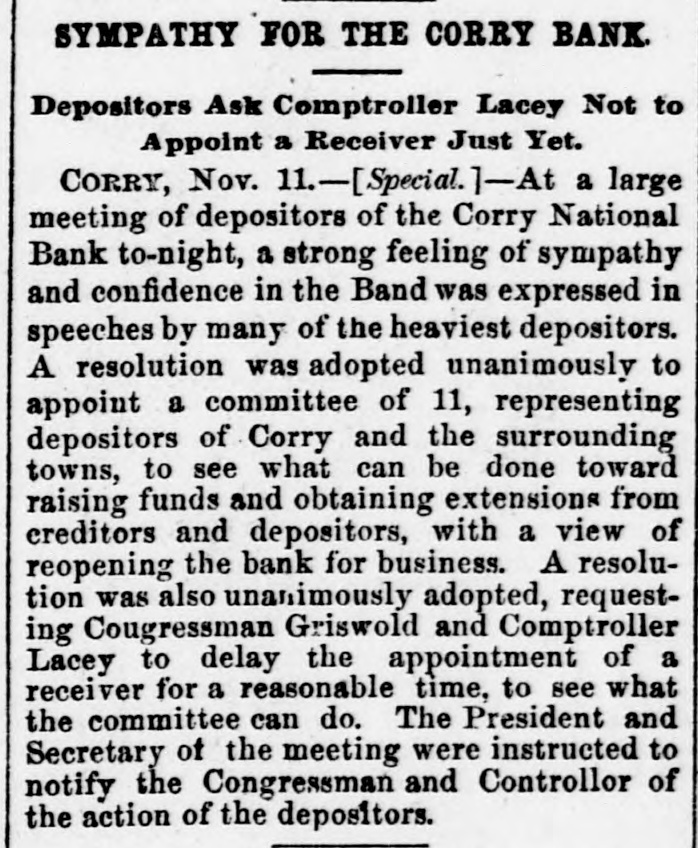 SYMPATHY FOR THE CORRY BANK. I Depositors Ask Comptroller Lacey Not to Appoint a Receiver Just Yet. CORRY, Nov. 11.-[Special.]-At a large meeting of depositors of the Corry National Bank to-night, a strong feeling of sympathy and confidence in the Band was expressed in speeches by many of the heaviest depositors. A resolution was adopted unanimously to appoint a committee of 11, representing depositors of Corry and the surrounding towns, to see what can be done toward raising funds and obtaining extensions from creditors and depositors, with a view of reopening the bank for business. A resolution was also unanimously adopted, requesting Cougressman Griswold and Comptroller Lacey to delay the appointment of a receiver for a reasonable time, to see what the committee can do. The President and Secretary of the meeting were instructed to notify the Congressman and Controllor of the action of the depositors.