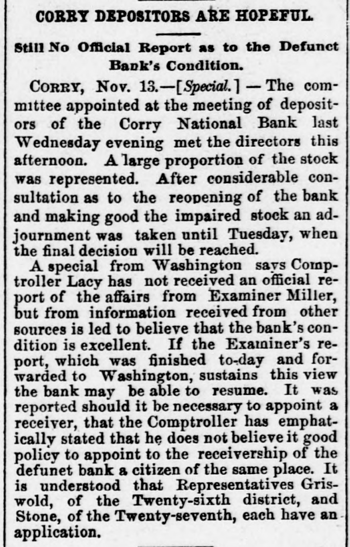 CORRY DEPOSITORS ARE HOPEFUL Still No Official Report as to the Defunct Bank's Condition. CORRY, Nov. 13.-[Special.] - The committee appointed at the meeting of depositors of the Corry National Bank last Wednesday evening met the directors this afternoon. A large proportion of the stock was represented. After considerable consultation as to the reopening of the bank and making good the impaired stock an adjournment was taken until Tuesday, when the final decision will be reached. A special from Washington savs Comptroller Lacy has not received an official report of the affairs from Examiner Miller, but from information received from other sources is led to believe that the bank's condition is excellent. If the Examiner's report, which was finished to-day and forwarded to Washington, sustains this view the bank may be able to resume. It was reported should it be necessary to appoint a receiver, that the Comptroller has emphatically stated that he does not believe it good policy to appoint to the receivership of the defunet bank a citizen of the same place. It is understood that Representatives Griswold, of the Twenty-sixth district, and Stone, of the Twenty-seventh, each have an application.
