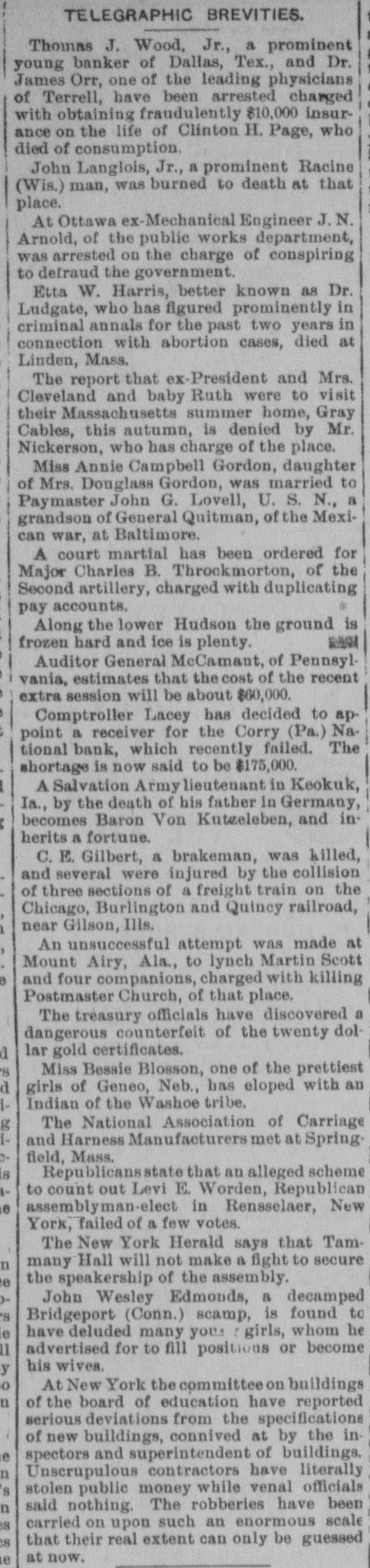 TELEGRAPHIC BREVITIES. Thomas J. Wood, Jr., a prominent young banker of Dallas, Tex., and Dr. James Orr, one of the leading physicians of Terrell, have been arrested charged with obtaining fraudulently $10,000 insurance on the life of Clinton H. Page, who died of consumption. John Langlois, Jr., a prominent Racine (Wis.) man, was burned to death at that place. At Ottawa ex-Mechanical Engineer J.N. Arnold, of the public works department, was arrested on the charge of conspiring to defraud the government. Etta W. Harris, better known as Dr. Ludgate, who has figured prominently in criminal annals for the past two years in connection with abortion cases, died at Linden, Mass. The report that ex-President and Mrs. Cleveland and baby Ruth were to visit their Massachusetts summer home, Gray Cables, this autumn, is denied by Mr. Nickerson, who has charge of the place. Miss Annie Campbell Gordon, daughter of Mrs. Douglass Gordon, was married to Paymaster John G. Lovell, U. S. N., a grandson of General Quitman, of the Mexican war, at Baltimore. A court martial has been ordered for Major Charles B. Throckmorton, of the Second artillery, charged with duplicating pay accounts. Along the lower Hudson the ground is was frozen hard and ice is plenty. Auditor General McCamant, of Pennsylvania, estimates that the cost of the recent extra session will be about $60,000. Comptroller Lacey has decided to appoint a receiver for the Corry (Pa.) National bank, which recently failed. The shortage is now said to be $175,000. A Salvation Army lieutenant in Keokuk, Ia., by the death of his father in Germany, becomes Baron Von Kutzeleben, and inherits a fortune. C. E. Gilbert, a brakeman, was killed, and several were injured by the collision of three sections of a freight train on the Chicago, Burlington and Quincy railroad, near Gilson, Ills. An unsuccessful attempt was made at Mount Airy, Ala., to lynch Martin Scott and four companions, charged with killing Postmaster Church, of that place. The treasury officials have discovered a dangerous counterfeit of the twenty dola lar gold certificates. Miss Bessie Blosson, one of the prettiest girls of Geneo, Neb., has eloped with an Indian of the Washoe tribe. g The National Association of Carriage and Harness Manufacturers met at Spring field, Mass. S Republicansstate that an alleged scheme to count out Levi E. Worden, Republican e assemblyman-elect in Rensselaer, New York, failed of a few votes. The New York Herald says that Tamn many Hall will not make a fight to secure e the speakership of the assembly. John Wesley Edmonds, a decamped 'S Bridgeport (Conn.) scamp, is found to e have deluded many you. : girls, whom he 11 advertised for to fill positions or become his wives. y o At New York the committee on buildings n of the board of education have reported serious deviations from the specifications of new buildings, connived at by the ine spectors and superintendent of buildings. n Unscrupulous contractors have literally S stolen public money while venal officials n said nothing. The robberies have been is carried on upon such an enormous scale that their real extent can only be guessed s at now. le