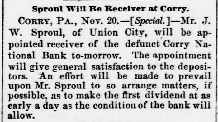 It is probable that Comptroller Lacey will to-morrow appoint a receiver for the defunct Corry National Bank... Mr. J. W. Sproul, of Union City, will be appointed receiver of the defunct Corry National Bank to-morrow.