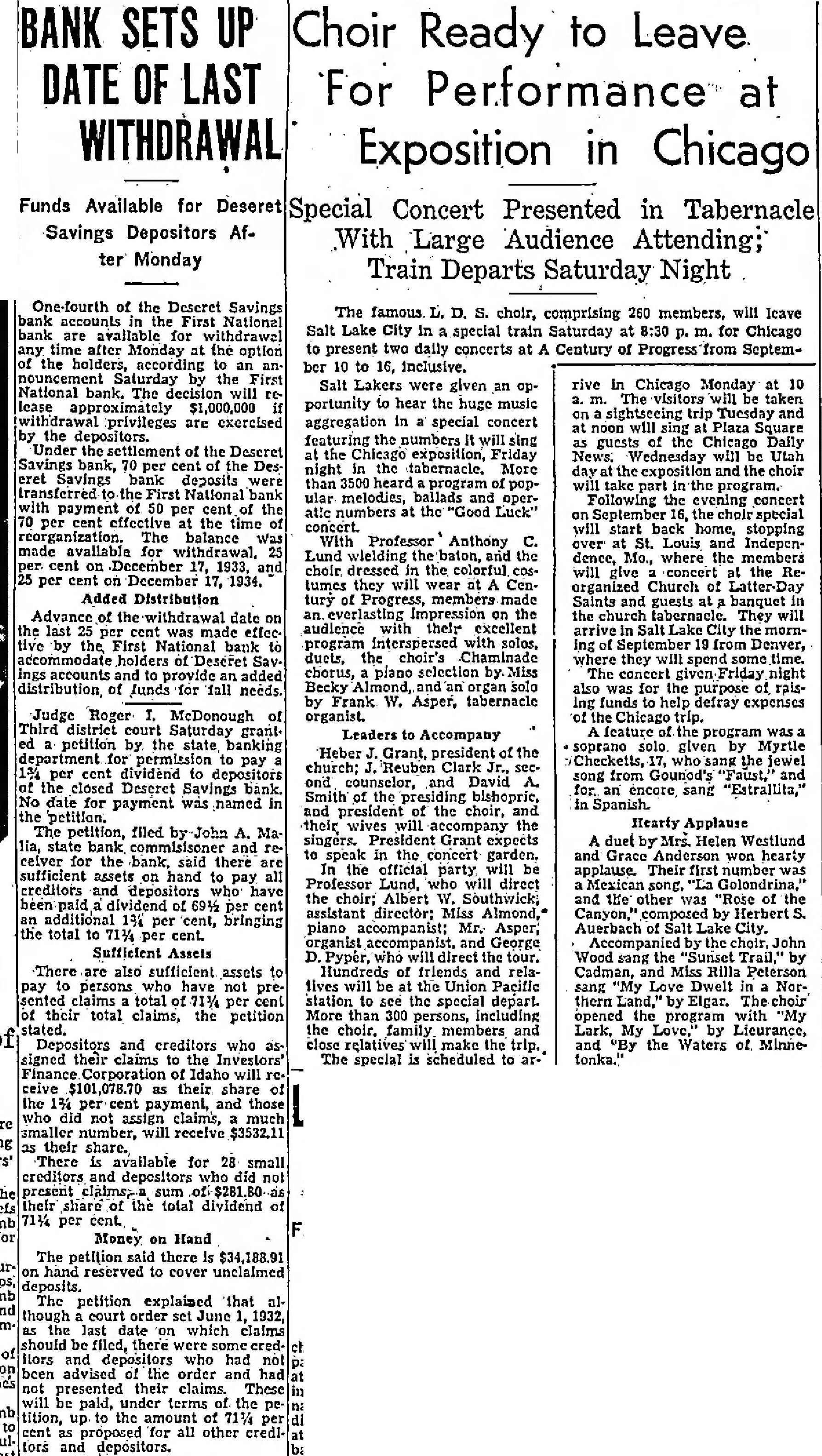 Leaders to Accompany Heber president of the church; Reuben Clark counselor, and David Smith of the presiding bishopric, and president the choir, their will accompany the singers. Grant expects to speak in the concert garden. In the official party will be Professor Lund, who will direct choir; Albert W. Southwick, assistant director: Miss Almond, piano accompanist; Mr. Asper, organist and George D. Pyper, who the tour. Hundreds of friends relatives will be at the Union Pacifle station to see the special depart. More than 300 persons, including the choir. family members and close relatives make The special scheduled to rive in Chicago Monday at 10 visitors be taken and noon will sing Plaza Square guests of the Chicago Daily Wednesday will be Utah the exposition the take the program. Following the evening concert September will start back home, stopping over at St. Louis Independence, Mo., where the members will concert the Reorganized Church Saints and guests banquet the church tabernacle. They will Lake mornof September from Denver, where they spend The concert Friday night also was for the purpose of raising funds to help defray expenses the Chicago feature of the program soprano solo given by Myrtle Checketts, sang the jewel song from Gounod's and for encore sang "Estrallita," in Spanish.