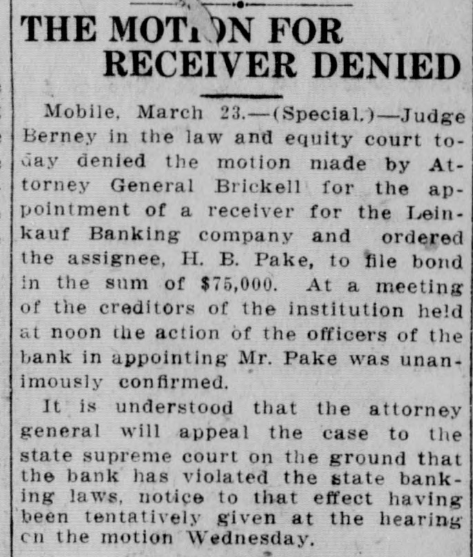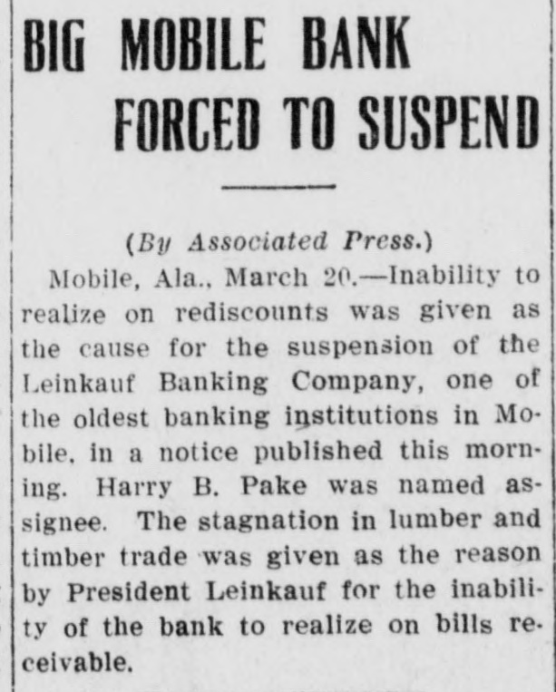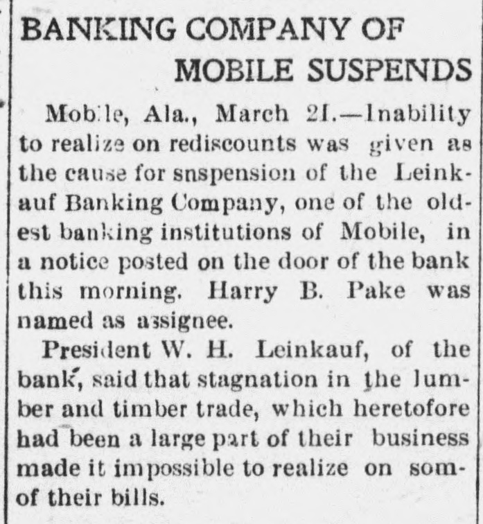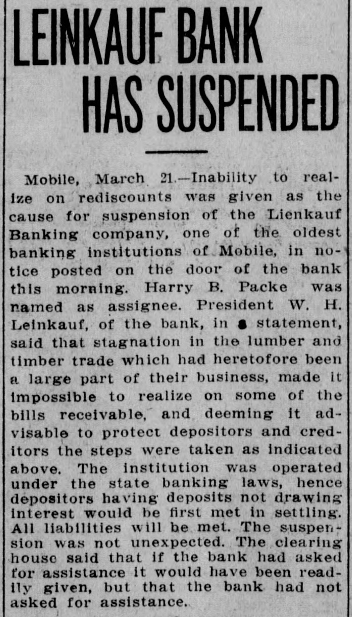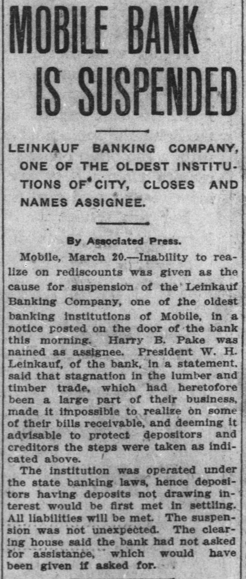 MOBILE BANK IS SUSPENDED LEINKAUF BANKING COMPANY, ONE OF THE OLDEST INSTITUTIONS OF CITY, CLOSES AND NAMES ASSIGNEE. By Associated Press. Mobile, March 20.-Inability to realize on rediscounts was given as the cause for suspension of the' Leinkauf Banking Company, one of the oldest banking institutions of Mobile, in a notice posted on the door of the bank this morning. Harry B. Pake was nained as assignee. President W. H. Leinkauf, of the bank, in a statement, said that stagnation in the lumber and timber trade, which had heretofore been a large part of their business, made it impossible to realize on some of their bills receivable, and deeming it advisable to protect depositors and creditors the steps were taken as indicated above. The institution was operated under the state banking laws, hence depositors having deposits not drawing interest would be first met in settling. All liabilities will be met. The suspension was not unexpected. The clearing house said the bank had not asked for assistance, which would have been given if asked for.