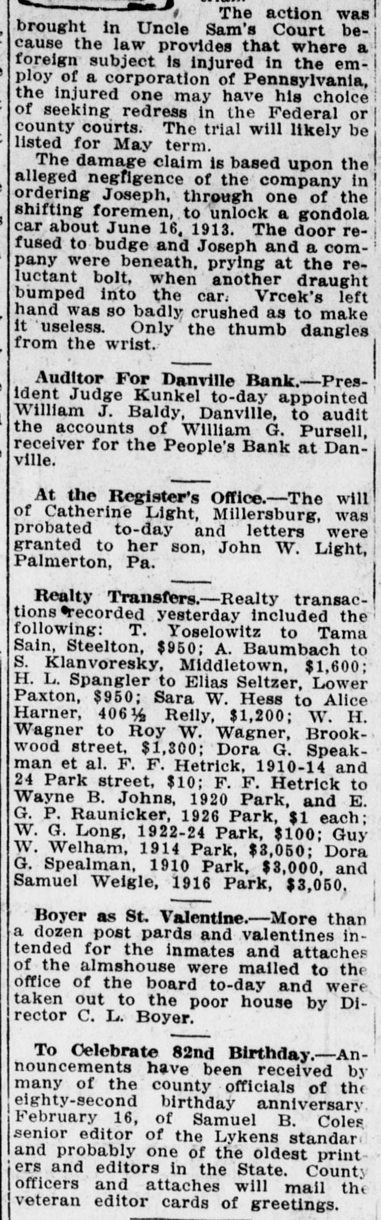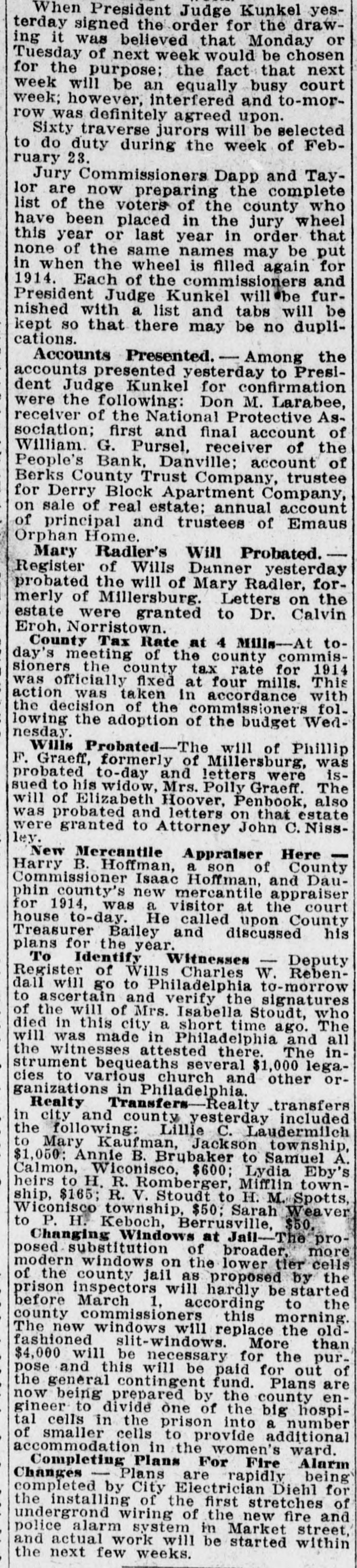 When President Judge Kunkel yesterday signed the order for the drawing it was believed that Monday or Tuesday of next week would be chosen for the purpose; the fact that next week will be an equally busy court week; however, interfered and to-morrow was definitely agreed upon. Sixty traverse jurors will be selected to do duty during the week of February 23. Jury Commissioners Dapp and Taylor are now preparing the complete list of the voters of the county who have been placed in the jury wheel this year or last year in order that none of the same names may be put in when the wheel is filled again for 1914. Each of the commissioners and President Judge Kunkel will be furnished with a list and tabs will be kept so that there may be no duplications. Accounts Presented. - Among the accounts presented yesterday to President Judge Kunkel for confirmation were the following: Don M. Larabee, receiver of the National Protective Association; first and final account of William. G. Pursel, receiver of the People's Bank, Danville; account of Berks County Trust Company, trustee for Derry Block Apartment Company, on sale of real estate; annual account of principal and trustees of Emaus Orphan Home. Mary Radler's Will Probated. Register of Wills Danner yesterday probated the will of Mary Radler, formerly of Millersburg. Letters on the estate were granted to Dr. Calvin Eroh, Norristown. County Tax Rate at 4 Mills-At today's meeting of the county commissioners the county tax rate for 1914 was officially fixed at four mills. This action was taken in accordance with the decision of the commissioners following the adoption of the budget Wednesday. Wills Probated-The will of Phillip F. Graeff, formerly of Millersburg, was probated to-day and letters were issued to his widow, Mrs. Polly Graeff. The will of Elizabeth Hoover, Penbook, also was probated and letters on that estate ley. were granted to Attorney John C. NissNew Mercantile Appraiser Here Harry B. Hoffman, a son of County Commissioner Isaac Hoffman, and Dauphin county's new mercantile appraiser for 1914, was a visitor at the court house to-day. He called upon County Treasurer Bailey and discussed his plans for the year. To Identify Witnesses - Deputy Register of Wills Charles W. Rebendall will go to Philadelphia to-morrow to ascertain and verify the signatures of the will of Mrs. Isabella Stoudt, who died in this city a short time ago. The will was made in Philadelphia and all the witnesses attested there. The instrument bequeaths several $1,000 legacies to various church and other organizations in Philadelphia. Realty Transfers Realty transfers in city and county yesterday included the following: Lillie C. Laudermilch to Mary Kaufman, Jackson township, $1,050; Annie B. Brubaker to Samuel A. Calmon, Wiconisco, $600; Lydia Eby's heirs to H. R. Romberger, Mifflin township, $165; R. V. Stoudt to H. M. Spotts, Wiconisco township, $50; Sarah Weaver to P. H. Keboch, Berrusville, $50, Changing Windows at Jail-The proposed substitution of broader, more modern windows on the lower tler cells of the county jail as proposed by the prison inspectors will hardly be started before March 1, according to the county commissioners this