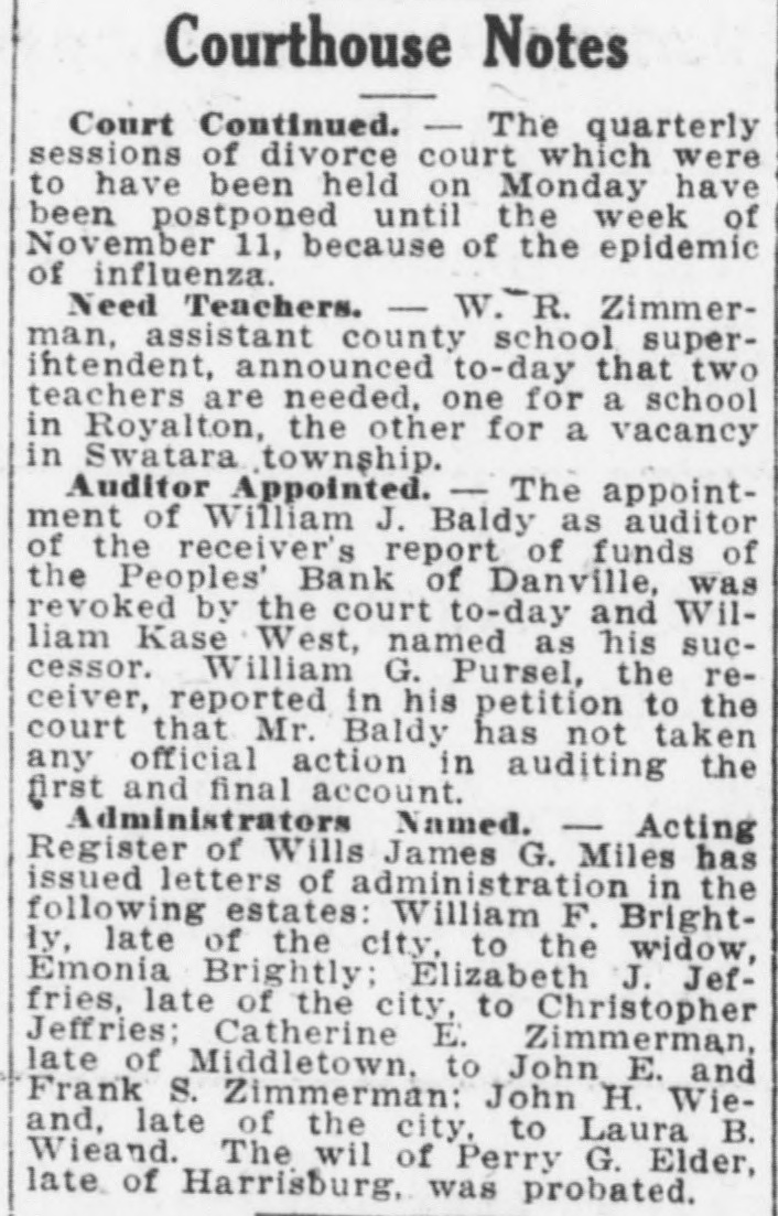 Courthouse Notes Court Continued. - The quarterly sessions of divorce court which were to have been held on Monday have been postponed until the week of November 11, because of the epidemic of influenza. Need Teachers. - W.R. Zimmerman, assistant county school superintendent, announced to-day that two teachers are needed, one for a school in Royalton, the other for a vacancy in Swatara township. Auditor Appointed. - The appointment of William J. Baldy as auditor of the receiver's report of funds of the Peoples' Bank of Danville, was revoked by the court to-day and William Kase West, named as his successor. William G. Pursel, the receiver, reported in his petition to the court that Mr. Baldy has not taken any official action in auditing the first and final account. Administrators Named. - Acting Register of Wills James G. Miles has issued letters of administration in the following estates: William F. Brightly, late of the city, to the widow, Emonia Brightly; Elizabeth J. Jeffries, late of the city, to Christopher Jeffries; Catherine E. Zimmerman, late of Middletown. to John E. and Frank S. Zimmerman: John H. Wieand, late of the city, to Laura B. Wieand. The wil of Perry G. Elder, late of Harrisburg, was probated.