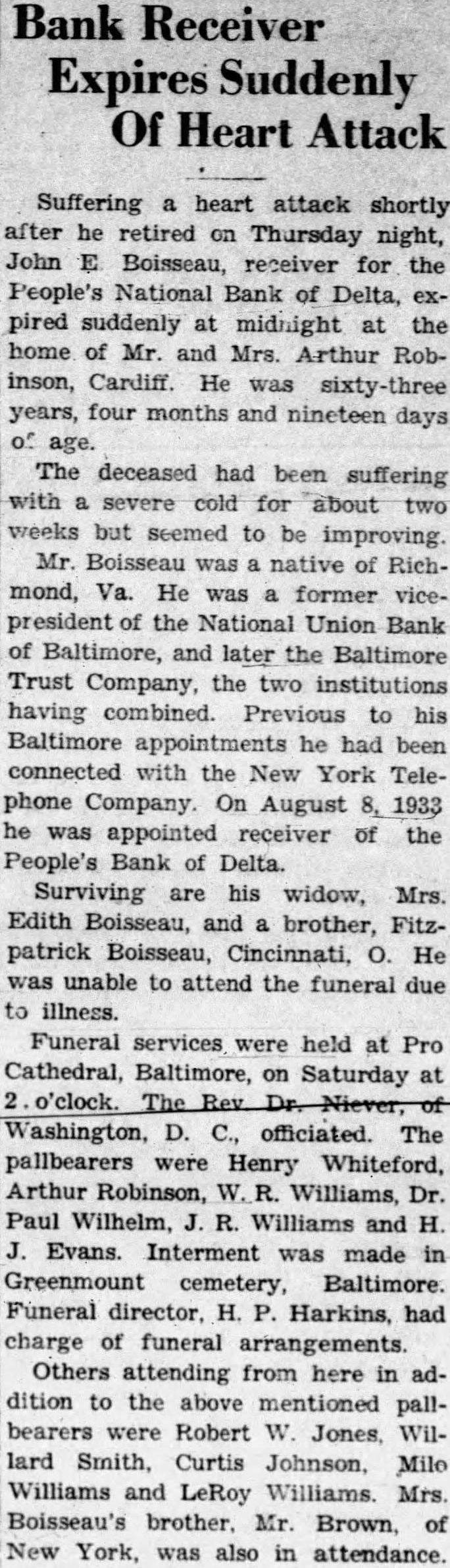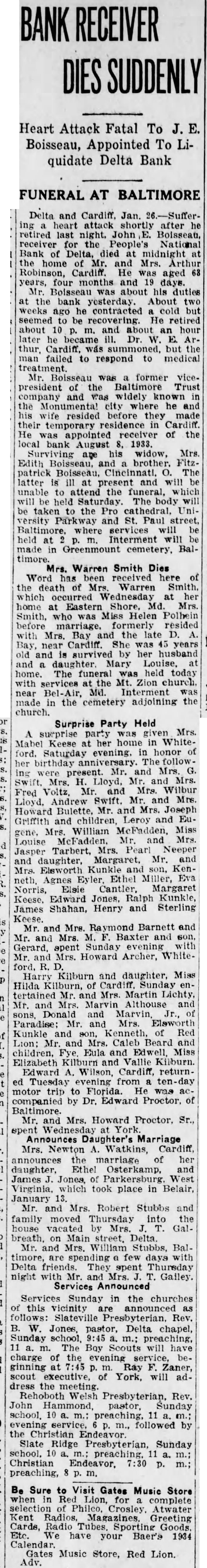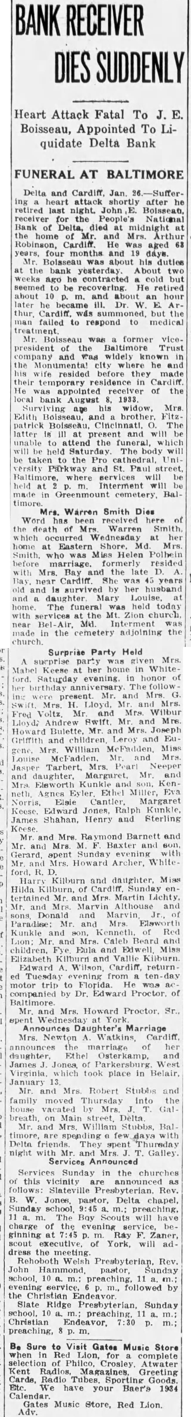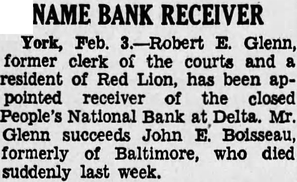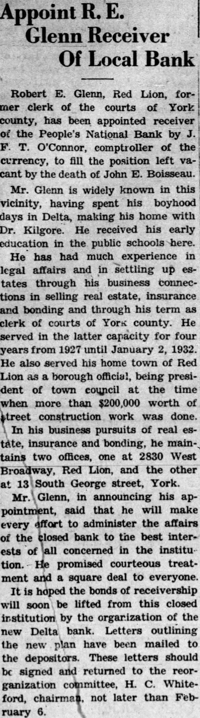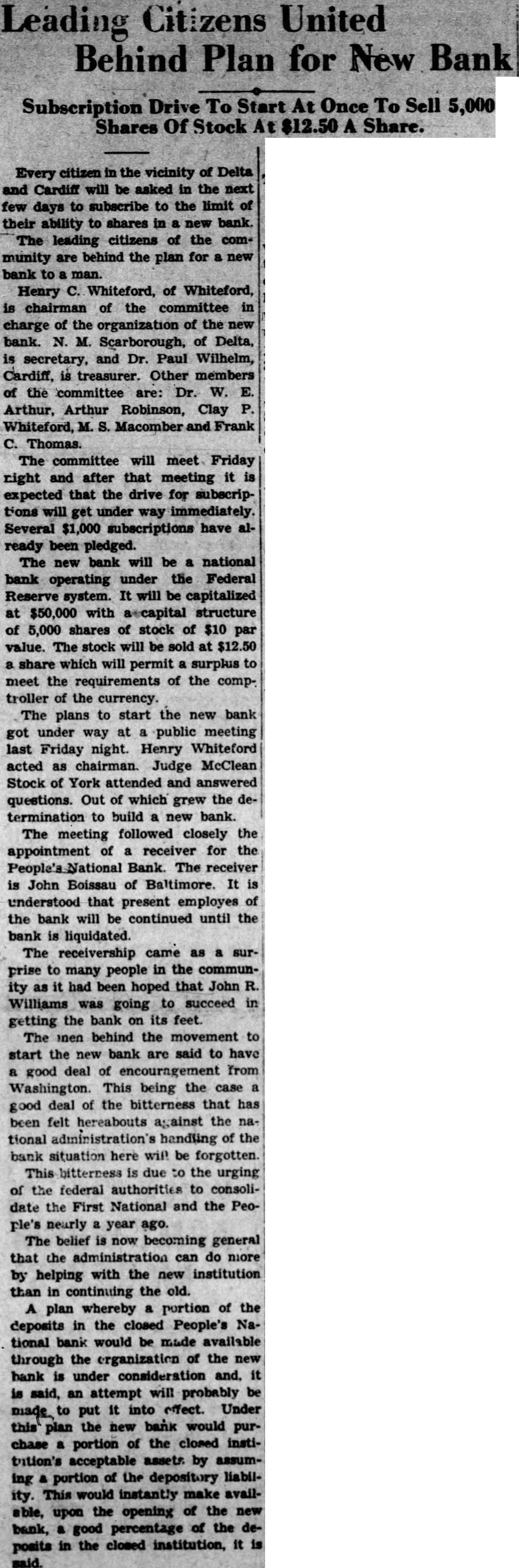 Leading Citizens United Behind Plan for New Bank Subscription Drive To Start Once To Sell 5,000 Shares Of Share. Every citizen in the vicinity of Delta and Cardiff will be asked in the next few days to subscribe to the limit of their ability to shares in new bank. The leading citizens of the community are behind the plan for a new bank to man. Henry Whiteford, of Whiteford, is chairman of the committee in charge of the organization of the new bank. N. M. Scarborough, of Delta, is secretary, and Dr. Paul Wilhelm, Cardiff, is treasurer. Other members of the committee are: Dr. W. E. Arthur, Arthur Robinson, Clay Whiteford, Macomber and Frank C. Thomas. The committee will meet Friday right and after that meeting it is expected that the drive for subscriptions will get under way immediately. Several $1,000 subscriptions have already been pledged. The new bank will be a national bank operating under the Federal Reserve system. It will be capitalized at $50,000 with accapital structure of 5,000 shares of stock of $10 par value. The stock will be sold at $12.50 share which will permit surplus to meet the requirements of the comptroller of the currency. The plans to start the new bank got under way at public meeting last Friday night. Henry Whiteford acted as chairman. Judge McClean Stock of York attended and answered questions. Out of which grew the determination to build new bank. The meeting followed closely the appointment of a receiver for the Bank. The receiver is John Boissau of Baltimore. It understood that present employes of the bank will be continued until the bank is liquidated. The receivership came as surprise to many people in the community as it had been hoped that John R. Williams was going to succeed in getting the bank on its feet. The inen behind the movement to start the new bank are said to have good deal of encouragement from Washington. This being the case good deal of the bitterness that has been felt hereabouts against the national administration's handling of the bank situation here will be forgotten. This bitterness is due to the urging of the federal authorities to consolidate the First National and the People's nearly year ago. The belief is now becoming general that the administration can do more by helping with the new institution than in continuing the old. A plan whereby portion of the deposits in the closed People's National bank would be made available through the organization of the new bank is under consideration and. is said, an attempt will probably be made to put it into effect. Under this the new bank would purchase portion of the closed institution's acceptable assets by ing portion of the depository liability. This would instantly make available, upon the opening of the new bank, good percentage of the deposits in the closed institution, it said.