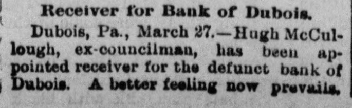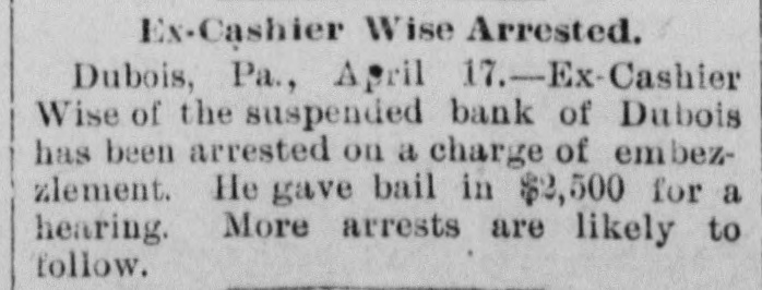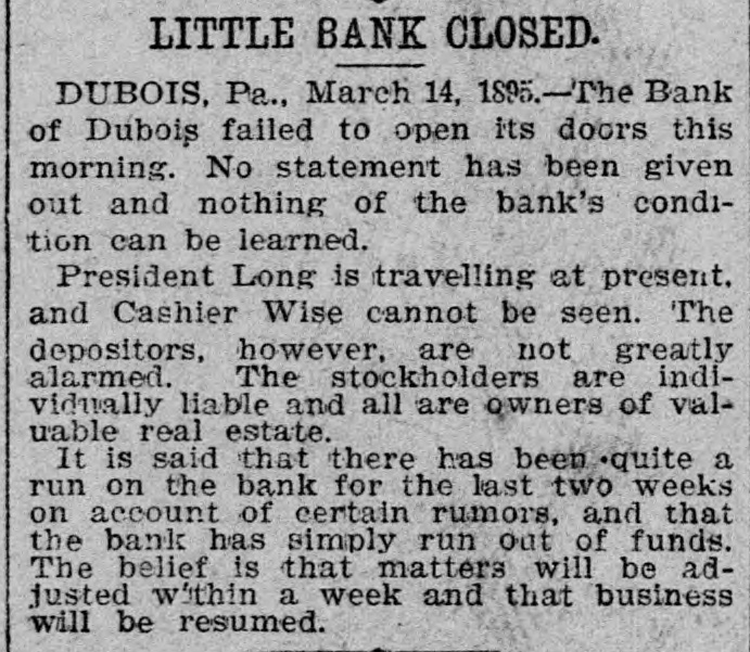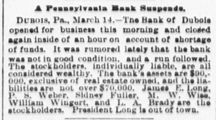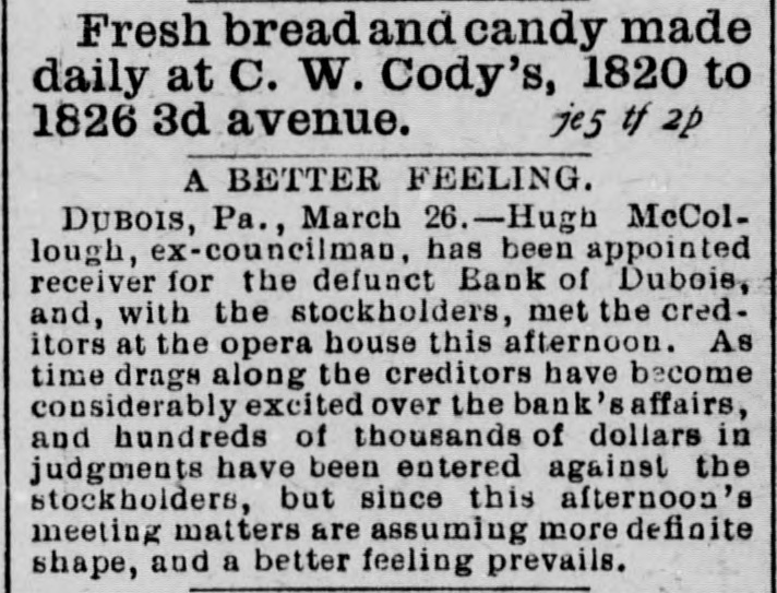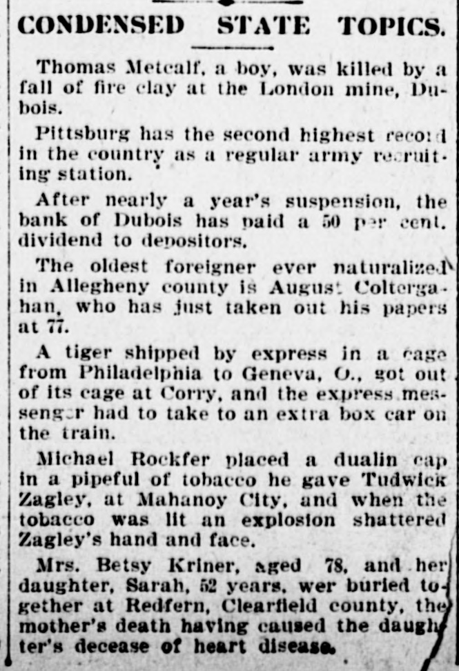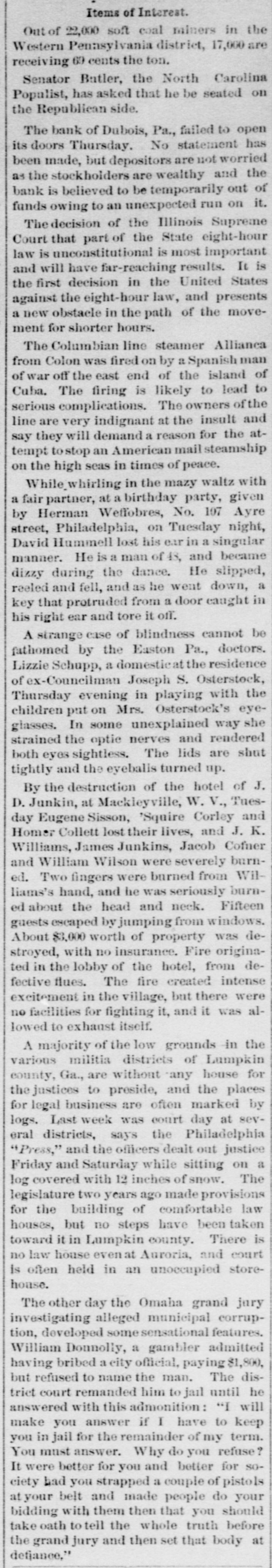 Out of 22,000 soft coal miners in the Western Pennsylvania district, 17,000 are receiving 69 cents the ton. Senator Batler, the North Carolina Populist, has asked that he be seated on the Republican side. The bank of Dubois, Pa., failed to open its doors Thursday. No statement has been made, but depositors are not worried as the stockholders are wealthy and the bank is believed to be temporarily out of funds owing to an unexpected run on it. The decision of the Illinois Supreme Court that part of the State eight-hour law is unconstitutional is most important and will have far-reaching results. It is the first decision in the United States against the eight-hour law, and presents a new obstacle in the path of the movement for shorter hours. The Columbian line steamer Allianca from Colon was fired on by a Spanish man of war off the east end of the island of Cuba. The firing is likely to lead to serious complications. The owners of the line are very indignant at the insult and say they will demand a reason for the attempt tostop an American mail steamship on the high seas in times of peace. While whirling in the mazy waltz with a fair partner, at a birthday party, given by Herman Weffobres, No. 107 Ayre street, Philadelphia, on Tuesday night, David Hummell lost his ear in a singular manner. He is a man of 48, and became dizzy during the dance. He slipped, reeled and fell, and as he went down, a key that protruded from a door caught in his right ear and tore it off. A strange case of blindness cannot be fathomed by the Easton Pa., doctors. Lizzie Schupp, a domesticat the residence of ex-Councilman Joseph S. Osterstock, Thursday evening in playing with the children put on Mrs. Osterstock's eyeglasses. In some unexplained way she strained the optic nerves and rendered both eyes sightless. The lids are shut tightly and the eyeballs turned up. By the destruction of the hotel of J. D. Junkin, at Mackleyville, W. V., Tuesday Eugene Sisson, 'Squire Corley and Homer Collett lost their lives, and J. K. Williams, James Junkins, Jacob Cofner and William Wilson were severely burned. Two fingers were burned from Williams's hand, and he was seriously burned about the head and neck. Fifteen guests escaped by jumping from windows. About $3,000 worth of property was destroyed, with no insurance. Fire originated in the lobby of the hotel, from defective flues. The fire created intense excitement in the village, but there were no facilities for fighting it, and it was allowed to exhaust itself. A majority of the low grounds in the various militia districts of Lumpkin county, Ga., are without any house for the justices to preside, and the places for legal business are often marked by logs. Last week was court day at several districts, says the Philadelphia "Press," and the officers dealt out justice Friday and Saturday while sitting on a log covered with 12 inches of snow. The legislature two years ago made provisions for the building of comfortable law houses, but no steps have been taken toward it in Lumpkin county. There is no law house evenat Auroria, and court is often held in an unoccupied storehouse. The other day the Omaha grand jury investigating alleged municipal corruption, developed somesensational features. William Donnolly, a gambler admitted having bribed a city official, paying $1,800, but refused to name the man. The distriet court remanded him to jail until he answered with this admonition "I will make you answer if I have to keep you in jail for the remainder of my term. You must answer. Why do you refuse ? It were better for you and better for society had you strapped a couple of pistols