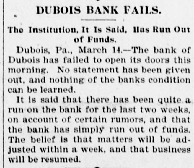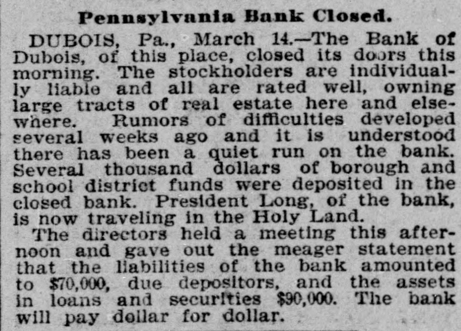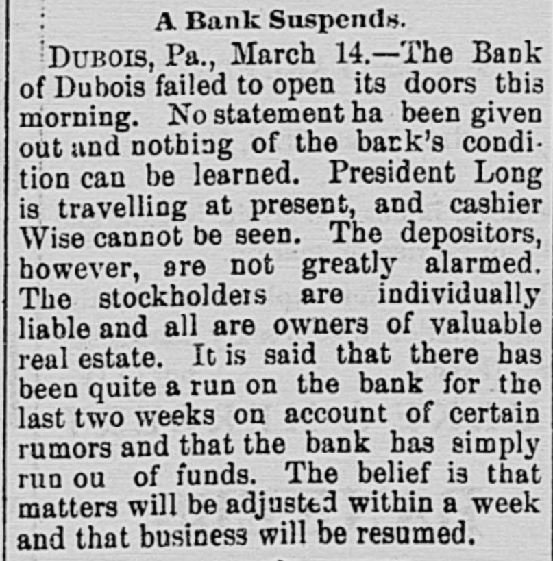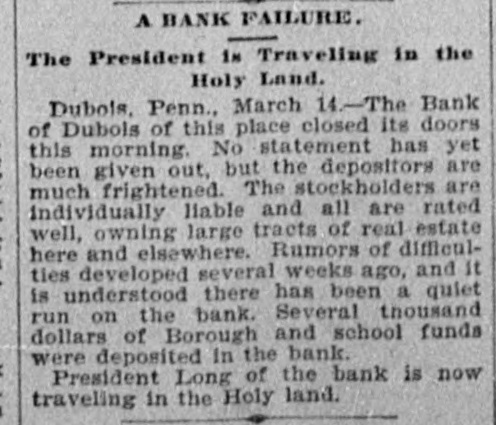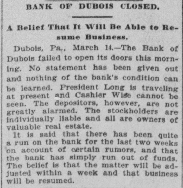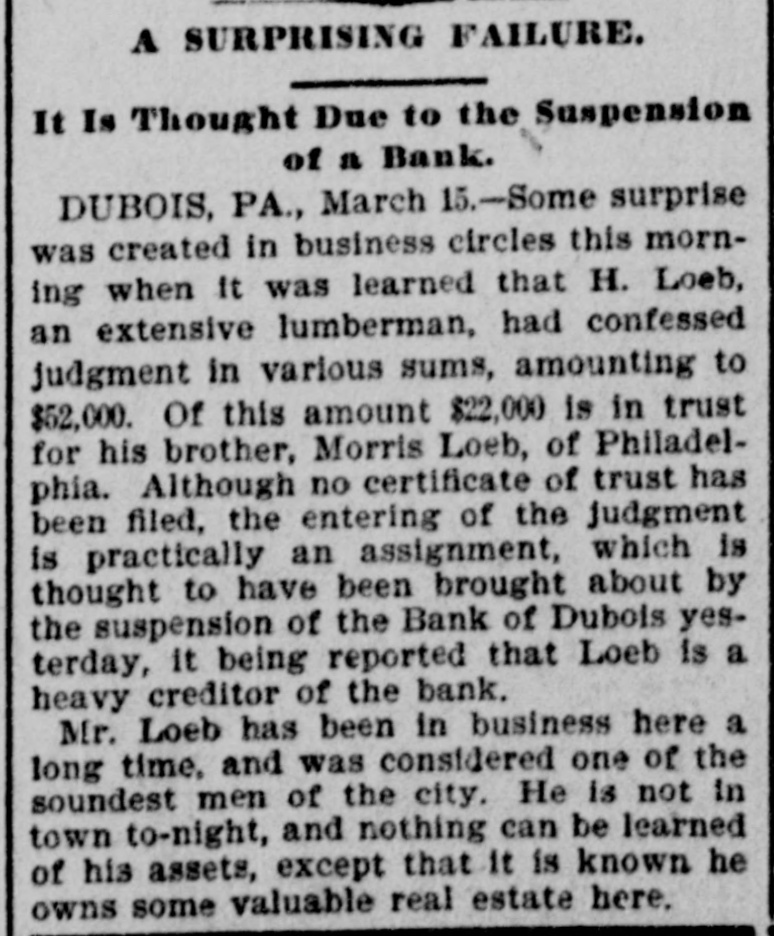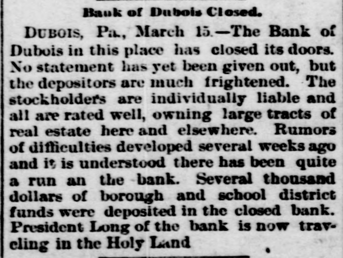 Out of 22,000 soft coal miners in the Western Pennsylvania district, 17,000 are receiving 69 cents the ton. Senator Batler, the North Carolina Populist, has asked that he be seated on the Republican side. The bank of Dubois, Pa., failed to open its doors Thursday. No statement has been made, but depositors are not worried as the stockholders are wealthy and the bank is believed to be temporarily out of funds owing to an unexpected run on it. The decision of the Illinois Supreme Court that part of the State eight-hour law is unconstitutional is most important and will have far-reaching results. It is the first decision in the United States against the eight-hour law, and presents a new obstacle in the path of the movement for shorter hours. The Columbian line steamer Allianca from Colon was fired on by a Spanish man of war off the east end of the island of Cuba. The firing is likely to lead to serious complications. The owners of the line are very indignant at the insult and say they will demand a reason for the attempt tostop an American mail steamship on the high seas in times of peace. While whirling in the mazy waltz with a fair partner, at a birthday party, given by Herman Weffobres, No. 107 Ayre street, Philadelphia, on Tuesday night, David Hummell lost his ear in a singular manner. He is a man of 48, and became dizzy during the dance. He slipped, reeled and fell, and as he went down, a key that protruded from a door caught in his right ear and tore it off. A strange case of blindness cannot be fathomed by the Easton Pa., doctors. Lizzie Schupp, a domesticat the residence of ex-Councilman Joseph S. Osterstock, Thursday evening in playing with the children put on Mrs. Osterstock's eyeglasses. In some unexplained way she strained the optic nerves and rendered both eyes sightless. The lids are shut tightly and the eyeballs turned up. By the destruction of the hotel of J. D. Junkin, at Mackleyville, W. V., Tuesday Eugene Sisson, 'Squire Corley and Homer Collett lost their lives, and J. K. Williams, James Junkins, Jacob Cofner and William Wilson were severely burned. Two fingers were burned from Williams's hand, and he was seriously burned about the head and neck. Fifteen guests escaped by jumping from windows. About $3,000 worth of property was destroyed, with no insurance. Fire originated in the lobby of the hotel, from defective flues. The fire created intense excitement in the village, but there were no facilities for fighting it, and it was allowed to exhaust itself. A majority of the low grounds in the various militia districts of Lumpkin county, Ga., are without any house for the justices to preside, and the places for legal business are often marked by logs. Last week was court day at several districts, says the Philadelphia "Press," and the officers dealt out justice Friday and Saturday while sitting on a log covered with 12 inches of snow. The legislature two years ago made provisions for the building of comfortable law houses, but no steps have been taken toward it in Lumpkin county. There is no law house evenat Auroria, and court is often held in an unoccupied storehouse. The other day the Omaha grand jury investigating alleged municipal corruption, developed somesensational features. William Donnolly, a gambler admitted having bribed a city official, paying $1,800, but refused to name the man. The distriet court remanded him to jail until he answered with this admonition "I will make you answer if I have to keep you in jail for the remainder of my term. You must answer. Why do you refuse ? It were better for you and better for society had you strapped a couple of pistols