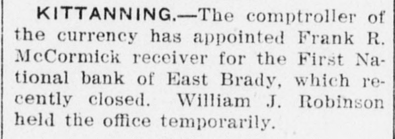 KITTANNING.-The comptroller of the currency has appointed Frank R. McCormick receiver for the First National bank of East Brady, which recently closed. William J. Robinson held the office temporarily.