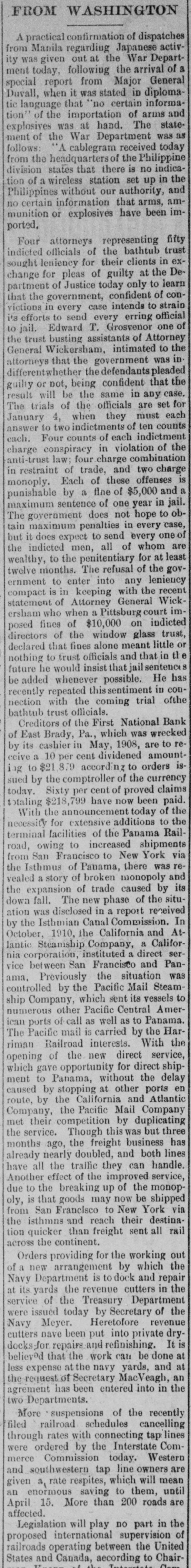 WOM To A practical confirmation of dispatches om Manila regarding Japanese activy was given out at the War Departent today, following the arrival of becial report from Major General Duvall, when it was stated in diplomae language that "no certain informaon" of the importation of arms and xplosives was at hand. The stateent of the War Department was ollows: "A cablegram received today rom the headquartersof the Philippine ivision states that there is no indicaon of a wireless station set up in the hilippines without our authority, and o certain information that arms, nunition or explosives have been im'petro Four attorneys representing fifty adicted officials of the bathtub trust ought leniency for their clients in hange for pleas of guilty at the Deartment of Justice today only to learn hat the government, confident of ictions in every case intends to strain is efforts to send every erring official o jail. Edward T. Grosvenor one of he trust busting assistants of Attorney leneral Wickersham, intimated to the ttorneys that the government was ifferentwhether the defendants pleaded uilty or not, being confident that the esult will be the same in any case. "he trials of the officials are set anuary 4, when they must nswer to two indictments of ten counts ach. Four counts of each indictment harge conspiracy in violation of the nti-trust law; four charge combination n restraint of trade, and two charge nonoply. Each of these offenses unishable by a fine of $5,000 and naximum sentence of one year in jail. The government does not hope to ain maximum penalties in every case, ut it does expect to send every he indicted men, all of whom vealthy, to the penitentiary for at least welve months. The refusal of the gov. rnment to enter into any leniency ompact is in keeping with the recent tatement of Attorney General Wick rsham who when a Pittsburg court imosed fines of $10,000 on indicted lirectors of the window glass trust, leclared that fines alone meant little D u! that put offetals 18n.13 01 Support uture he would insist that jail sentence e added whenever possible. He ecently repeated this sentiment in ection with the coming trial ofthe athtub trust officials. Creditors of the First National Bank f East Brady, Pa., which was wrecked y its cashier in May, 1908, are to cive a 10 per cent dividened amount orders 04 accord 01 20 ued by the comptroller of the currency oday. Sixty per cent of proved claims staling $218,799 have now been paid. With the announcement today of the accessity for extensive additions to the erminal facilities of the Panama Raiload, owing to increased shipments rom San Francisco to New York be Isthmus of Panama, there was ealed a story of broken monopoly and he expansion of trade caused by own fall. The new phase of the sitution was disclosed in a report received y the Isthmian Canal Commission. ctober, 1910, the California and antic Steamship Company, a Califoria corporation, instituted a direct serice between San Francisco and Panma, Previously the situation ontrolled by the Pacific Mail Steamhip Company, which sent its vessels umerous other Pacific Central Amercan ports of call as well as to Panama. he Pacific mail is carried by the Hariman Railroad interests. With the pening of the new direct service, hich gave opportunity for direct shipnent to Panama, without the delay aused by stopping at other ports oute, by the California and Atlantic lompany, the Pacific Mail Company net their competition by duplicating he service. Though this was but three nonths ago, the freight business has Iready nearly doubled, and both lines ave all the traffic they can handle. nother effect of the improved service, ue to the breaking up of the monoply, is that goods may now be shipped rom San Francisco to New York via he isthmns and reach their destinaion quicker than freight sent all cross the continent. Orders providing for the working f a new arrangement by which the Javy Department is to dock and repair